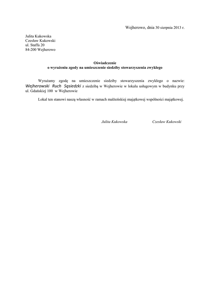 Wejherowo, dnia 30 sierpnia 2013 r. Julita Kukowska Czesław Kukowski ul. Staffa 20 84-200 Wejherowo Oświadczenie o wyrażeniu zgody na umieszczenie siedziby stowarzyszenia zwykłego Wyrażamy zgodę na umieszczenie siedziby stowarzyszenia zwykłego o nazwie: Wejherowski Ruch Sąsiedzki z siedzibą w Wejherowie w lokalu usługowym w budynku przy ul. Gdańskiej 100 w Wejherowie Lokal ten stanowi naszą własność w ramach małżeńskiej majątkowej wspólności majątkowej. Julita Kukowska Czesław Kukowski