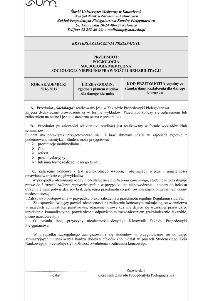 Śląski Uniwersytet Medyczny w Katowicach Wydział Nauk o Zdrowiu w Katowicach Zakład Propedeutyki Pielęgniarstwa Katedry Pielęgniarstwa Ul. Francuska 20/24 40-027 Katowice Tel/fax: 32 252-80-06; e-mail:[email protected] KRYTERIA ZALICZENIA PRZEDMIOTU PRZEDMIOT: SOCJOLOGIA SOCJOLOGIA MEDYCZNA SOCJOLOGIA NIEPEŁNOSPRAWNOŚCI I REHABILITACJI ROK AKADEMICKI 2016/2017 LICZBA GODZIN: zgodna z planem studiów dla danego kierunku KOD PRZEDMIOTU: zgodny ze standardami kształcenia dla danego kierunku A. Przedmiot „Socjologia” realizowany jest w Zakładzie Propedeutyki Pielęgniarstwa. Zajęcia dydaktyczne prowadzone są w formie wykładów. Przedmiot kończy się zaliczeniem lub zaliczeniem na ocenę i jest to ostateczna ocena z przedmiotu. B. Przedmiot (w zależności od kierunku studiów) jest realizowany w formie wykładów i/lub seminariów. Student ma obowiązek przygotowywać się i brać aktywny udział w zajęciach zgodnie z podejmowaną tematyką. Student może przygotować: prezentację multimedialną, film referat, panel dyskusyjny lub inną formę realizacji danego tematu. C. Zaliczenie końcowe - test jednokrotnego wyboru, obejmujący wiedzę i umiejętności omawiane w trakcie zajęć/wykładów. W przypadku otrzymania oceny niedostatecznej z zaliczenia końcowego, studentowi przysługuje prawo do 3 /trzech/ zaliczeń poprawkowych, a w przypadku ich niepowodzenia – student do indeksu otrzymuje wpis potwierdzający brak zaliczenia przedmiotu co jest równoważne z otrzymaniem oceny niedostatecznej /Dalszy tryb postępowania w przypadku braku zaliczenia z przedmiotu reguluje Regulamin studiów/. Za usprawiedliwiający powód nieobecności na zaliczeniu końcowym traktuje się, stawiennictwo w urzędach administracji państwowej, zdarzenie losowe czy nie dające się wcześniej przewidzieć utrudnienia komunikacyjne, potwierdzone odpowiednim zaświadczeniem (zaświadczenie lekarskie, pismo urzędowe itp.). O uznaniu innej przyczyny nieobecności decyduje Kierownik Zakładu Propedeutyki Pielęgniarstwa. W przypadku szczególnego zaangażowania się studentów w przygotowanie się do zajęć seminaryjnych i uzyskiwania bardzo dobrych efektów (np. udział w pracach Studenckiego Koła Naukowego), przewiduje się możliwość zwolnienia z zaliczenia końcowego. .............................................................. / data/ Zatwierdził Kierownik Zakładu Propedeutyki Pielęgniarstwa