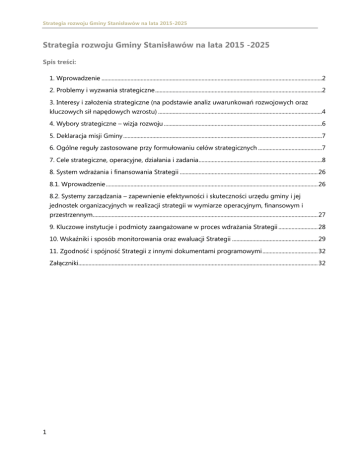 Strategia rozwoju Gminy Stanisławów na lata 2015-2025 Strategia rozwoju Gminy Stanisławów na lata 2015 -2025 Spis treści: 1. Wprowadzenie ........................................................................................................................................................2 2. Problemy i wyzwania strategiczne ...................................................................................................................2 3. Interesy i założenia strategiczne (na podstawie analiz uwarunkowań rozwojowych oraz kluczowych sił napędowych wzrostu) .................................................................................................................4 4. Wybory strategiczne – wizja rozwoju .............................................................................................................6 5. Deklaracja misji Gminy .........................................................................................................................................7 6. Ogólne reguły zastosowane przy formułowaniu celów strategicznych ............................................7 7. Cele strategiczne, operacyjne, działania i zadania .....................................................................................8 8. System wdrażania i finansowania Strategii ............................................................................................... 26 8.1. Wprowadzenie .................................................................................................................................................. 26 8.2. Systemy zarządzania – zapewnienie efektywności i skuteczności urzędu gminy i jej jednostek organizacyjnych w realizacji strategii w wymiarze operacyjnym, finansowym i przestrzennym ........................................................................................................................................................... 27 9. Kluczowe instytucje i podmioty zaangażowane w proces wdrażania Strategii ........................... 28 10. Wskaźniki i sposób monitorowania oraz ewaluacji Strategii ........................................................... 29 11. Zgodność i spójność Strategii z innymi dokumentami programowymi ...................................... 32 Załączniki..................................................................................................................................................................... 32 1 Strategia rozwoju Gminy Stanisławów na lata 2015-2025 1. Wprowadzenie Strategia Rozwoju Gminy Stanisławów została opracowana na okres od 2015 do 2025 roku. Opracowanie składa się dwóch części: Programowej, w której opisano problemy, wyzwania, założenia strategiczne i szanse rozwojowe, a także cele i działania, które należy podjąć, aby zapewnić dynamiczny i zrównoważony rozwój gminy. Załączników zawierających opis istniejącej sytuacji (analiza i diagnoza stanu gminy), oraz obecnych i przyszłych problemów, a także szans rozwojowych (analiza SWOT i scenariusze SWOT/TOWS), opis badania diagnostycznego - konsultacji społecznych przeprowadzonych w formie ankiety w lipcu 2015 r. Ponadto dokument zawiera informacje i zalecenia na temat sposobu wdrażania, monitorowania oraz przyszłej oceny działań realizowanych w ramach poszczególnych celów strategicznych. 2. Problemy i wyzwania strategiczne Diagnoza przeprowadzona na podstawie ankiet i analiz eksperckich wykazała następujące problemy i wyzwania strategiczne: Tabela 1. Najistotniejsze problemy i wyzwania strategiczne Gospodarka Mieszkalnictwo: Problemy/ wyzwania strategiczne - Niska aktywność gospodarcza mieszkańców w 2/3 miejscowości na terenie gminy - Względnie słabe rolnictwo (znaczna część gospodarstw w słabej kondycji), brak grup producenckich pogarszanie się sytuacji ekonomicznej i pozycji konkurencyjnej gospodarstw rolnych w gminie - Brak w pełni uzbrojonych terenów pod działalność produkcyjno-usługową i mieszkaniową w większości rejonów gminy i brak terenów inwestycyjnych we własności Gminy niska atrakcyjność inwestycyjna, negatywny wpływ na inwestycje mieszkaniowe i komercyjne, stymulujący wpływ na migracje - Słaba jakość dróg i dostępność usług transportu zbiorowego dla mieszkańców z niektórych miejscowości negatywny wpływ na mobilność (dojazdy do miejsc pracy, szkół), zwiększanie się prawdopodobieństwa pogłębiania dysproporcji rozwojowych, głownie obszarów położonych przy DK 50 oraz DW 637 względem pozostałych terenów w gminie - Brak atrakcji dla turystów, słabe warunki do obsługi turystów. Ograniczone możliwości znalezienia zatrudnienia na terenie gminy i niedostatek oferty inwestycyjnej mogą stymulować migrację młodych i lepiej wykształconych osób oraz ograniczać osiedlanie się nowych mieszkańców 2 Strategia rozwoju Gminy Stanisławów na lata 2015-2025 Problemy rozwoju gospodarczego mogą zostać wzmocnione przez pogłębiający się kryzys finansów publicznych i przerzucanie długu publicznego na gminy, prowadzenie polityki osłabiania małych gmin wiejskich celem ich konsolidacji w większe JST Społeczeństwo: - Niepewność dotycząca perspektyw rozwojowych dla mieszkańców gminy (szczególnie wśród ludzi młodych), migracja (szczególnie wśród ludzi młodych) ok. 40% respondentów ankiety (a ponad 80% młodych), nisko ocenia perspektywę wiązania przyszłości z gminą przez młode osoby - Niski stopień wykorzystania potencjału organizacji społecznych, ograniczony zakres współpracy gminy z NGO - Słabe relacje sąsiedzkie (deklarowane w części ankiet) - Niski poziom kształcenia w szkołach podstawowych i gimnazjach – wyniki egzaminów gimnazjalnych i sprawdzianów 6-klasistów należą do najgorszych w powiecie zagrożenie przenoszeniem dzieci do szkół w sąsiednich gminach - Względnie słabo oceniana przez mieszkańców oferta zajęć pozalekcyjnych, oferta kulturalna, jako