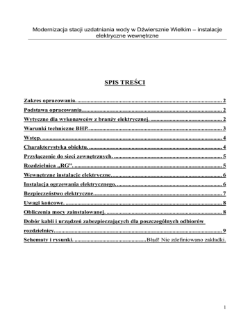 Modernizacja stacji uzdatniania wody w Dźwiersznie Wielkim – instalacje elektryczne wewnętrzne SPIS TREŚCI Zakres opracowania. ................................................................................................... 2 Podstawa opracowania................................................................................................ 2 Wytyczne dla wykonawców z branży elektrycznej. ................................................. 2 Warunki techniczne BHP. ........................................................................................... 3 Wstęp. ........................................................................................................................... 4 Charakterystyka obiektu. ........................................................................................... 4 Przyłączenie do sieci zewnętrznych. .......................................................................... 5 Rozdzielnica „RG”. ..................................................................................................... 5 Wewnętrzne instalacje elektryczne. ........................................................................... 6 Instalacja ogrzewania elektrycznego. ........................................................................ 6 Bezpieczeństwo elektryczne. ....................................................................................... 7 Uwagi końcowe. ........................................................................................................... 8 Obliczenia mocy zainstalowanej. ............................................................................... 8 Dobór kabli i urządzeń zabezpieczających dla poszczególnych odbiorów rozdzielnicy. .................................................................................................................. 9 Schematy i rysunki. ................................................. Błąd! Nie zdefiniowano zakładki. 1 Modernizacja stacji uzdatniania wody w Dźwiersznie Wielkim – instalacje elektryczne wewnętrzne Opis techniczny. Zakres opracowania. Niniejsze opracowanie stanowi projekt techniczny na przebudowę stacji uzdatniania wody w Dźwiersznie Wielkim. Opracowanie obejmuje: Montaż tablic zabezpieczeń, Budowa wewnętrznych instalacji elektroenergetycznych, Rozdzielnica Schematy Dobór główna „RG” elektryczne rozwinięte, środków zapewniających bezpieczeństwo elektryczne, Podstawa opracowania. Projekt opracowano na podstawie: projektów technologicznych, projektów konstrukcji, obowiązujących norm i przepisów, Wytyczne dla wykonawców z branży elektrycznej. Branża elektryczna zainstaluje dodatkowe pole rozdzielni do którego należy doprowadzić kanał instalacyjny oraz szynę PE. 2 Modernizacja stacji uzdatniania wody w Dźwiersznie Wielkim – instalacje elektryczne wewnętrzne Warunki techniczne BHP. 1. Ochrona przed porażeniem elektrycznym, zgodnie z przyjętym na obiekcie układem sieciowym oraz normą PN/E-05009. - po zamontowaniu instalacji ochronnej, - w trakcie eksploatacji instalacji AKPiA, co najmniej raz na rok. 2. Osoby zatrudnione przy eksploatacji oraz wykonujące prace konserwacyjne lub remontowe urządzeń i instalacji elektrycznych AKPiA winny: - być przeszkolone w dziedzinie eksploatacji i konserwacji urządzeń elektrycznych do 1 kV, - znać szczegółowo niniejszy projekt oraz DTR związanych urządzeń, - postępować zgodnie z : • wytycznymi w sprawie zasad organizacji i wykonywania prac przy urządzeniach elektroenergetycznych w zakładach przemysłowych zawartych w Przepisach Eksploatacji Urządzeń Elektroenergetycznych, • instrukcją współpracy w Zakładowej Służby Energetycznej z jednostką Energetyki Zawodowej, 3. Przewody rurowe odprowadzające czynniki w trakcie przedmuchiwania tras dla przepływomierzy i poziomomierzy doprowadzić do miejsc zapewniających bezpieczny i bezpośredni odpływ do ścieków. 4. Prace konserwacyjne i naprawy aparatury regulacyjnej, pomiarowej, sterowniczej i sygnalizacyjnej można wykonać dopiero po: • odcięciu dopływu czynników energetycznych do tej aparatury, • odłączenia napięcia elektroenergetycznego, 5. Urządzenia technologiczne, które znajdują się w pobliżu, a których ruch zagraża bezpieczeństwu wykonania prac przy: montażu, rozruchu konserwacji, naprawie lub remoncie urządzeń i instalacji AKPiA, należy wyłączyć z ruchu. W przypadku niemożności wyłączenia z ruchu ww. urządzeń technologicznych należy zastosować inne środki zabezpieczające, które muszą całkowicie zabezpieczyć zdrowie i życie 3 Modernizacja stacji uzdatniania wody w Dźwiersznie Wielkim – instalacje elektryczne wewnętrzne ludzkie. Wstęp. Stan techniczny istniejącej instalacji elektrycznej nie nadaje się do dalszego wykorzystania po modernizacji stacji uzdatniania wody. Konsekwencją tego jest konieczność wymiany istniejących układów instalacji elektroenergetycznych. Obiekt jest podstawową Stacją Uzdatniani Wody dla omawianej miejscowości. Charakterystyka obiektu. - Moc zapotrzebowana Pi = 75 kW - Zasilanie - istniejąca linia kablowa n/n - Układ sieciowy - TN-C-S - Środki ochrony przeciwporażeniowej - opcjonalnie: izolacja ochronna lub szybkie wyłączanie zasilania zgodnie z PN-IEC60364-41-2000 - Środki ochrony przetężeniowej - bezpieczniki topikowe i samoczynne wyłączniki nadprądowe zgodnie z PN-IEC60364-43:1999 - Środki ochrony przepięciowej - II0 – ochronniki przepięciowe klasy „C” zgodnie z PN-IEC60364-4-444:2001 0 - III – indywidualnie na bazie ochronników klasy „D” przy wybranych urządzeniach odbiorczych np. sterownik - Środki ochrony odgromowej - istniejąca instalacja piorunochronna zgodne z PN-86/E 05003,0.1 4 Modernizacja stacji uzdatniania wody w Dźwiersznie Wielkim – instalacje elektryczne wewnętrzne Przyłączenie do sieci zewnętrznych. Modernizowana stacja uzdatniania wody zasilana będzie z istniejącego przy
