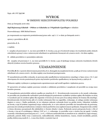 Sygn. akt: I C 737/16 WYROK W IMIENIU RZECZYPOSPOLITEJ POLSKIEJ Dnia 30 listopada 2016 roku Sąd Rejonowy Gdańsk – Północ w Gdańsku w I Wydziale Cywilnym w składzie: Przewodniczący: SSR Michał Sznura po rozpoznaniu na rozprawie protokołowanej przez sekr. sąd. J. J. w dniu 30 listopada 2016 r. sprawy z powództwa B. G. przeciwko J. L. o zapłatę I. zasądza od pozwanej J. L. na rzecz powódki B. G. kwotę 4.131,40 zł (czterech tysięcy stu trzydziestu jeden złotych czterdziestu groszy) wraz z ustawowymi odsetkami za opóźnienie liczonymi od 4 marca 2016 r. do dnia zapłaty; II. oddala powództwo w pozostałym zakresie; III. zasądza od pozwanej J. L. na rzecz powódki B. G. kwotę 1.432 zł (jednego tysiąca czterystu trzydziestu dwóch złotych) tytułem zwrotu kosztów procesu. UZASADNIENIE Powódka B. G. w pozwie skierowanym przeciwko J. L. domagała się zasądzenia kwoty 4.298,40 zł wraz z ustawowymi odsetkami od 4 marca 2016 r. do dnia zapłaty oraz kosztami postępowania. W uzasadnieniu powódka wskazała, że pozwana jako spadkobierca testamentowy zmarłego 11 lipca 2013 r. R. C. jest obowiązana do zwrotu poniesionych przez nią kosztów pochówku spadkodawcy na łączną kwotę 4.298,40 zł. Nakazem zapłaty wydanym w postępowaniu upominawczym sąd orzekł zgodnie z żądaniem pozwu. W sprzeciwie od nakazu zapłaty pozwana wniosła o oddalenie powództwa i zasądzenie od powódki na swoją rzecz kosztów procesu. W uzasadnieniu potwierdziła nabycie spadku po zmarłym R. C.. Kwestionowała roszczenie co do zasady wskazując, że powódka nie przedstawiła rachunków potwierdzających poniesienie wydatków tytułem opłaty dla księdza za mszę w wysokości 300 zł, tytułem opłaty dla organisty w kwocie 50 zł oraz 300 zł na zakup odzieży do trumny dla zmarłego. Kwestionowała również kwotę 380 zł z tytułu wykonania liter na nagrobku, wskazując, że usługa została wykonana dopiero w 2015 r. Nadto podniosła, że we własnym zakresie wykonała krzyż na grobie teścia. Odnośnie wydatku na kwotę 1.059 zł tytułem organizacji stypy wskazywała, że w tym zakresie powódka nie konsultowała się pozwaną, pozwana nie została powiadomiona o miejscu i dacie pochówku oraz zaplanowanym spotkaniu. Zorganizowała u siebie w domu skromny poczęstunek dla żałobników w formie obiadu i ciasta. Podniosła zarzut potrącenia kwoty 1.780 zł z kwotą 1.732,40 zł wynikającą z faktury VAT nr (...), wskazując, że powódka wraz z siostra bez jej zgody i wiedzy wyniosły z mieszkania pozwanej przy ul. (...) w G., w którym zamieszkiwała ze zmarłym m.in. zabytkowy zegar wiszący, poduszki, pościel, łóżko wraz z materacem, radioodbiornik, telefon komórkowy, wazon, wózek inwalidzki, pościel, pralkę elektryczną marki E. (...) oraz dwa fotele o wartości 640 zł. Na rozprawie 30 listopada 2016 r. pozwana oświadczyła, że jest skłonna zapłacić koszty wynikające z faktur za wyjątkiem wykucia liter z potrąceniem kwoty 400 zł z tytułu zorganizowania przez siebie stypy, przy zastosowaniu miarkowania. Sąd ustalił następujący stan faktyczny: Dnia 11 lipca 2012 r. zmarł R. C.. Spadek po zmarłym na podstawie(...) nabyła J. L.. Okoliczności bezsporne , vide: zeznania świadka D. B., k. 55-56; zeznania pozwanej, k. 57; zeznania powódki, k. 56-57; postanowienie Sądu Rejonowego Gdańsk-Północ w Gdańsku z 28 lutego 2014 r., k. 6. Koszty pogrzebu zmarłego R. C. poniosła B. G.. Koszty te obejmowały kwoty: - 1.732,40 zł wynikającą z faktury VAT nr (...) m.in. z tytułu udostępnienia kaplicy, opłaty za ważność grobu, - 460 zł wynikającą z faktury VAT nr (...) z tytułu ustawienia nagrobku, -1.059 zł wynikająca z rachunku nr (...) z tytułu organizacji stypy, - 380 zł wynikającą z faktury VAT nr (...) za wykonanie liter na nagrobku, - 300 zł z tytułu opłaty dla księdza za (...) Ś., - 50 zł dla organisty, - 300 zł z tytułu opłaty za zakup odzieży dla zmarłego do trumny. Dowody : faktury, rachunki, k. 7-11; zeznania świadka D. B., k. 55-56; zeznania powódki, k. 56-57. Koszt samego pogrzebu w wysokości 4.000 zł opłacono z zasiłku pogrzebowego. Okoliczność bezsporna , vide: faktura VAT nr (...), k. 7 . Pismem z 16 grudnia 2015 r. powódka wezwała pozwaną do zapłaty kwoty 4.298,40 zł tytułem zwrotu poniesionych kosztów pogrzebu, jednakże bezskutecznie. Dowód : przedsądowe wezwanie do zapłaty, k. 12-15 . Sąd zważył, co następuje: Sąd ustalił stan faktyczny na podstawie dokumentów prywatnych złożonych przez strony, a opisanych wyżej w stanie faktycznym sprawy, których prawdziwości nie kwestionowała żadna ze stron. Sąd oparł się na zeznaniach świadka oraz stron postępowania w zakresie opisanym powyżej w stanie faktycznym. Zeznania pozwanej w pozostałym zakresie nie wnosiły istotnych informacji z punktu widzenia rozstrzygnięcia sprawy, bądź były niewiarygodne z uwagi na brak ich potwierdzenia w pozostałym materiałem dowodowym w sprawie. W niniejszej sprawie powództwo zasługiwało na częściowe uwzględnienie do kwoty 4.281,40 zł, przy czym z uwagi na błąd matematyczny sądu w wyroku zasądzono sumę 4.131,40 zł. J. L. w toku procesu wskazywała, że co do części wydatków poniesionych przez powódkę poczuwa się do ich zwrotu. Tym niemniej nie zostało uznane żądanie w konkretnej kwocie. W związku z tym sąd przyjął, że brak jest kwoty co do której nie ma sporu między stronami i wyrokował co do poszczególnych wydatków powódki, będących przedmiotem niniejszego postępowania. W sprawie poza sporem była okoliczność nabycia testamentowego spadku po zmarłym R. C. przez pozwaną J. L.. Zgodnie z brzmieniem art. 922 §3 k.c. do długów spadkowych należą koszty pogrzebu spadkodawcy w takim zakresie, w jakim pogrzeb odpowiada zwyczajom, przyjętym w danym środowisku. Stosownie do treści uchwały Sądu Najwyższego z 22 listopada 1988 r., sygn. akt III CZP 86/8