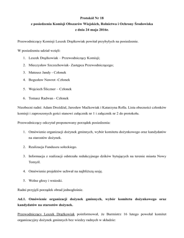 Protokół Nr 18 z posiedzenia Komisji Obszarów Wiejskich, Rolnictwa i Ochrony Środowiska z dnia 24 maja 2016r. Przewodniczący Komisji Leszek Drążkowiak powitał przybyłych na posiedzenie. W posiedzeniu udział wzięli: 1. Leszek Drążkowiak – Przewodniczący Komisji; 2. Mieczysław Szczechowiak- Zastępca Przewodniczącego; 3. Mateusz Jandy - Członek 4. Bogusław Nawrot -Członek 5. Wojciech Śliczner – Członek 6. Tomasz Radwan - Członek Nieobecni radni: Adam Drożdżal, Jarosław Maćkowiak i Katarzyna Rolla. Lista obecności członków komisji i zaproszonych gości stanowi załącznik nr 1 i załącznik nr 2 do protokołu. Przewodniczący odczytał proponowany porządek posiedzenia: 1. Omówienie organizacji dożynek gminnych, wybór komitetu dożynkowego oraz kandydatów na starostów dożynek. 2. Realizacja Funduszu sołeckiego. 3. Informacja z realizacji odstrzału redukcyjnego dzików bytujących na terenie miasta Nowy Tomyśl. 4. Omówienie projektów uchwał na najbliższą sesję. 5. Wolne głosy i wnioski. Radni przyjęli porządek obrad jednogłośnie. Ad.1. Omówienie organizacji dożynek gminnych, wybór komitetu dożynkowego oraz kandydatów na starostów dożynek. Przewodniczący Leszek Drążkowiak poinformował, że Burmistrz 16 lutego powołał komitet organizacyjny dożynek gminnych bez wiedzy radnych w składzie: • przewodniczący – Rajmund Szulc z-ca Prezesa Związku Polskich Plantatorów Chmielu, • z-ca przewodniczącego – Paweł Mordal z-ca Burmistrza Nowego Tomyśla • członkowie: 1. Beata Baran – Dyrektor Nowotomyskiego Ośrodka Kultury, 2. Adrianna Zielińska – Naczelnik Wydziału Komunalnego, Rolnictwa i Ochrony Środowiska, 3. Pozostali członkowie to 18 sołtysów. Przewodniczący wyraził niezadowolenie z faktu, iż nieobecny jest przewodniczący komitetu dożynkowego oraz jego zastępca. Bogusław Nawrot zapytał, czy przewodniczący komitetu dożynkowego otrzymał zaproszenie na komisję. Leszek Drążkowiak odpowiedział, że udał się do Burmistrza z zeszłorocznym zarządzeniem dot. powołania komitetu dożynkowego. Burmistrz zaproponował, aby w bieżącym roku skład komitetu był taki jak w roku poprzednim, po czym po porozumieniu z zastępcą Burmistrza oznajmił, że nic nie wie na temat komitetu dożynkowego, choć z-ca Burmistrza przedstawił listę członków komitetu powołanego 16 lutego podpisaną przez Burmistrza Włodzimierza Hibnera. Bogusław Nawrot był zainteresowany czy przewodniczący Komisji zaprosił na posiedzenie prezydium komitetu – w opinii przewodniczącego Leszka Drążkowiaka zaproszenie gości nie należy do jego obowiązków, ale do pracownika biura Rady Miejskiej. Wśród radnych wywiązała się dyskusja nt. komitetu dożynkowego oraz jego powoływania i składu w poprzednich latach. Łukasz Frański zaproponował, aby przewodniczący komisji dokonał rozeznania odnośnie powoływania komitetu w poprzednich latach oraz wysłał zaproszenia do poszczególnych sołtysów. Mieczysław Szczechowiak wyjaśnił, że zaproszenie sołtysów do współpracy nie będzie łatwym zadaniem, ponieważ sołtysi niechętnie angażują się w organizację dożynek. Radny dodał, że zazwyczaj przewodniczący komisji rolnictwa był przewodniczącym komitetu dożynkowego. Przewodniczący poprosił, aby radni przygotowali na następną komisję propozycje kandydatów na starostów dożynek, należy zaprosić przewodniczącego komitetu. Ad.2. Realizacja Funduszu sołeckiego W kwestii Funduszu sołeckiego wypowiedział się Łukasz Pilarczyk, wyjaśniając, że dotychczas zaksięgowano już faktury na kwotę 22.679,26 zł z 384.522,32 zł. Aktualnie sołectwo Nowa Róża jest jedynym sołectwem, które wykonało wszystkie planowane przedsięwzięcia. Kontynuując Łukasz Pilarczyk nadmienił, że łatwiejsze do realizacji są tzw. zadania miękkie. Piotr Protas – sołtys Sękowa – poinformował, że ma problem z zakupem ciągnika. Łukasz Pilarczyk wyjaśnił, że istnieje możliwość odstąpienia od realizacji przedsięwzięcia z podaniem przyczyny i zmiana na inne przedsięwzięcie. Stefan Schulz – sołtys Grubska – zapytał o termin zakupu gruzu za środki z funduszu sołeckiego – według informacji na ten temat powinien wypowiedzieć się Damian Pyliński z Wydziału Inwestycyjnego. Bogusław Nawrot pytał czy faktury na zakup sprzętu i remonty, mają być wystawiane na gminę czy na sołectwo. Uzyskał odpowiedź, że na gminę. Łukasz Pilarczyk wyjaśnił, że sołtysi do 31 października b.r. mają 2 możliwości: • mogą złożyć wniosek o zmianę przedsięwzięcia • mogą złożyć wniosek o spożytkowanie pieniędzy, które zostały z oszczędności w wyniku zrealizowanych już przedsięwzięć – za przykład podał „Bieg z motylem” w Borui Kościelnej, z którego zostały środki, które mieszkańcy chcą przeznaczyć na inny cel. Łukasz Pilarczyk poinformował, że przygotował wzory w/w wniosków. Mieczysław Szczechowiak był zainteresowany, czy w przypadku zakupu artykułów spożywczych również sporządzana jest notatka odnośnie ofert. Radny wspomniał, że nie chciałby kupować artykułów najtańszych, ponieważ mogą być złej jakości. Radny dodał również, że był przekonany, iż w przypadku zakupu materiałów budowlanych, np. kostki na budowę chodników będzie ogłoszony wspólny przetarg obejmujący poszczególne miejscowości, po czym zasięgnął informacji od naczelnika Damiana Pylińskiego, który wyjaśnił, że każdy chodnik będzie budowany osobno. Na koniec Łukasz Pilarczyk wyjaśnił, w jaki sposób mają być opisywane faktury. Ad.3. Informacja z realizacji odstrzału redukcyjnego dzików bytujących na terenie miasta Nowy Tomyśl. Jerzy Kimstacz – inspektor ds. obronnych, obrony cywilnej i zarządzania kryzysowego – poinformował, że na chwilę obecną są 3 gniazda dzików. Inspektor dodał, że na Glinnie nie można dokonywać odstrza