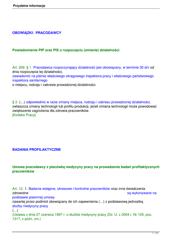 Przydatne informacje OBOWIĄZKI PRACODAWCY Powiadomienie PIP oraz PIS o rozpoczęciu (zmianie) działalności Art. 209. § 1. Pracodawca rozpoczynający działalność jest obowiązany, w terminie 30 dni od dnia rozpoczęcia tej działalności, zawiadomić na piśmie właściwego okręgowego inspektora pracy i właściwego państwowego inspektora sanitarnego o miejscu, rodzaju i zakresie prowadzonej działalności. § 2. (…) odpowiednio w razie zmiany miejsca, rodzaju i zakresu prowadzonej działalności, zwłaszcza zmiany technologii lub profilu produkcji, jeżeli zmiana technologii może powodować zwiększenie zagrożenia dla zdrowia pracowników. [Kodeks Pracy] BADANIA PROFILAKTYCZNE Umowa pracodawcy z placówką medycyny pracy na prowadzenie badań profilaktycznych pracowników Art. 12. 1. Badania wstępne, okresowe i kontrolne pracowników oraz inne świadczenia zdrowotne są wykonywane na podstawie pisemnej umowy zawartej przez podmiot obowiązany do ich zapewnienia (…) z podstawową jednostką służby medycyny pracy (…) (Ustawa z dnia 27 czerwca 1997 r. o służbie medycyny pracy (Dz. U. z 2004 r. Nr 125, poz. 1317, z późn. zm.) 1 / 10 Przydatne informacje Badania wstępne pracowników Art. 229 § 1. Wstępnym badaniom lekarskim podlegają: 1) osoby przyjmowane do pracy, 2) pracownicy młodociani przenoszeni na inne stanowiska pracy i inni pracownicy przenoszeni na stanowiska pracy, na których występują czynniki szkodliwe dla zdrowia lub warunki uciążliwe. [Kodeks Pracy] Badania okresowe pracowników Art. 229 § 2. Pracownik podlega okresowym badaniom lekarskim. [Kodeks Pracy] Badania kontrolne pracowników Art. 229 § 2 (…) W przypadku niezdolności do pracy trwającej dłużej niż 30 dni, spowodowanej chorobą, pracow nik podlega ponadto kontrolnym badaniom lekarskim w celu ustalenia zdolności do wykonywania pracy na dotychczasowym stanowisku. Zakaz dopuszczenia do pracy pracownika nieposiadającego aktualnego orzeczenia lekarskiego Art. 229 § 4. Pracodawca nie może dopuścić do pracy pracownika bez aktualnego orzeczenia lekarskiego stwierdzającego brak przeciwwskazań do pracy na określonym stanowisku. [Kodeks Pracy] 2 / 10 Przydatne informacje SZKOLENIA Art. 237 3 . § 1. Nie wolno dopuścić pracownika do pracy, do której wykonywania nie posiada on wymaganych kwalifikacji lub potrzebnych umiejętności, a także dostatecznej znajomości przepisów oraz zasad bezpieczeństwa i higieny pracy. § 2. Pracodawca jest obowiązany zapewnić przeszkolenie pracownika w zakresie bezpieczeństwa i higieny pracy przed dopuszczeniem go do pracy oraz prowadzenie okresowych szkoleń w tym zakresie. [Kodeks Pracy] § 8. Szkolenie wstępne jest przeprowadzane w formie instruktażu według programów opracowanych dla poszczególnych grup stanowisk i obejmuje: 1) szkolenie wstępne ogólne, zwane dalej "instruktażem ogólnym"; 2) szkolenie wstępne na stanowisku pracy, zwane dalej "instruktażem stanowiskowym". § 10. 1. Instruktaż ogólny odbywają, przed dopuszczeniem do wykonywania pracy, nowo zatrudnieni pracownicy (…). 2. Instruktaż ogólny prowadzi pracownik służby bezpieczeństwa i higieny pracy lub osoba wykonująca u pracodawcy zadania tej służby albo pracodawca, który sam wykonuje takie zadania, lub pracownik wyznaczony przez pracodawcę posiadający zasób wiedzy i umiejętności (…) mający aktualne zaświadczenie o ukończeniu wymaganego szkolenia w dziedzinie bezpieczeństwa i higieny pracy. 5. Instruktaż stanowiskowy przeprowadza wyznaczona przez pracodawcę osoba kierująca pracownikami lub pracodawca, jeżeli osoby te (…) są przeszkolone w zakresie metod prowadzenia instruktażu stanowiskowego. Szkolenia okresowe dla pracowników § 15. 1. (…) na stanowiskach robotniczych (…) nie rzadziej niż raz na 3 lata, a na stanowiskach (…) na których 3 / 10 Przydatne informacje (…) są wykonywane prace szczególnie niebezpieczne, nie rzadziej niż raz w roku. 2. (…)administracyjno-biurowych nie rzadziej niż raz na 6 lat (…) (…) pozostałych (...) nie rzadziej niż raz na 5 lat § 4. 1. Szkolenie może być (…) prowadzone (…) na (…) zlecenie [pracodawców], przez jednostki organizacyjne uprawnione do prowadzenia działalności szkoleniowej (…) Pierwsze szkolenie okresowe § 15. 4. (…) osoby będące pracodawcami oraz inne osoby kierujące pracownikami, w szczególności kierownicy, mistrzowie i brygadziści (…) w okresie do 6 miesięcy od rozpoczęcia pracy (…) (…) pozostałe osoby (…) do 12 miesięcy od rozpoczęcia pracy (…) Szkolenie pracowników w udzielaniu pierwszej pomocy przedlekarskiej Art. 209 1 . § 1. Pracodawca jest obowiązany: 1) zapewnić środki niezbędne do udzielania pierwszej pomocy w nagłych wypadkach, gaszenia pożaru zwalczania pożarów i ewakuacji pracowników, 2) wyznaczyć pracowników do (…) udzielania pierwszej pomocy [Kodeks Pracy] Służba BHP Art. 237 11 § 1. (…) pracodawca zatrudniający do 100 pracowników-w przypadku braku kompetentnych pracowników [technik BHP, osoba posiadająca wyższe wykształcenie w zakresie BHP albo studia podyplomowe w tym zakresie]może powierzyć wykonywanie zadań służby bhp specjalistom spoza zakładu pracy. [Kodeks Pracy] 4 / 10 Przydatne informacje REGULAMINY Regulamin pracy Art. 104. § 2. Regulaminu pracy nie wprowadza się, jeżeli w zakresie przewidzianym w § 1 obowiązują postanowienia układu zbiorowego pracy lub gdy pracodawca zatrudnia mniej niż 20 pracowników. [Kodeks Pracy] Regulamin wynagradzania Art. 77 2 . § 1. Pracodawca zatrudniający co najmniej 20 pracowników, nie objętych zakładowym układem zbiorowym pracy ani ponadzakładowym układem zbiorowym pracy (…), ustala warunki wynagradzania za pracę w regulaminie wynagradzania. [Kodeks Pracy] Opracowanie i udostępnianie pracownikom treści przepisów dot. równego traktowania w zatrudnieniu i zapobiegania dyskryminacji Art. 94. Pracodawca jest obowiązany w szczeg