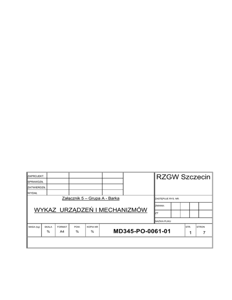 RZGW Szczecin ZAPROJEKT. SPRAWDZIŁ ZATWIERDZIŁ WYDAŁ Załącznik 5 – Grupa A - Barka WYKAZ URZĄDZEŃ I MECHANIZMÓW ZASTĘPUJE RYS. NR: ZMIANA: ZT NAZWA PLIKU MASA (kg) SKALA FORMAT POW. KOPIA NR % A4 % % STR. MD345-PO-0061-01 1 STRON 7 RZGW Szczecin ZAŁĄCZNIK 5 – Grupa A - Barka WYKAZ URZĄDZEŃ I MECHANIZMÓW Str. MD 345 – PO 0061-01 2/ 7 Lp. Nazwa urządzenia Jedn Ilość Parametry Uwagi 1 2 3 4 5 6 SPIS TREŚCI Strona 1 KADŁUB…………............................................... ......................................... 3 2 WYPOSAŻEN IE POKŁADOWE ……………………..……………………… 3 3 WYPOSAŻENIE POMIESZCZEŃ ................................................................ 4 4 WYPOSAŻENIE POMIESZCZENIA MASZYNOWEGO....................... ....... 5 5 WYPOSAŻENIE ELEKTRYCZNE ................................................................ 6 RZGW Szczecin ZAŁĄCZNIK 5 – Grupa A - Barka WYKAZ URZĄDZEŃ I MECHANIZMÓW Str. MD 345 – PO 0061-01 3/ 7 Lp. Nazwa urządzenia Jedn Ilość Parametry Uwagi 1 2 3 4 5 6 1. KADŁUB 1 2 Stal okrętowa - blachy Stal okrętowa – profile kpl kpl kg kg 22000 3200 Netto Netto 2. WYPOSAŻENIE POKŁADOWE 1 Winda kotwiczna Szt. 1 - napęd elektryczny 230V, 50Hz - koło orzechowe - awaryjny ręczny napęd - sterowanie lokalne - stoper wbudowany 3 Łańcuch kotwiczny kpl - łańcucha kotwiczny 40m kal. 12,5mm K2 - przęsło końcowe - łącznik Kentera - szakla końcowa 4 Zwalniak łańcucha kotwicznego Szt. 1 5 Kotwica Szt. 1 - kotwica Halla z krętlikiem przykotwicznym – masa .200kg (dla kotwicy patentowej masa odpowiednio mniejsza) 6 Urządzenie cumownicze Kpl 7 Urządzenie sprzęgające kpl - 2 pachoły podwójne dziobowe - 4 pachoły podwójne na pokładzie - 2 pachoły podwójne na rufie - lina cumownicza polipropylenowa 40m, 30mm – 1szt - lina cumownicza polipropylenowa 20m – 3szt - wciągarka ręczna liny stalowej - 2szt w komplecie z liną stalową 26mm, 40m -2szt 1 1 - kluzy wbudowane w pawęż rufową i dziobową – 4szt - pachoły pojedyncze – 3szt 8 Odbojnice kpl 1 - profil gumowy trapezowy 100mm - profil gumowy kwadratowy 250mm 9 Pokrywy luków dostępu do przestrzeni podpokładowej kpl 1 - pomieszczenie maszynowni 750x500 - pomieszczenie ładowni magazynowej 400x500 - pomieszczenia skrajników 500x500 - wpuszczane w pokład - wspomaganie siłownikiem gazowym - blokada w stanie RZGW Szczecin ZAŁĄCZNIK 5 – Grupa A - Barka WYKAZ URZĄDZEŃ I MECHANIZMÓW Str. MD 345 – PO 0061-01 4/ 7 Lp. Nazwa urządzenia Jedn Ilość Parametry Uwagi 1 2 3 4 5 6 otwartym - uszczelnienie gumowe 10 Urządzenie ratunkowe kpl 1 zgodnie z przepisami obowiązującymi dla statków uprawiających żeglugę na śródlądowych drogach wodnych w Polsce 11 Włazy Kpl 1 12 Dźwig pokładowy Kpl 1 - właz do pomieszczenia skrajnika dziobowego wpuszczany z pokrywą przykręcaną śrubami - elektro-hydrauliczny dźwig pokładowy z wysięgnikiem teleskopowym o udźwigu min 5 ton i maksymalnym wysięgu ok 9,5m - stały pulpit sterujący - przenośny pulpit zdalnego sterowania radiem - alarm przeciążeniowy i ogranicznik momentu obciążenia - hak i komplet zawiesi linowych - chwytak rolniczo-leśny - chwytak dwułupinowy 250 litrów - chwytak wielołupinowy 250 litrów 13 Maszt świateł nawigacyjnych Szt. 1 14 Maszt naświetlacza Szt. 1 15 16 Światła nawigacyjne Wygrodzenie rejonu ładunkowego Kpl Kpl 1 1 - demontowany maszt świateł nawigacyjnych montowany na dziobie w PS Mocowany do pokładu śrubami, odkładany - zgodnie z przepisami żeglugowymi Bale z drewna twardego (impregnowane) - 80x200x3000 – 24 szt - 80x200x3500 – 8 szt Wsporniki stalowe ocynkowane - wsporniki boczne – 4 szt - wsporniki narożne – 4 szt 3. Wyposażenie pomieszczeń 1 Materiały izolacyjne Kpl 2 3 Czajnik elektryczny Farby Szt. 1 Kpl Wełna mineralna pokryta folią aluminiową podstawowy zestaw naprawczy w ZAŁĄCZNIK 5 – Grupa A - Barka WYKAZ URZĄDZEŃ I MECHANIZMÓW RZGW Szczecin Str. MD 345 – PO 0061-01 5/ 7 Lp. Nazwa urządzenia Jedn Ilość Parametry Uwagi 1 2 3 4 5 6 zakresie wszystkich kolorów stosowanych na statku i składników wymaganych w technologii malowania 4. Wyposażenie pomieszczenia maszynowego 1 Zespół prądotwórczy Kpl. 1 - moc . 25 kW, obroty 3000 obr./min., 3x400 V, 50 Hz, diesel, chłodzony cieczą, czterosuwowy, doładowany, - silnik i prądnica na wspólnej ramie, mocowanie elastyczne, w skrzyni dźwiękochłonnej, - chłodzenie typu keel cooling, - układ zdalnego sterowania, - układ alarmowy 2 Kompensator wylotu spalin Szt. 1 DN50 Dostawa z ZP 3 Tłumik z łapaczem iskier dla ZP Szt. 1 min. 35 dB(A), DN65 Dostawa z ZP 4 Łączniki elastyczne silnika ZP Kpl. 1 - dla paliwa, 2 szt. Dostawa z ZP 5 Kompensatory dla kanałów spalin ZP Szt. 3 - metalowe, faliste, DN65 - przystosowane do gazów spalinowych o temperaturze do 600°C 6 Izolacja kanałów spalin Kpl. 1 - prefabrykowane połówki rur, wełna mineralna wewnątrz, włóknina metalizowana na zewnątrz, - dla wody chłodzącej, 2 szt. - DN65 – 4 m, - DN125 – 1 m (dla tłumika). 7 Chłodnica czynnika chłodzącego ZP Szt. 1 - do zamontowania w dnie zewnętrznym statku (box cooler), - parametry: wg wymagań producenta ZP 8 Zbiornik paliwa Szt. 1 - pojemność 200 l, stalowy, - wyposażony w płynowskaz, 9 Zbiornik wody zęzowej Szt. 1 - pojemność min.500L, stalowy, wyposażony w plynowskaz 10 Agregat hydrauliczny do napędu żurawia Kpl. 1 - moc: min. 18 kW, ZAŁĄCZNIK 5 – Grupa A - Barka WYKAZ URZĄDZEŃ I MECHANIZMÓW RZGW Szczecin Str. MD 345 – PO 0061-01 6/ 7 Lp. Nazwa urządzenia Jedn Ilość Parametry Uwagi 1 2 3 4 5 6 pokładowego - zasilanie: 3x400 V, 50 Hz, - wyposażony w zbiornik oleju hydraulicznego, - chłodzenie oleju: powietrzne 11 Głowice odpowietrzające kpl. 1 DN80 – 4szt DN50 – 1szt 12 13 14 15 Przenośny sprzęt gaśniczy Wentylator nawiewowy dla siłowni Głowice wentylacyjne Kpl. 1 Szt. 2 Nawiewowo-wyciągo