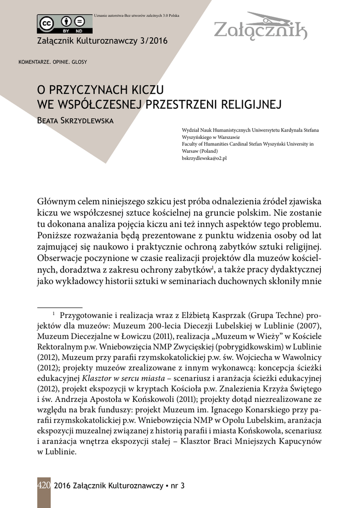 Uznanie autorstwa-Bez utworów zależnych 3.0 Polska Załącznik Załącznik Kulturoznawczy 3/2016 KOMENTARZE. OPINIE. GLOSY O PRZYCZYNACH KICZU WE WSPÓŁCZESNEJ PRZESTRZENI RELIGIJNEJ Beata Skrzydlewska Wydział Nauk Humanistycznych Uniwersytetu Kardynała Stefana Wyszyńskiego w Warszawie Faculty of Humanities Cardinal Stefan Wyszyński University in Warsaw (Poland) [email protected] Głównym celem niniejszego szkicu jest próba odnalezienia źródeł zjawiska kiczu we współczesnej sztuce kościelnej na gruncie polskim. Nie zostanie tu dokonana analiza pojęcia kiczu ani też innych aspektów tego problemu. Poniższe rozważania będą prezentowane z punktu widzenia osoby od lat zajmującej się naukowo i praktycznie ochroną zabytków sztuki religijnej. Obserwacje poczynione w czasie realizacji projektów dla muzeów kościelnych, doradztwa z zakresu ochrony zabytków1, a także pracy dydaktycznej jako wykładowcy historii sztuki w seminariach duchownych skłoniły mnie Przygotowanie i realizacja wraz z Elżbietą Kasprzak (Grupa Techne) projektów dla muzeów: Muzeum 200-lecia Diecezji Lubelskiej w Lublinie (2007), Muzeum Diecezjalne w Łowiczu (2011), realizacja „Muzeum w Wieży” w Kościele Rektoralnym p.w. Wniebowzięcia NMP Zwycięskiej (pobrygidkowskim) w Lublinie (2012), Muzeum przy parafii rzymskokatolickiej p.w. św. Wojciecha w Wawolnicy (2012); projekty muzeów zrealizowane z innym wykonawcą: koncepcja ścieżki edukacyjnej Klasztor w sercu miasta – scenariusz i aranżacja ścieżki edukacyjnej (2012), projekt ekspozycji w kryptach Kościoła p.w. Znalezienia Krzyża Świętego i św. Andrzeja Apostoła w Końskowoli (2011); projekty dotąd niezrealizowane ze względu na brak funduszy: projekt Muzeum im. Ignacego Konarskiego przy parafii rzymskokatolickiej p.w. Wniebowzięcia NMP w Opolu Lubelskim, aranżacja ekspozycji muzealnej związanej z historią parafii i miasta Końskowola, scenariusz i aranżacja wnętrza ekspozycji stałej – Klasztor Braci Mniejszych Kapucynów w Lublinie. 1 420 2016 Załącznik Kulturoznawczy ▪ nr 3 O przyczynach kiczu we współczesnej przestrzeni religijnej do refleksji nad poziomem polskiej sztuki sakralnej oraz jej znaczeniem dla odbioru przesłania, jakie niesie Kościół. Działalność w obszarze ochrony zabytków sztuki religijnej stawia pracowników uczestniczących w procesie zagospodarowywania przestrzeni kościelnej przed pewnymi problemami. Niejednokrotnie osoby te zadają sobie pytania o przyczynę zaistnienia i rozpowszechniania kiczu w przestrzeni kościelnej. Dlaczego, pomimo niezwykle bogatej tradycji Kościoła rzymskokatolickiego w zakresie budownictwa, gromadzenia dzieł sztuki i tworzenia ekspozycji, w przestrzeniach kościołów możemy odnaleźć tak wiele kiczu? Co więcej – dlaczego wspaniałe dzieła sztuki stanowiące niedościgły wzór dla współczesnych artystów, wzbudzające zachwyt od wielu pokoleń, stanowią nieraz tylko tło dla przedmiotów, które nie przedstawiają sobą żadnej wartości artystycznej? Coraz częściej kościoły i sanktuaria są zapełniane obiektami, które choć pretendują do miana dzieł sztuki, nie posiadają należytej wartości estetycznej. Wykonane są niefachowo od strony technicznej, natomiast ich przekaz religijny jest banalny, ckliwy i – co najgorsze – bywa fałszywy, ponieważ spłyca i deformuje prawdy wiary. Jak to się dzieje, że tego typu wytwory zajmują przestrzeń sakralną? Czy dla chęci pozyskania wiernych próbuje się schlebiać popularnym gustom? A może nabywcę kusi dostępność lub relatywnie niska cena? Problem jest wieloaspektowy, trudno o udzielenie zwięzłej i jednoznacznej odpowiedzi na powyższe pytania. O ile obcowanie z wielką czy przynajmniej dobrą sztuką wymaga od zwykłego adresata pewnej znajomości kultury artystycznej, o tyle od kapłanów, którzy są opiekunami kościołów, a niejednokrotnie inwestorami i mecenasami, powinno się wymagać gruntownego wykształcenia w dziedzinie historii sztuki, choćby po to, aby przestrzeń kościoła nie była miejscem gromadzenia sztuki słabej czy właśnie kiczowatej. Nie poddaję analizie konkretnych obiektów, bezwartościowych wytworów sztuki plastycznej czy nietrafionych obiektów architektury sakralnej, ale podejmuję próbę wyjaśnienia przyczyn obecności kiczu we współczesnej przestrzeni kościelnej, bazując na przykładach działań będących efektem decyzji konkretnych osób lub instytucji. Problematyka ta jest bardzo szeroka, nie rozwijam więc zagadnienia kryzysu w sztuce – w tym sztuce kościelnej i religijnej – mającego swoje Załącznik ▪ www.zalacznik.uksw.edu.pl 421 Beata Skrzydlewska podłoże ideowe w pewnych nurtach filozoficznych (np. postmodernizmie czy wszelkich koncepcjach instrumentalizujących sztukę i sprowadzających ją do celów ideologicznych i utopijnych) czy teologicznych. Zjawisko to, choć wpłynęło na postrzeganie dzieł sztuki, leży jednak przede wszystkim w polu badań filozofów kultury2. Pozwolę sobie jednak nadmienić, że rezultatem kryzysu jest nie tylko uczynienie ze sztuki pola eksperymentów, ale także poddanie twórczości artystycznej działaniu różnych ideologii, które ostatecznie uniemożliwiają osiągnięcie przez nią właściwego celu, to jest katharsis. Innymi słowy, konsekwencją kryzysu sztuki zdaje się odejście od kategorii prawdy, dobra i piękna. Odejściu temu towarzyszy niestety również łamanie pewnych reguł obecnych do tej pory w sztuce, ale przede wszystkim ucieczka sztuki od jej właściwego celu, jakim jest doskonalenie osoby ludzkiej. Kicz trafia też do sztuki religijnej i sakralnej. Ważne w tym kontekście staje się właśnie odnalezienie odpowiedzi na pytanie, gdzie leżą przyczyny tego stanu rzeczy. Można wymienić tu wiele źródeł, między innymi brak należytego wykształcenia kleru, nieznajomość prawa oraz nieliczenie się ze wskazaniami Kościoła rzymskokatolickiego 