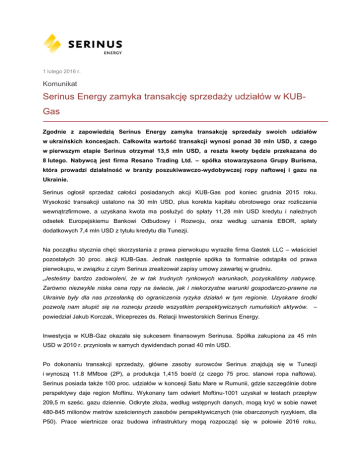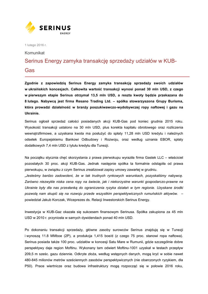1 lutego 2016 r. Komunikat Serinus Energy zamyka transakcję sprzedaży udziałów w KUBGas Zgodnie z zapowiedzią Serinus Energy zamyka transakcję sprzedaży swoich udziałów w ukraińskich koncesjach. Całkowita wartość transakcji wynosi ponad 30 mln USD, z czego w pierwszym etapie Serinus otrzymał 13,5 mln USD, a reszta kwoty będzie przekazana do 8 lutego. Nabywcą jest firma Resano Trading Ltd. – spółka stowarzyszona Grupy Burisma, która prowadzi działalność w branży poszukiwawczo-wydobywczej ropy naftowej i gazu na Ukrainie. Serinus ogłosił sprzedaż całości posiadanych akcji KUB-Gas pod koniec grudnia 2015 roku. Wysokość transakcji ustalono na 30 mln USD, plus korekta kapitału obrotowego oraz rozliczenia wewnątrzfirmowe, a uzyskana kwota ma posłużyć do spłaty 11,28 mln USD kredytu i należnych odsetek Europejskiemu Bankowi Odbudowy i Rozwoju, oraz według uznania EBOR, spłaty dodatkowych 7,4 mln USD z tytułu kredytu dla Tunezji. Na początku stycznia chęć skorzystania z prawa pierwokupu wyraziła firma Gastek LLC – właściciel pozostałych 30 proc. akcji KUB-Gas. Jednak następnie spółka ta formalnie odstąpiła od prawa pierwokupu, w związku z czym Serinus zrealizował zapisy umowy zawartej w grudniu. „Jesteśmy bardzo zadowoleni, że w tak trudnych rynkowych warunkach, pozyskaliśmy nabywcę. Zarówno niezwykle niska cena ropy na świecie, jak i niekorzystne warunki gospodarczo-prawne na Ukrainie były dla nas przesłanką do ograniczenia ryzyka działań w tym regionie. Uzyskane środki pozwolą nam skupić się na rozwoju przede wszystkim perspektywicznych rumuńskich aktywów. – powiedział Jakub Korczak, Wiceprezes ds. Relacji Inwestorskich Serinus Energy. Inwestycja w KUB-Gaz okazała się sukcesem finansowym Serinusa. Spółka zakupiona za 45 mln USD w 2010 r. przyniosła w samych dywidendach ponad 40 mln USD. Po dokonaniu transakcji sprzedaży, główne zasoby surowców Serinus znajdują się w Tunezji i wynoszą 11.8 MMboe (2P), a produkcja 1,415 boe/d (z czego 75 proc. stanowi ropa naftowa). Serinus posiada także 100 proc. udziałów w koncesji Satu Mare w Rumunii, gdzie szczególnie dobre perspektywy daje region Moftinu. Wykonany tam odwiert Moftinu-1001 uzyskał w testach przepływ 209,5 m sześc. gazu dziennie. Odkryte złoża, według wstępnych danych, mogą kryć w sobie nawet 480-845 milionów metrów sześciennych zasobów perspektywicznych (nie obarczonych ryzykiem, dla P50). Prace wiertnicze oraz budowa infrastruktury mogą rozpocząć się w połowie 2016 roku, a produkcja na skalę komercyjną z początkiem 2017 roku. Koszt wykonania dodatkowych trzech odwiertów oraz infrastruktury to ok. 16 mln USD. Zarząd szuka możliwości uruchomienia produkcji we wcześniejszym terminie przy niższych nakładach. Biorąc pod uwagę sukces Moftinu Spółka zajmuje się również rozszerzaniem portfolio potencjalnych celów w ramach koncesji. Na podstawie starszych danych sejsmicznych 2D oraz istniejących odwiertów Zarząd zidentyfikował ponad 25 potencjalnych celów.