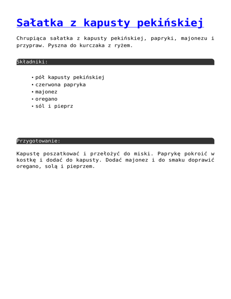Sałatka z kapusty pekińskiej Chrupiąca sałatka z kapusty pekińskiej, papryki, majonezu i przypraw. Pyszna do kurczaka z ryżem. Składniki: pół kapusty pekińskiej czerwona papryka majonez oregano sól i pieprz Przygotowanie: Kapustę poszatkować i przełożyć do miski. Paprykę pokroić w kostkę i dodać do kapusty. Dodać majonez i do smaku doprawić oregano, solą i pieprzem.