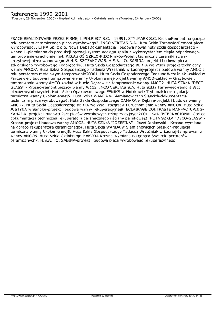 Referencje 1999-2001 (Tuesday, 29 November 2005) - Napisał Administrator - Ostatnia zmiana (Tuesday, 24 January 2006) PRACE REALIZOWANE PRZEZ FIRMĘ POLPIEC" S.C. 19991. STYLMARK S.C. KrosnoRemont na gorąco rekuperatora ceramicznego pieca wyrobowego2. INCO VERITAS S.A. Huta Szkła TarnowiecRemont pieca wyrobowego3. ETNA Sp. z o.o. Nowa DębaDokumentacja i budowa nowej huty szkła gospodarczego wanna U-płomienna do produkcji ręcznej-system odciągu spalin z wykorzystaniem ciepła odpadowegotamprowanie-uruchomienie4. P.B.A.i OŚ SZKŁO-PIEC KrakówProjekt techniczny ceramiki ściany szczytowej pieca wannowego W H.S. SZCZAKOWA5. H.S.A. i O. SABINA-projekt i budowa pieca szklarskiego wyrobowego i odprężarki6. Huta Szkła Gospodarczego BERTA we Wsoli-projekt techniczny wanny AMCO7. Huta Szkła Gospodarczego Tadeusz Wrześniak w Ładnej-projekt i budowa wanny AMCO z rekuperatorem metalowym-tamprowanie20001. Huta Szkła Gospodarczego Tadeusz Wrześniak -zakład w Parczewie : budowa i tamprowanie wanny U-płomiennej-projekt wanny AMCO-zakład w Grzybowie : tamprowanie wanny AMCO-zakład w Hucie Dąbrowie : tamprowanie wanny AMCO2. HUTA SZKŁA "DECOGLASS" - Krosno-remont bieżący wanny W113. INCO VERITAS S.A. Huta Szkła Tarnowiec-remont 3szt pieców wyrobowych4. Huta Szkła Opakowaniowego FENIKS w Piotrkowie Trybunalskim-regulacja termiczna wanny U-płomiennej5. Huta Szkła WANDA w Siemianowicach Śląskich-dokumentacja techniczna pieca wyrobowego6. Huta Szkła Gospodarczego DAMARA w Dębnie-projekt i budowa wanny AMCO7. Huta Szkła Gospodarczego BERTA we Wsoli-rozgrzew i uruchomienie wanny AMCO8. Huta Szkła JUSTYNA w Sanoku-projekt i budowa wanny rekuperacyjnej9. ECLAIRAGE CONTRASTE MANFACTURINGKANADA- projekt i budowa 2szt pieców wyrobowych rekuperacyjnych20011.K&K INTERNACIONAL Gorlicedokumentacja techniczna rekuperatora ceramicznego i ściany palnikowej2. HUTA SZKŁA "DECO-GLASS" Krosno-projekt i budowa wanny AMCO3. HUTA SZKŁA "JÓZEFINA" - Józef Jankowski - Krosno-wymiana na gorąco rekuperatora ceramicznego4. Huta Szkła WANDA w Siemianowicach Śląskich-regulacja termiczna wanny U-płomiennej5. Huta Szkła Gospodarczego Tadeusz Wrześniak w Ładnej-tamprowanie wanny AMCO6. Huta Szkła Ozdobnego MAKORA Krosno-wymiana na gorąco 3szt rekuperatorów ceramicznych7. H.S.A. i O. SABINA-projekt i budowa pieca wyrobowego rekuperacyjnego http://www.polpiec.pl - POLPIEC Powered by Mambo Utworzono: 8 March, 2017, 14:25