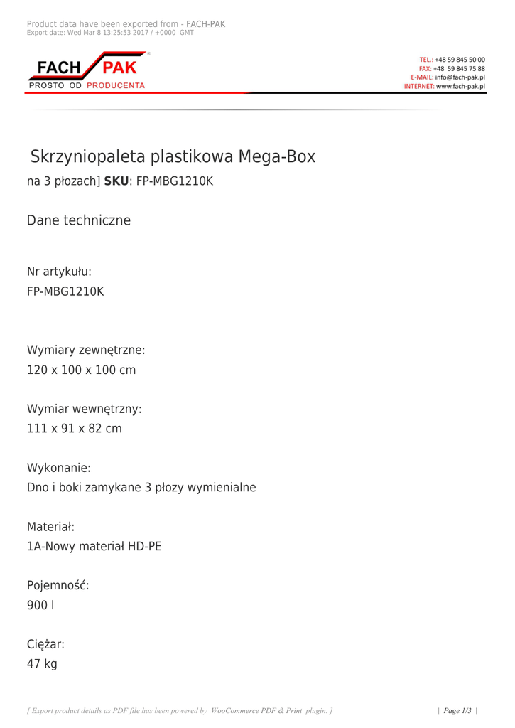 Product data have been exported from - FACH-PAK Export date: Wed Mar 8 13:25:53 2017 / +0000 GMT Skrzyniopaleta plastikowa Mega-Box na 3 płozach] SKU: FP-MBG1210K Dane techniczne Nr artykułu: FP-MBG1210K Wymiary zewnętrzne: 120 x 100 x 100 cm Wymiar wewnętrzny: 111 x 91 x 82 cm Wykonanie: Dno i boki zamykane 3 płozy wymienialne Materiał: 1A-Nowy materiał HD-PE Pojemność: 900 l Ciężar: 47 kg [ Export product details as PDF file has been powered by WooCommerce PDF & Print plugin. ] | Page 1/3 | Product data have been exported from - FACH-PAK Export date: Wed Mar 8 13:25:53 2017 / +0000 GMT Kolor: srebrno-szary lub ciemno-zielony Cena hurtowa (od 3 sztuk): 700 zł Cena detaliczna (od 1-2 sztuk ): 790 zł Opis produktu Skrzyniopalety plastikowe zostały wykonane z solidnego tworzywa odpornego na zarysowania. Gładkie ścianki wewnętrzne i zewnętrzne zapewniają bezproblemowe czyszczenie. Znormalizowane wymiary (Euro 1.200 x 800 mm lub ISO 1.200 x 1.000 mm) gwarantują płynność procesów roboczych w magazynowaniu i transporcie. - Formaty ISO i EURO - Dopuszczone do bezpośredniego kontaktu z żywnością Dostępne do wyboru na 4 stopach, 3 płozach lub kółkach - Płozy i stopy wymienialne - W opcji także pokrywy oraz zawory spustowe - Możliwość sztaplowania - Do 4 ton obciążenia statycznego - Do 500 kg obciążenia dynamicznego - Możliwość kolorów specjalnych oraz indywidualnego nadruku UWAGA! W przypadku skrzyniopalety na 4 kółkach jej ładowność zostaje zmniejszona tylko do 300 kg. [ Export product details as PDF file has been powered by WooCommerce PDF & Print plugin. ] | Page 2/3 | Product data have been exported from - FACH-PAK Export date: Wed Mar 8 13:25:53 2017 / +0000 GMT Product Attributes - Kolor:: srebrno-szary, ciemno-zielony [ Export product details as PDF file has been powered by WooCommerce PDF & Print plugin. ] | Page 3/3 |