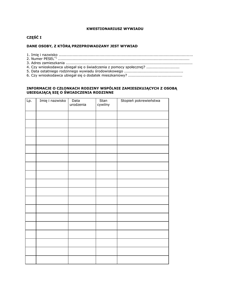 KWESTIONARIUSZ WYWIADU CZĘŚĆ I DANE OSOBY, Z KTÓRĄ PRZEPROWADZANY JEST WYWIAD 1. 2. 3. 4. 5. 6. Imię i nazwisko ............................................................................................................. Numer PESEL*) ........................................................................................................... Adres zamieszkania ....................................................................................................... Czy wnioskodawca ubiegał się o świadczenia z pomocy społecznej? ........................... Data ostatniego rodzinnego wywiadu środowiskowego ................................................ Czy wnioskodawca ubiegał się o dodatek mieszkaniowy? ............................................ INFORMACJE O CZŁONKACH RODZINY WSPÓLNIE ZAMIESZKUJĄCYCH Z OSOBĄ UBIEGAJĄCĄ SIĘ O ŚWIADCZENIA RODZINNE Lp. Imię i nazwisko Data urodzenia Stan cywilny Stopień pokrewieństwa _______________________________ *) W przypadku gdy nie nadano numeru PESEL należy podać serię i numer dokumentu potwierdzającego tożsamość. CZĘŚĆ II WYWIAD Z OSOBĄ, KTÓRA UBIEGA SIĘ O ŚWIADCZENIA RODZINNE 1. Czy z Panią/Panem i z dziećmi w jednym mieszkaniu zamieszkuje ojciec/matka dzieci (powody wspólnego zamieszkiwania)? ................................................................................................................... 2. Czy Pani/Pan prowadzi wspólne gospodarstwo domowe z matką/ojcem dziecka? ............................. 3. Czy drugi z rodziców łoży na utrzymanie dzieci? Proszę podać w jakim zakresie ............................... 4. Czy Pani/Pan wystąpiła/wystąpił o zasądzenie alimentów (czy są płacone, jeżeli nie, czy wystąpiła Pani/Pan z wnioskiem o ich egzekucję i ściganie osoby uchylającej się od płacenia)? ........................... ............................................................................................................................................... .................... 5. Proszę określić formy uczestnictwa ojca/matki dziecka w procesie jego edukacji, opieki codziennej, organizacji wspólnych wyjazdów wakacyjnych, wspólnego spędzania świąt ........................................... ............................................................................................................................................... .................... (podpis osoby ubiegającej się o świadczenia rodzinne) CZĘŚĆ III WYWIAD Z NAJBLIŻSZYMI SĄSIADAMI, WYCHOWAWCAMI, OPIEKUNAMI LUB NAUCZYCIELAMI DZIECKA ORAZ INNYMI OSOBAMI, KTÓRE MOGĄ POSIADAĆ NIEZBĘDNE INFORMACJE O RODZINIE ............................................................................................................................................... .................... ............................................................................................................................................... .................... ............................................................................................................................................... .................... ............................................................................................................................................... .................... ............................................................................................................................................... .................... ............................................................................................................................................... .................... ............................................................................................................................................... .................... ............................................................................................................................................... .................... ............................................................................................................................................... .................... ............................................................................................................................................... .................... ............................................................................................................................................... .................... ............................................................................................................................................... .................... ............................................................................................................................................... .................... .................................... ..................... (podpis osoby, z którą przeprowadzono wywiad) CZĘŚĆ IV OCENA SYTUACJI RODZINY - UWAGI I WNIOSKI OSOBY PRZEPROWADZAJĄCEJ WYWIAD ............................................................................................................................................... ........ ............................................................................................................................................... ........ ............................................................................................................................................... ........ ............................................................................................................................................... ........ ............................................................................................................................................... ........ ............................................................................................................................................... ........ ............................................................................................