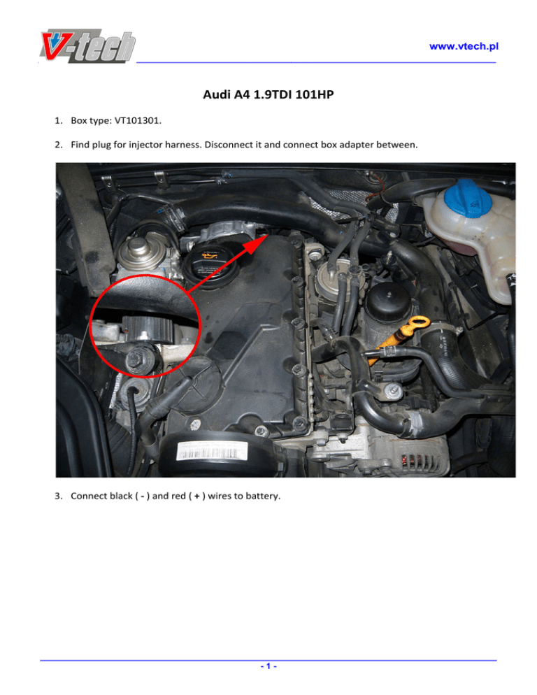 www.vtech.pl ____________________________________________________________________________ Audi A4 1.9TDI 101HP 1. Box type: VT101301. 2. Find plug for injector harness. Disconnect it and connect box adapter between. 3. Connect black ( - ) and red ( + ) wires to battery. ___________________________________________________________________________________________ -1-