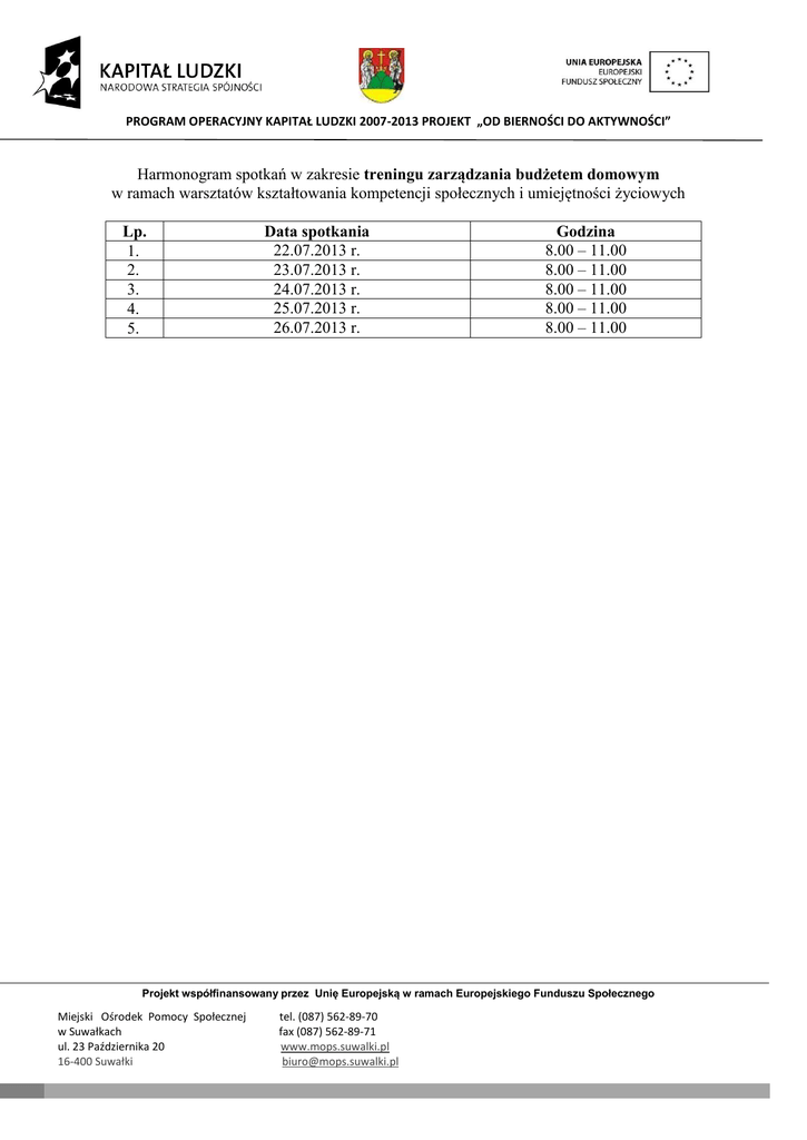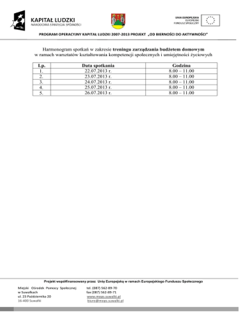 PROGRAM OPERACYJNY KAPITAŁ LUDZKI 2007-2013 PROJEKT „OD BIERNOŚCI DO AKTYWNOŚCI” Harmonogram spotkań w zakresie treningu zarządzania budżetem domowym w ramach warsztatów kształtowania kompetencji społecznych i umiejętności życiowych Lp. 1. 2. 3. 4. 5. Data spotkania 22.07.2013 r. 23.07.2013 r. 24.07.2013 r. 25.07.2013 r. 26.07.2013 r. Godzina 8.00 – 11.00 8.00 – 11.00 8.00 – 11.00 8.00 – 11.00 8.00 – 11.00 Projekt współfinansowany przez Unię Europejską w ramach Europejskiego Funduszu Społecznego Miejski Ośrodek Pomocy Społecznej w Suwałkach ul. 23 Października 20 16-400 Suwałki tel. (087) 562-89-70 fax (087) 562-89-71 www.mops.suwalki.pl [email protected]