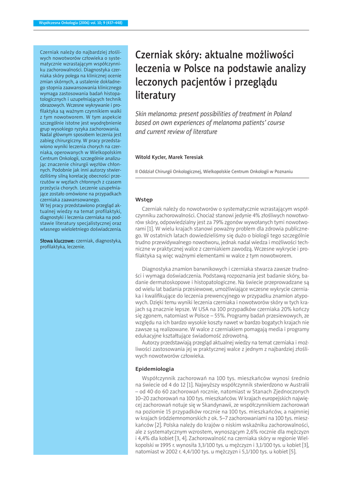 Współczesna Onkologia (2006) vol. 10; 9 (437–448) Czerniak należy do najbardziej złośliwych nowotworów człowieka o systematycznie wzrastającym współczynniku zachorowalności. Diagnostyka czerniaka skóry polega na klinicznej ocenie zmian skórnych, a ustalenie dokładnego stopnia zaawansowania klinicznego wymaga zastosowania badań histopatologicznych i uzupełniających technik obrazowych. Wczesne wykrywanie i profilaktyka są ważnym czynnikiem walki z tym nowotworem. W tym aspekcie szczególnie istotne jest wyodrębnienie grup wysokiego ryzyka zachorowania. Nadal głównym sposobem leczenia jest zabieg chirurgiczny. W pracy przedstawiono wyniki leczenia chorych na czerniaka, operowanych w Wielkopolskim Centrum Onkologii, szczególnie analizując znaczenie chirurgii węzłów chłonnych. Podobnie jak inni autorzy stwierdziliśmy silną korelację obecności przerzutów w węzłach chłonnych z czasem przeżycia chorych. Leczenie uzupełniające zostało omówione na przypadkach czerniaka zaawansowanego. W tej pracy przedstawiono przegląd aktualnej wiedzy na temat profilaktyki, diagnostyki i leczenia czerniaka na podstawie literatury specjalistycznej oraz własnego wieloletniego doświadczenia. Słowa kluczowe: czerniak, diagnostyka, profilaktyka, leczenie. Czerniak skóry: aktualne możliwości leczenia w Polsce na podstawie analizy leczonych pacjentów i przeglądu literatury Skin melanoma: present possibilities of treatment in Poland based on own experiences of melanoma patients’ course and current review of literature Witold Kycler, Marek Teresiak II Oddział Chirurgii Onkologicznej, Wielkopolskie Centrum Onkologii w Poznaniu Wstęp Czerniak należy do nowotworów o systematycznie wzrastającym współczynniku zachorowalności. Chociaż stanowi jedynie 4% złośliwych nowotworów skóry, odpowiedzialny jest za 79% zgonów wywołanych tymi nowotworami [1]. W wielu krajach stanowi poważny problem dla zdrowia publicznego. W ostatnich latach dowiedzieliśmy się dużo o biologii tego szczególnie trudno przewidywalnego nowotworu, jednak nadal wiedza i możliwości techniczne w praktycznej walce z czerniakiem zawodzą. Wczesne wykrycie i profilaktyka są więc ważnymi elementami w walce z tym nowotworem. Diagnostyka znamion barwnikowych i czerniaka stwarza zawsze trudności i wymaga doświadczenia. Podstawą rozpoznania jest badanie skóry, badanie dermatoskopowe i histopatologiczne. Na świecie przeprowadzane są od wielu lat badania przesiewowe, umożliwiające wczesne wykrycie czerniaka i kwalifikujące do leczenia prewencyjnego w przypadku znamion atypowych. Dzięki temu wyniki leczenia czerniaka i nowotworów skóry w tych krajach są znacznie lepsze. W USA na 100 przypadków czerniaka 20% kończy się zgonem, natomiast w Polsce – 55%. Programy badań przesiewowych, ze względu na ich bardzo wysokie koszty nawet w bardzo bogatych krajach nie zawsze są realizowane. W walce z czerniakiem pomagają media i programy edukacyjne kształtujące świadomość zdrowotną. Autorzy przedstawiają przegląd aktualnej wiedzy na temat czerniaka i możliwości zastosowania jej w praktycznej walce z jednym z najbardziej złośliwych nowotworów człowieka. Epidemiologia Współczynnik zachorowań na 100 tys. mieszkańców wynosi średnio na świecie od 4 do 12 [1]. Najwyższy współczynnik stwierdzono w Australii – od 40 do 60 zachorowań rocznie, natomiast w Stanach Zjednoczonych 10–20 zachorowań na 100 tys. mieszkańców. W krajach europejskich najwięcej zachorowań notuje się w Skandynawii, ze współczynnikiem zachorowań na poziomie 15 przypadków rocznie na 100 tys. mieszkańców, a najmniej w krajach śródziemnomorskich z ok. 5–7 zachorowaniami na 100 tys. mieszkańców [2]. Polska należy do krajów o niskim wskaźniku zachorowalności, ale z systematycznym wzrostem, wynoszącym 2,6% rocznie dla mężczyzn i 4,4% dla kobiet [3, 4]. Zachorowalność na czerniaka skóry w regionie Wielkopolski w 1995 r. wynosiła 3,3/100 tys. u mężczyzn i 3,1/100 tys. u kobiet [3], natomiast w 2002 r. 4,4/100 tys. u mężczyzn i 5,1/100 tys. u kobiet [5]. Współczesna Onkologia (2006) vol. 10; 9 (437–448) Melanoma is one of the most malignant human cancers with a still increasing factor of incidence. Skin melanoma diagnostics is based on clinical estimation of skin changes, precisely establishing clinical advanced needs to employ histopathological methods and some imaging techniques Early diagnostics and prevention are the most important elements in prophylaxis and successful treatment of melanoma patients. In this aspect it seems to be most important to separate the group of high risk. The method of choice in most melanoma cases is surgical resection. In this article we present the results of treatment of melanoma patients operated on in the Wielkopolska Cancer Centre. In a special manner we focused our attention on lymph node surgery. Similarly to results obtained by other authors we observed a strong correlation between presence of lymph node metastasis and patients’ survival. Adjuvant therapies were discussed in advanced melanomas. Here we present the current knowledge on prevention, diagnostics and melanoma treatment based on a review of the medical literature and own experience with management of melanoma cases. Key words: melanoma, diagnostics, prophylaxis, treatment. Diagnostyka Diagnostyka czerniaka skóry polega na klinicznej ocenie wyglądu zmian skórnych na podstawie charakterystycznych objawów sklasyfikowanych w dwóch systemach: ABCD i 7-punktowej skali Glasgow. Część zmian, przy braku jednoznacznego rozpoznania klinicznego, kwalifikuje się do biopsji wycinającej z zachowaniem odpowiedniego marginesu zdrowej skóry, poszerzonego również o odpowiedni fragment podskórnej tkanki tłuszczowej dla przeprowadzenia dokładnej oceny histopatologicznej [6]. Ustalenie dokładnego stopnia zaawansowania klinicznego wymaga oprócz badania klinicznego i histopat