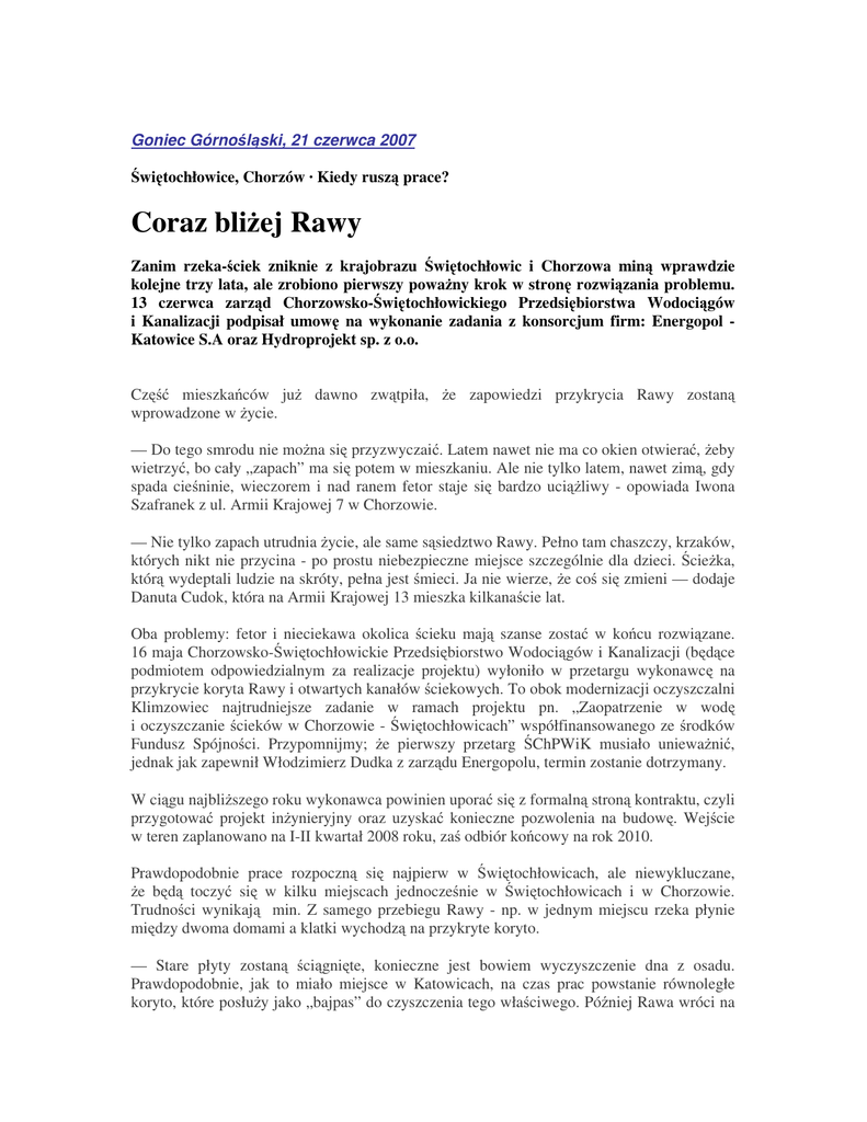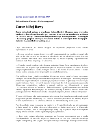 Goniec Górnośląski, 21 czerwca 2007 Świętochłowice, Chorzów · Kiedy ruszą prace? Coraz bliżej Rawy Zanim rzeka-ściek zniknie z krajobrazu Świętochłowic i Chorzowa miną wprawdzie kolejne trzy lata, ale zrobiono pierwszy poważny krok w stronę rozwiązania problemu. 13 czerwca zarząd Chorzowsko-Świętochłowickiego Przedsiębiorstwa Wodociągów i Kanalizacji podpisał umowę na wykonanie zadania z konsorcjum firm: Energopol Katowice S.A oraz Hydroprojekt sp. z o.o. Część mieszkańców już dawno zwątpiła, że zapowiedzi przykrycia Rawy zostaną wprowadzone w życie. — Do tego smrodu nie można się przyzwyczaić. Latem nawet nie ma co okien otwierać, żeby wietrzyć, bo cały „zapach” ma się potem w mieszkaniu. Ale nie tylko latem, nawet zimą, gdy spada cieśninie, wieczorem i nad ranem fetor staje się bardzo uciążliwy - opowiada Iwona Szafranek z ul. Armii Krajowej 7 w Chorzowie. — Nie tylko zapach utrudnia życie, ale same sąsiedztwo Rawy. Pełno tam chaszczy, krzaków, których nikt nie przycina - po prostu niebezpieczne miejsce szczególnie dla dzieci. Ścieżka, którą wydeptali ludzie na skróty, pełna jest śmieci. Ja nie wierze, że coś się zmieni — dodaje Danuta Cudok, która na Armii Krajowej 13 mieszka kilkanaście lat. Oba problemy: fetor i nieciekawa okolica ścieku mają szanse zostać w końcu rozwiązane. 16 maja Chorzowsko-Świętochłowickie Przedsiębiorstwo Wodociągów i Kanalizacji (będące podmiotem odpowiedzialnym za realizacje projektu) wyłoniło w przetargu wykonawcę na przykrycie koryta Rawy i otwartych kanałów ściekowych. To obok modernizacji oczyszczalni Klimzowiec najtrudniejsze zadanie w ramach projektu pn. „Zaopatrzenie w wodę i oczyszczanie ścieków w Chorzowie - Świętochłowicach” współfinansowanego ze środków Fundusz Spójności. Przypomnijmy; że pierwszy przetarg ŚChPWiK musiało unieważnić, jednak jak zapewnił Włodzimierz Dudka z zarządu Energopolu, termin zostanie dotrzymany. W ciągu najbliższego roku wykonawca powinien uporać się z formalną stroną kontraktu, czyli przygotować projekt inżynieryjny oraz uzyskać konieczne pozwolenia na budowę. Wejście w teren zaplanowano na I-II kwartał 2008 roku, zaś odbiór końcowy na rok 2010. Prawdopodobnie prace rozpoczną się najpierw w Świętochłowicach, ale niewykluczane, że będą toczyć się w kilku miejscach jednocześnie w Świętochłowicach i w Chorzowie. Trudności wynikają min. Z samego przebiegu Rawy - np. w jednym miejscu rzeka płynie między dwoma domami a klatki wychodzą na przykryte koryto. — Stare płyty zostaną ściągnięte, konieczne jest bowiem wyczyszczenie dna z osadu. Prawdopodobnie, jak to miało miejsce w Katowicach, na czas prac powstanie równoległe koryto, które posłuży jako „bajpas” do czyszczenia tego właściwego. Później Rawa wróci na swoje stare miejsce i będzie przykrywana na całej długości w obu miastach — wyjaśnia Jacek Gabor, prezes ŚChPWi K. Jeszcze nie wiadomo w których miejscach powstanie deptak wybrukowany kostką, gdzie zostanie zasiana trawa i ulokowane będą skwery, a którędy pobiegną obiecywane na tablicach informacyjnych ścieżki rowerowe. — Ściek zniknie z naszego otoczenia i odzyskamy teren, który będzie można estetycznie zagospodarować. Skoro przedsięwzięcie wykonywane będzie za unijne pieniądze to i wykończenie będzie stało na europejskim poziomie — podkreślał po podpisaniu umowy Marek Kopel, prezydent Chorzowa. Wiadomo jednak, że unijnych środków nie wystarczy. Realizacja zadania kosztować będzie około 20,5 mln euro, czyli prawie dwa razy więcej niż przewidziano w memorandum finansowym projektu. Ciężar zapłaty spoczął na wodociągach. Przedsiębiorstwo wystąpiło do Narodowego Funduszu Ochrony Środowiska o preferencyjną pożyczkę i otrzymało już promesę jej udzielenia. Tekst i foto: AW