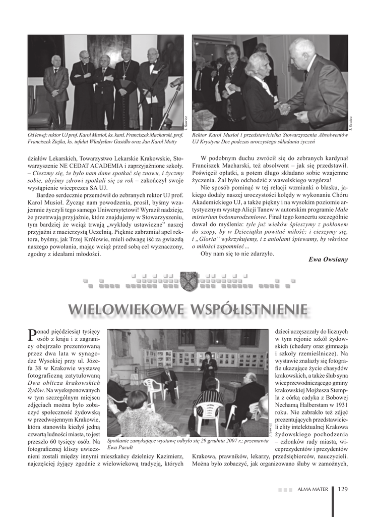 J. Sawicz J. Sawicz Od lewej: rektor UJ prof. Karol Musioł, ks. kard. Franciszek Macharski, prof. Franciszek Ziejka, ks. infułat Władysław Gasidło oraz Jan Karol Motty Rektor Karol Musioł i przedstawicielka Stowarzyszenia Absolwentów UJ Krystyna Dec podczas uroczystego składania życzeń działów Lekarskich, Towarzystwo Lekarskie Krakowskie, Stowarzyszenie NE CEDAT ACADEMIA i zaprzyjaźnione szkoły. – Cieszmy się, że było nam dane spotkać się znowu, i życzmy sobie, abyśmy zdrowi spotkali się za rok – zakończył swoje wystąpienie wiceprezes SA UJ. Bardzo serdecznie przemówił do zebranych rektor UJ prof. Karol Musioł. Życząc nam powodzenia, prosił, byśmy wzajemnie życzyli tego samego Uniwersytetowi! Wyraził nadzieję, że przetrwają przyjaźnie, które znajdujemy w Stowarzyszeniu, tym bardziej że wciąż trwają „wykłady ustawiczne” naszej przyjaźni z macierzystą Uczelnią. Pięknie zabrzmiał apel rektora, byśmy, jak Trzej Królowie, mieli odwagę iść za gwiazdą naszego powołania, mając wciąż przed sobą cel wyznaczony, zgodny z ideałami młodości. W podobnym duchu zwrócił się do zebranych kardynał Franciszek Macharski, też absolwent – jak się przedstawił. Poświęcił opłatki, a potem długo składano sobie wzajemne życzenia. Żal było odchodzić z wawelskiego wzgórza! Nie sposób pominąć w tej relacji wzmianki o blasku, jakiego dodały naszej uroczystości kolędy w wykonaniu Chóru Akademickiego UJ, a także piękny i na wysokim poziomie artystycznym występ Alicji Tanew w autorskim programie Małe misterium bożonarodzeniowe. Finał tego koncertu szczególnie dawał do myślenia: tyle już wieków śpieszymy z pokłonem do szopy, by w Dzieciątku powitać miłość; i cieszymy się, i „Gloria” wykrzykujemy, i z aniołami śpiewamy, by wkrótce o miłości zapomnieć… Oby nam się to nie zdarzyło. Ewa Owsiany WIELOWIEKOWE WSPÓŁISTNIENIE P J. Sawicz onad pięćdziesiąt tysięcy dzieci uczęszczały do licznych osób z kraju i z zagraniw tym rejonie szkół żydowcy obejrzało prezentowaną skich (chedery oraz gimnazja przez dwa lata w synagoi szkoły rzemieślnicze). Na dze Wysokiej przy ul. Józewystawie znalazły się fotografa 38 w Krakowie wystawę fie ukazujące życie chasydów fotograficzną zatytułowaną krakowskich, a także ślub syna Dwa oblicza krakowskich wiceprzewodniczącego gminy Żydów. Na wyeksponowanych krakowskiej Mojżesza Stempw tym szczególnym miejscu la z córką cadyka z Bobowej zdjęciach można było zobaNechamą Halberstam w 1931 czyć społeczność żydowską roku. Nie zabrakło też zdjęć w przedwojennym Krakowie, prezentujących przedstawiciektóra stanowiła kiedyś jedną li elity intelektualnej Krakowa czwartą ludności miasta, to jest żydowskiego pochodzenia przeszło 60 tysięcy osób. Na Spotkanie zamykające wystawę odbyło się 29 grudnia 2007 r.; przemawia – członków rady miasta, wifotograficznej kliszy uwiecz- Ewa Pacułt ceprezydentów i prezydentów nieni zostali między innymi mieszkańcy dzielnicy Kazimierz, Krakowa, prawników, lekarzy, przedsiębiorców, nauczycieli. najczęściej żyjący zgodnie z wielowiekową tradycją, których Można było zobaczyć, jak organizowano śluby w zamożnych, ALMA MATER 129 J. Sawicz zasymilowanych domach żydowskich, jak wyglądali uczniowie mocje nowych książek, między innymi autorstwa przedwojennych i profesorowie słynnego Gimnazjum Hebrajskiego (z wykłado- krakowian mieszkających obecnie w Izraelu, a także koncerty. wym językiem polskim) przy ul. Podbrzezie, młodzież upra- W autentycznej średniowiecznej synagodze po raz pierwszy wiająca sporty w klubie zaprezentowany został Makkabi, maszerująca spektakl Starego Teatru ul. Grodzką w manifeJa jestem Żyd z „Wesela”. stacjach patriotycznych To właśnie w tym miejpodczas uroczystości scu odbyła się również 11 listopada i 3 maja, uroczystość wręczenia a także wyjeżdżająca na przez ambasadora Izraela obozy harcerskie Hacofe w Polsce Davida Pelega w Beskidy i Tatry. czterech kolejnych medaAutorzy wystawy: li „Sprawiedliwy wśród Aleksander B. Skotnicki Narodów Świata” polskim i Ewa Pacułt, otrzymali rodzinom w obecności popokazywane na wystawie tomków uratowanych. zdjęcia i dokumenty od 29 grudnia 2007 roku, przedwojennych obywatena spotkaniu zamykali Krakowa żydowskiego jącym wystawę, wśród pochodzenia, którzy jako licznie zgromadzonych nieliczni przeżyli Hologości obecni byli między kaust i obecnie mieszkają Prof. Aleksander Skotnicki oprowadza po wystawie prof. Zdzisława Żygulskiego innymi: prof. Zdzisław juniora rozsiani po całym świecie. Żygulski junior z MuzeZrzeszeni w Towarzystwach Krakowian w USA czy Izraelu, um Czartoryskich, prof. Jerzy Naskalski z Collegium Medicum organizują zjazdy i spotkania, mówią świetnie po polsku mimo UJ oraz dziekan Wydziału Studiów Międzynarodowych i Poliopuszczenia naszego kraju ponad pięćdziesiąt lat temu. tycznych UJ prof. Wiesław Kozub-Ciembroniewicz. Warto też dodać, że trwającej dwa lata wystawie towarzyszyły Miejmy nadzieję, że wystawa ta, dokumentująca wielowieliczne i różnorodne przedsięwzięcia. W sali modlitewnej 500- kowe współistnienie dwóch społeczności Krakowa, wzajemne -letniej synagogi Wysokiej odbywały się spotkania młodzieży przeplatanie się i wzbogacanie ich kultur i tradycji, znajdzie szkolnej z Izraela, często rozpoznającej swoich krewnych na w Krakowie stałe miejsce. RPM prezentowanych zdjęciach, wielokrotnie organizowane były pro- SZKIC DO PORTRETU R ok 2007 był nie tylko Rokiem Karola Szymanowskiego. Został poświęcony także innemu polskiemu kompozytorowi – Zygmuntowi Mycielskiemu, który tworzył w trudnych latach przełomów. W roku 2007 przypadła 100. rocznica jego urodzin i 20. rocznica śmierci. Zygmunt Mycielski (1907–1987) był kompozytorem i publicystą muzycznym związanym z Podkarpaciem. Urodził
