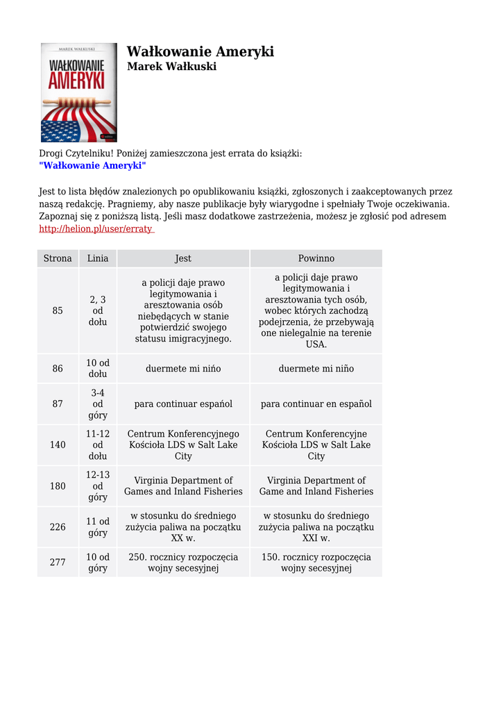 Wałkowanie Ameryki Marek Wałkuski Drogi Czytelniku! Poniżej zamieszczona jest errata do książki: "Wałkowanie Ameryki" Jest to lista błędów znalezionych po opublikowaniu książki, zgłoszonych i zaakceptowanych przez naszą redakcję. Pragniemy, aby nasze publikacje były wiarygodne i spełniały Twoje oczekiwania. Zapoznaj się z poniższą listą. Jeśli masz dodatkowe zastrzeżenia, możesz je zgłosić pod adresem http://helion.pl/user/erraty Strona Linia Jest Powinno 85 2, 3 od dołu a policji daje prawo legitymowania i aresztowania osób niebędących w stanie potwierdzić swojego statusu imigracyjnego. a policji daje prawo legitymowania i aresztowania tych osób, wobec których zachodzą podejrzenia, że przebywają one nielegalnie na terenie USA. 86 10 od dołu duermete mi nińo duermete mi niño 87 3-4 od góry para continuar espańol para continuar en español 140 11-12 od dołu Centrum Konferencyjnego Kościoła LDS w Salt Lake City Centrum Konferencyjne Kościoła LDS w Salt Lake City 180 12-13 od góry Virginia Department of Games and Inland Fisheries Virginia Department of Game and Inland Fisheries 226 11 od góry w stosunku do średniego zużycia paliwa na początku XX w. w stosunku do średniego zużycia paliwa na początku XXI w. 277 10 od góry 250. rocznicy rozpoczęcia wojny secesyjnej 150. rocznicy rozpoczęcia wojny secesyjnej