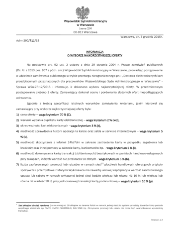 Wojewódzki Sąd Administracyjny w Warszawie Jasna 2/4 00-013 Warszawa Warszawa, dn. 3 grudnia 2015r. Adm-290/711/15 INFORMACJA O WYBORZE NAJKORZYSTNIEJSZEJ OFERTY Na podstawie art. 92 ust. 2 ustawy z dnia 29 stycznia 2004 r. Prawo zamówień publicznych (Dz. U. z 2013 poz. 907 z późn. zm.) Wojewódzki Sąd Administracyjny w Warszawie, prowadząc postępowanie o udzielenie zamówienia publicznego w trybie przetargu nieograniczonego pn.: „Dostawa elektronicznych kart przedpłaconych przeznaczonych dla pracowników Wojewódzkiego Sądu Administracyjnego w Warszawie” Sprawa WSA-ZP-12/2015 - informuje, iż dokonano wyboru najkorzystniejszej oferty. W przedmiotowym postępowaniu złożono 2 oferty. Zamawiający dokonał oceny i porównania złożonych ofert niepodlegających odrzuceniu. Zgodnie z treścią specyfikacji istotnych warunków zamówienia kryteriami, jakim kierował się zamawiający przy wyborze najkorzystniejszej oferty była: 1) cena oferty – waga kryterium 70 % (C), 2) warunki wydania duplikatu karty elektronicznej – waga kryterium 2 % (wd), 3) okres ważności kart elektronicznych - waga kryterium 3 % (t), 4) możliwość sprawdzenia historii operacji na karcie oraz salda w serwisie internetowym – waga kryterium 5 % (s), 5) możliwość skorzystania z infolinii 24h/7dni w zakresie zastrzeżenia karty w przypadku zagubienia lub kradzieży oraz innej pomocy w zakresie karty, bankomatów itp. - waga kryterium 5 % (i), 6) możliwość dokonywania kartą transakcji (zbliżeniowych) bezstykowych w punktach handlowo-usługowych przy zakupach, których wartość nie przekracza 50 złotych - waga kryterium 5 % (b), 7) liczba zaoferowanych promocji lub rabatów w ramach sieci(1) placówek handlowych oferujących artykuły spożywcze i przemysłowe z którymi Wykonawca ma zawartą umowę współpracy a wartość zaoferowanego upustu lub rabatu w ramach wykazanej jednej sieci będzie większa lub równa niż 10 % lub większa lub równa niż wartość 50 zł, przy jednorazowej transakcji kartą podarunkową.– waga kryterium 10 % (p). 1 Sieć sklepów lub sieć handlowa (to nie mniej niż 10 sklepów na terenie Polski w ramach jednej sieci) to system sprzedaży towarów który posiada wspólnego właściciela np. SMYK, EMPIK CARREFOUR, BIG STAR itp. Otrzymanie promocji lub rabatu nie może być uwarunkowane wysokością transakcji. Strona 1 z 2 Zamawiający zgodnie ze wskazaną formułą określoną w specyfikacji istotnych warunków zamówienia dokonał następującej oceny punktowej złożonych ofert. Numer oferty Parametry podane w ofercie Wykonawcy 1. 2. Nazwa (firma) i adres wykonawcy „P” Cena oferty brutto Liczba wyliczonych pkt w kryterium [Pkt.] Razem [Pkt.] (C) SODEXO Benefits and Rewards Serwices Polska Sp. z o.o. ul. Kłobucka 25 02-699 Warszawa BONUS Systems Polska Sp. z o.o. ul. Górczewska 124 01-460 Warszawa 255 560,00 zł 255 560,00 zł (wd) (t) (s) (i) (b) (p) 0 zł/ 1 dn. 36 m-cy Tak Tak Nie 11 70,00 95,00 2,00 3,00 5,00 5,00 0,00 10,00 0 zł/ 7 dn. 36 m-cy Tak Tak Nie 7 70,00 89,65 0,29 3,00 5,00 5,00 0,00 6,36 Zamawiający nie wykluczył żadnego wykonawcy ani nie odrzucił żadnej oferty przetargowej. Na postawie oceny spełnienia warunków udziału w postępowaniu oraz kryteriów oceny ofert ustalono, iż oferta nr 1 złożona przez firmę SODEXO Benefits and Rewards Serwices Polska Sp. z o.o., odpowiada wszystkim wymaganiom określonym w ustawie Prawo zamówień publicznych oraz specyfikacji istotnych warunków zamówienia i została oceniona, jako najkorzystniejsza w oparciu o podane w specyfikacji kryteria wyboru. Zamawiający zgodnie z ustalonymi zasadami korespondencji, które zgodnie z wyborem Zamawiającego zostały zawarte w SIWZ, w oparciu o dyspozycje art. 94 ust.1 pkt 2 w związku z art. 27 ust. 2 ustawy Prawo zamówień publicznych jest uprawniony do zawarcia umowy po upływie 5 dni od dnia przesłania niniejszego zawiadomienia o wyborze najkorzystniejszej oferty. /-/ Dyrektor WSA w Warszawie Wojciech Kitka (podpis na oryginale) Strona 2 z 2