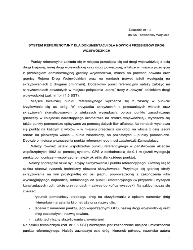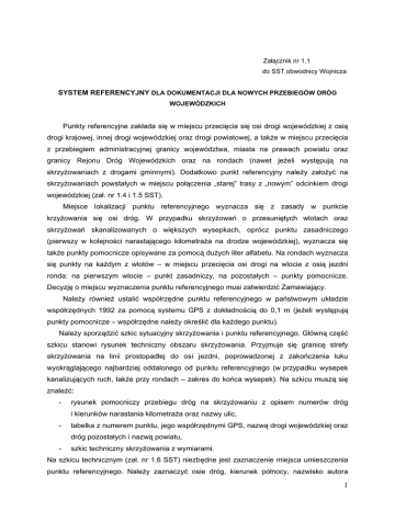 Załącznik nr 1.1 do SST obwodnicy Wojnicza SYSTEM REFERENCYJNY DLA DOKUMENTACJI DLA NOWYCH PRZEBIEGÓW DRÓG WOJEWÓDZKICH Punkty referencyjne zakłada się w miejscu przecięcia się osi drogi wojewódzkiej z osią drogi krajowej, innej drogi wojewódzkiej oraz drogi powiatowej, a także w miejscu przecięcia z przebiegiem administracyjnej granicy województwa, miasta na prawach powiatu oraz granicy Rejonu Dróg Wojewódzkich oraz na rondach (nawet jeżeli występują na skrzyżowaniach z drogami gminnymi). Dodatkowo punkt referencyjny należy założyć na skrzyżowaniach powstałych w miejscu połączenia „starej” trasy z „nowym” odcinkiem drogi wojewódzkiej (zał. nr 1.4 i 1.5 SST). Miejsce lokalizacji punktu referencyjnego wyznacza się z zasady w punkcie krzyżowania się osi dróg. W przypadku skrzyżowań o przesuniętych wlotach oraz skrzyżowań skanalizowanych o większych wysepkach, oprócz punktu zasadniczego (pierwszy w kolejności narastającego kilometraża na drodze wojewódzkiej), wyznacza się także punkty pomocnicze opisywane za pomocą dużych liter alfabetu. Na rondach wyznacza się punkty na każdym z wlotów – w miejscu przecięcia osi drogi na wlocie z osią jezdni ronda: na pierwszym wlocie – punkt zasadniczy, na pozostałych – punkty pomocnicze. Decyzję o miejscu wyznaczenia punktu referencyjnego musi zatwierdzić Zamawiający. Należy również ustalić współrzędne punktu referencyjnego w państwowym układzie współrzędnych 1992 za pomocą systemu GPS z dokładnością do 0,1 m (jeżeli występują punkty pomocnicze – współrzędne należy określić dla każdego punktu). Należy sporządzić szkic sytuacyjny skrzyżowania i punktu referencyjnego. Główną część szkicu stanowi rysunek techniczny obszaru skrzyżowania. Przyjmuje się granicę strefy skrzyżowania na linii prostopadłej do osi jezdni, poprowadzonej z zakończenia łuku wyokrąglającego najbardziej oddalonego od punktu referencyjnego (w przypadku wysepek kanalizujących ruch, także przy rondach – zakres do końca wysepek). Na szkicu muszą się znaleźć: - rysunek pomocniczy przebiegu dróg na skrzyżowaniu z opisem numerów dróg i kierunków narastania kilometraża oraz nazwy ulic, - tabelka z numerem punktu, jego współrzędnymi GPS, nazwą drogi wojewódzkiej oraz dróg pozostałych i nazwą powiatu, - szkic techniczny skrzyżowania z wymiarami. Na szkicu technicznym (zał. nr 1.6 SST) niezbędne jest zaznaczenie miejsca umieszczenia punktu referencyjnego. Należy zaznaczyć osie dróg, kierunek północy, nazwisko autora 1 szkicu i datę jego wykonania, a także powiat, gminę i miejscowość. Konieczne jest określenie skali, w jakiej sporządzono rysunek oraz opisanie kierunków oraz powiązań pomiędzy poprzedzającymi i następującymi punktami referencyjnymi. Ponadto na szkicu należy opisać poszczególne elementy występujące przy jezdni oraz zaznaczyć długości odcinków dróg w strefie skrzyżowania (czyli odległość od punktu referencyjnego do końca przyjętego obszaru skrzyżowania na każdym z wlotów). Na granicy stref na wlotach należy również zaznaczyć szerokości poszczególnych elementów. Dodatkowo należy ponumerować i policzyć powierzchnie wszystkich elementów skrzyżowania, a następnie zamieścić je w tabeli według załączonego wzoru (zał. nr 1.7 SST). Szkic należy wykonać opierając się na załączonych przykładach (załącznik nr 1.2 i 1,3 SST – przykładowy szkic z wymiarami i numeracją elementów). Szkic należy dostarczyć w formie papierowej w postaci wydruku A4 (lub jeśli szkic w tej skali byłby nieczytelny w formacie A3) oraz w formie elektronicznej w formacie pliku *.DXF lub *.DWG. Ponadto wyznaczonych Projektant przez poda nowe długości punkty nowopowstałych referencyjne oraz odcinków odcinków referencyjnych poprzedzających i następujących przed i po nowo wybudowanym odcinku drogi wojewódzkiej. Długość odcinka referencyjnego jest to odległość pomiędzy dwoma następującymi po sobie punktami referencyjnymi. W przypadku skrzyżowań z punktami pomocniczymi opisywanymi za pomocą liter alfabetu, punkty te pomija się, a odcinek wyznaczają 2 punkty zasadnicze. W przypadku rond, odcinek poprzedzający rondo mierzy się od punktu referencyjnego poprzedzającego rondo do punktu pomocniczego znajdującego się na wylocie z ronda przedmiotowej drogi wojewódzkiej (wliczając długość jezdni ronda mierzonej od punktu na wlocie, zgodnie z kierunkiem jazdy, do punktu na wylocie z ronda przedmiotowej drogi wojewódzkiej). Analogicznie – odcinek następujący po rondzie mierzy się od punktu pomocniczego na wylocie z ronda drogi wojewódzkiej do następnego punktu referencyjnego na kolejnym skrzyżowaniu. W szczególnym przypadku, kiedy na rondzie zbiegają się 2 drogi wojewódzkie należy wcześniej ustalić, do której drogi wojewódzkiej przypisane jest rondo i dla tej właśnie drogi dokonać pomiaru jak powyżej. Natomiast dla drugiej drogi wojewódzkiej pomiaru odcinka poprzedzającego rondo dokonuje się mierząc do pierwszego punktu na wlocie, a odcinka następującego po rondzie – od punktu na wylocie ronda (pomijając w obu przypadkach długość jezdni ronda). W sytuacji, gdy rondo występuje na skrzyżowaniu drogi wojewódzkiej z drogą krajową również odcinki mierzy się pomijając długość jezdni na rondzie. W razie jakichkolwiek wątpliwości Projektant powinien każdorazowo kontaktować się z przedstawicielem Zamawiającego. 2