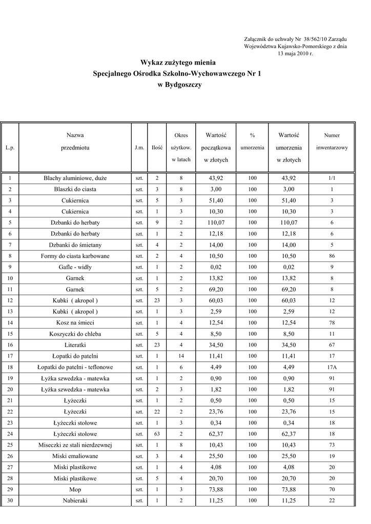 Załącznik do uchwały Nr 38/562/10 Zarządu Województwa Kujawsko-Pomorskiego z dnia 13 maja 2010 r. Wykaz zuŜytego mienia Specjalnego Ośrodka Szkolno-Wychowawczego Nr 1 w Bydgoszczy Nazwa L.p. przedmiotu J.m. Ilość Okres Wartość % Wartość Numer uŜytkow. początkowa umorzenia umorzenia inwentarzowy w latach w złotych w złotych 1 Blachy aluminiowe, duŜe szt. 2 8 43,92 100 43,92 1/1 2 Blaszki do ciasta szt. 3 8 3,00 100 3,00 1 3 Cukiernica szt. 5 3 51,40 100 51,40 3 4 Cukiernica szt. 1 3 10,30 100 10,30 3 5 Dzbanki do herbaty szt. 9 2 110,07 100 110,07 6 6 Dzbanki do herbaty szt. 1 2 12,18 100 12,18 6 7 Dzbanki do śmietany szt. 4 2 14,00 100 14,00 5 8 Formy do ciasta karbowane szt. 2 4 10,50 100 10,50 86 9 Gafle - widły szt. 1 2 0,02 100 0,02 9 10 Garnek szt. 1 2 13,82 100 13,82 8 11 Garnek szt. 5 2 69,20 100 69,20 8 12 Kubki ( akropol ) szt. 23 3 60,03 100 60,03 12 13 Kubki ( akropol ) szt. 1 3 2,59 100 2,59 12 14 Kosz na śmieci szt. 1 4 12,54 100 12,54 78 15 Koszyczki do chleba szt. 5 4 8,50 100 8,50 11 16 Literatki szt. 23 4 34,50 100 34,50 67 17 Łopatki do patelni szt. 1 14 11,41 100 11,41 17 18 Łopatki do patelni - teflonowe szt. 1 6 4,49 100 4,49 17A 19 ŁyŜka szwedzka - matewka szt. 1 2 0,90 100 0,90 91 20 ŁyŜka szwedzka - matewka szt. 2 3 1,82 100 1,82 91 21 ŁyŜeczki szt. 1 2 0,50 100 0,50 15 22 ŁyŜeczki szt. 22 2 23,76 100 23,76 15 23 ŁyŜeczki stołowe szt. 1 3 0,34 100 0,34 18 24 ŁyŜeczki stołowe szt. 63 2 62,37 100 62,37 18 25 Miseczki ze stali nierdzewnej szt. 1 8 10,43 100 10,43 73 26 Miski emaliowane szt. 3 4 25,50 100 25,50 19 27 Miski plastikowe szt. 1 4 4,08 100 4,08 20 28 Miski plastikowe szt. 5 4 20,70 100 20,70 20 29 Mop szt. 1 3 73,88 100 73,88 70 30 Nabieraki szt. 1 2 11,25 100 11,25 22 31 Nabieraki szt. 13 2 145,60 100 145,60 22 32 Nabieraki szt. 6 4 12,00 100 12,00 88 33 NoŜe kuchenne szt. 1 8 9,25 100 9,25 23 / 1 34 NoŜe kuchenne szt. 1 8 9,30 100 9,30 23 / 1 35 NoŜe stołowe szt. 1 5 1,69 100 1,69 21 36 NoŜe stołowe szt. 118 5 178,18 100 178,18 21 37 NoŜe do drobiu szt. 1 16 7,00 100 7,00 23 38 Patelnia teflonowa szt. 1 6 40,96 100 40,96 28A 39 Patery do ciasta szt. 1 4 10,06 100 10,06 84 40 Podstawki do szklanek szt. 1 4 0,74 100 0,74 30 41 Podstawki do szklanek szt. 39 4 31,20 100 31,20 30 42 Pokrywy do garnków szt. 4 2 4,00 100 4,00 26 43 Półmisek szt. 1 3 2,00 100 2,00 27 44 Półmisek szt. 12 3 24,96 100 24,96 27 45 Przyprawniki szt. 2 3 15,68 100 15,68 60 46 Rózga cukiernicza szt. 1 9 0,02 100 0,02 30 / 1 47 Salaretka deserowa szt. 1 2 1,08 100 1,08 80 48 Salaretka deserowa szt. 9 2 10,17 100 10,17 80 49 Serwetniki porcelanowe szt. 1 2 4,05 100 4,05 36 / 1 50 Serwetniki porcelanowe szt. 14 2 55,86 100 55,86 36 / 1 51 Stuf - garnek do mleka szt. 1 3 20,14 100 20,14 64 52 Stuf - garnek do mleka szt. 1 2 20,13 100 20,13 64 53 Szuszarki do naczyć szt. 1 4 13,56 100 13,56 32 54 Szklanki szt. 1 3 1,87 100 1,87 33 55 Szklanki szt. 29 3 40,31 100 40,31 33 56 Szumówki szt. 1 3 20,61 100 20,61 36 57 Taca barowa plastikowa szt. 1 4 6,32 100 6,32 77 58 Taca barowa plastikowa szt. 6 5 38,28 100 38,28 77 59 Tace aluminiowe szt. 1 3 4,00 100 4,00 40 60 Tace aluminiowe szt. 3 2 12,06 100 12,06 40 61 Talerze głębokie szt. 1 4 3,43 100 3,43 43 62 Talerze głębokie szt. 115 4 249,55 100 249,55 43 63 Talerze deserowe szt. 1 3 4,28 100 4,28 44 64 Talerze deserowe szt. 88 3 327,36 100 327,36 44 65 Talerze płytkie szt. 1 3 2,37 100 2,37 45 66 Talerze płytkie szt. 65 3 208,00 100 208,00 45 67 Termos 15 lit szt. 1 6 5,00 100 5,00 42 68 Termos 2 lit szt. 2 5 35,00 100 35,00 42 / 1 69 Tłuczek do mięsa szt. 1 3 7,18 100 7,18 37 70 Tłuczek do mięsa szt. 1 2 7,20 100 7,20 37 71 Waga szt. 1 16 15,00 100 15,00 55 72 Wanienka plastikowa szt. 2 4 27,46 100 27,46 76 73 Wanna cynkowa szt. 1 5 37,60 100 37,60 49 74 Wazoniki szt. 4 2 4,76 100 4,76 48 75 Wazy do zupy szt. 2 5 26,20 100 26,20 54 76 Wiadra emaliowane szt. 1 6 23,56 100 23,56 58 77 Wiadra emaliowane szt. 1 5 23,55 100 23,55 58 78 Widelce stołowe szt. 1 4 0,50 100 0,50 52 79 Widelce stołowe szt. 44 4 44,88 100 44,88 52 80 Wiosło drewniane szt. 2 2 4,96 100 4,96 74 81 Zasłona prysznicowa szt. 1 2 5,97 100 5,97 92 82 Zasłona prysznicowa szt. 1 2 5,98 100 5,98 92 83 Obieraczka do warzyw - noŜyki szt. 1 2 1,17 100 1,17 13 84 Obieraczka do warzyw - noŜyki szt. 9 2 9,90 100 9,90 13 85 Pojemnik plastikowy do przypraw szt. 1 2 6,99 100 6,99 98 86 Krajalnica do jaj szt. 1 4 3,62 100 3,62 82 87 Krajalnica do jaj szt. 1 3 3,63 100 3,63 82 88 Kubeczki porcelanowe szt. 20 4 22,00 100 22,00 87 89 Tarka szt. 3 2 32,61 100 32,61 39 90 Cukiernica szt. 1 3 10,28 100 10,28 3 91 Dzbanki do herbaty szt. 5 2 61,15 100 61,15 6 92 Kubki ( akropol ) szt. 10 3 26,10 100 26,10 12 93 ŁyŜeczki szt. 15 6 16,20 100 16,20 15 94 Półmiski szt. 1 3 2,08 100 2,08 27 95 ŁyŜeczki stołowe szt. 35 2 34,65 100 34,65 18 96 NoŜe stołowe szt. 35 5 52,85 100 52,85 21 97 Pojemnik plastikowy do przypraw szt. 5 2 34,90 100 34,90 99 98 Mop szt. 1 3 73,89 100 73,89 70 99 Pojemnik do mięsa szt. 1 7 20,58 100 20,58 61 100 Pojemnik do mięsa szt. 1 6 20,55 100 20,55 61 101 Obieraczka do warzyw - noŜyki szt. 6 2 6,60 100 6,60 13 102 Salaretki, duŜe, białe porcelanowe szt. 1 3 7,36 100 7,36 35A 103 Salaretki, duŜe, białe porcelanowe szt. 9 3 66,06 100 66,06 35A 104 Serwetki porcelanowe szt. 2 2 7,98 100 7,98 36 / 1 105 Stuf - garnek do mleka szt. 1 2 20,13 100 20,13 64 106 Szuszarki do naczyć szt. 2 4 27,04 100 27,04 32 107 Szklanki szt. 14 3 19,46 100 19,46 33 108 Taca barowa plastikowa szt. 10 3 63,80 100 63,80 77 109 Talerze głębokie szt. 60 4 130,20 100 130,20 43 110 Talerze małe, deserowe szt. 40 2 148,80 100 148,80 44 111 Talerze płytkie szt. 30 3 96,00 100 96,00 45 112 Tarka nierdzewna szt. 1 2 10,87 100 10,87 39 113 Termosy 2 lit, nierdzewne szt. 1 6 82,70 100 82,70 42 / 2 114 Termosy 2 lit, nierdzewne szt. 1 6 82,67 100 82,67 42 / 2 115 Tortownica szt. 1 4 10,21 100 10,21 85 116 Wieszaki szt. 2 2 13,4