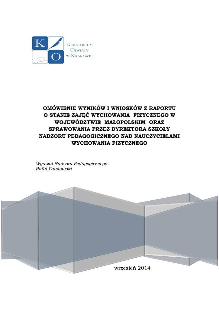 OMÓWIENIE WYNIKÓW I WNIOSKÓW Z RAPORTU O STANIE ZAJĘĆ WYCHOWANIA FIZYCZNEGO W WOJEWÓDZTWIE MAŁOPOLSKIM ORAZ SPRAWOWANIA PRZEZ DYREKTORA SZKOŁY NADZORU PEDAGOGICZNEGO NAD NAUCZYCIELAMI WYCHOWANIA FIZYCZNEGO Wydział Nadzoru Pedagogicznego Rafał Pawłowski wrzesień 2014 Spis treści Przebieg badań i charakterystyka badanej grupy..........................................2 Pytania badawcze.........................................................................................3 Wyniki badań Baza sportowa…….......................................................................................7 Bezpieczeństwo i higiena pracy na zajęciach wychowania fizycznego....................................................................................................7 Wypadki .....................................................................................................8 Nieprawidłowości w tworzeniu programów nauczania oraz ramowych planów nauczania....................................................................................................8 Alternatywne formy wychowania fizycznego..................................................9 Zajęcia pozalekcyjne i spędzanie czasu wolnego przez uczniów...................10 Współzawodnictwo sportowe .....................................................................12 Edukacja zdrowotna na wychowaniu fizycznym.........................................12 Ocenianie...................................................................................................13 Prowadzenie dokumentacji szkolnej............................................................14 Zwolnienia z wychowania fizycznego...........................................................14 Wnioski i uogólnienia…..............................................................................17 Kuratorium Oświaty w Krakowie 1 | Strona Przebieg badań i charakterystyka badanej grupy W Raporcie omawiane są badania zrealizowane w dniach od 14 lutego do 17 marca 2014 r. w małopolskich szkołach podstawowych, gimnazjach oraz szkołach ponadgimnazjalnych. Badania zostały przeprowadzone w oparciu o następujące podstawy prawne: - ustawę z dnia 7 września 1991 r. o systemie oświaty (Dz. U. z 2004 r. nr 256, poz. 2572 z późn. zm.); - rozporządzenie Ministra Edukacji Narodowej i Sportu z dnia 31 grudnia 2002 r. w prawie bezpieczeństwa i higieny w publicznych i niepublicznych szkołach i placówkach (Dz. U. z 2003 r. nr 6, poz. 69 z późn. zm.); - Rozporządzenie Ministra Edukacji Narodowej z dnia 7 października 2009 r. w sprawie nadzoru pedagogicznego (Dz. U. Nr 168, poz. 1324 z późn. zm. ). Rozporządzenie Ministra Edukacji Narodowej z dnia 30 kwietnia 2007 r. w sprawie warunków i sposobu oceniania, klasyfikowania i promowania uczniów i słuchaczy oraz przeprowadzania sprawdzianów i egzaminów w szkołach publicznych (Dz. U. 2007 nr 83 poz. 562 z późn. zm.). - Rozporządzenie Ministra Edukacji Narodowej z dnia 21 grudnia 2012 r. w sprawie kryteriów i trybu dokonywania oceny pracy nauczyciela, trybu postępowania odwoławczego oraz składu i sposobu powoływania zespołu oceniającego (Dz. U. 2012 poz. 1538). Badania polegały na wypełnieniu przez dyrektorów w/w szkół arkusza monitorowania, który został umieszczony w „Panelu dyrektora” na serwerze Kuratorium Oświaty w Krakowie. Arkusz monitorowania (załącznik nr 1) zawierał instrukcję, wg której należało go wypełnić. W ankietach umieszczono pytania dotyczące bazy sportowej i wyposażenia, nauczycieli wychowania fizycznego, zwolnień z wychowania fizycznego, realizacji zajęć wychowania fizycznego zarówno obowiązkowych, jak i dodatkowych, uczestnictwa we współzawodnictwie sportowym oraz prowadzenia edukacji zdrowotnej. Arkusz został wypełniony przez dyrektorów 1333 szkół podstawowych, 682 gimnazjów oraz 416 dyrektorów szkół ponadgimnazjalnych (w rozbiciu na dyrektorów liceum ogólnokształcących 154, technikum 141, zasadniczych szkół zawodowych 121). Drugi z arkuszy został skierowany do uczniów poszczególnych typów szkół. W Tabeli 1 przedstawiono liczbę uczniów biorących udział w wypełnieniu arkusza. Kuratorium Oświaty w Krakowie 2 | Strona Tabela 1 Liczba uczniów uczestniczących w badaniu w podziale na typ szkoły. Do celów analizy statystycznej wykorzystano wszystkie wypełnione arkusze. Żaden Arkusz nie został odrzucony z przyczyn formalnych. Pytania badawcze Głównym celem prezentowanych badań było, uzyskanie informacji o stanie wychowania fizycznego w szkołach podstawowych, gimnazjach oraz szkołach ponadgimnazjalnych funkcjonujących na terenie województwa małopolskiego. W związku z powyższym sformułowano następujące pytania badawcze do dyrektorów szkół: 1. Proszę podać status szkoły; 2. Typ szkoły; 3. Ilość uczniów w szkole/placówce rok 2012/1013; 4. Ilość uczniów w szkole/placówce rok 2013/1014; 5. Czy uważa Pan/Pani, że baza sportowa szkoły jest; 6. Wyposażenie sali gimnastycznej (przyrządy i przybory do prowadzenia wychowania fizycznego) w szkole są; 7. Proszę podać liczbę uczniów, którym wydano decyzję o zwolnieniu z wychowania fizycznego na podstawie § 8 rozporządzenia MEN w sprawie warunków i sposobu oceniania…., w roku szkolnym 2012/2013 (stan na 1 lipca 2013 r.); 8. Proszę podać liczbę uczniów, którym wydano decyzję o zwolnieniu z wychowania fizycznego na podstawie § 8 rozporządzenia MEN w sprawie warunków i sposobu oceniania…., w roku szkolnym 2013/2014 (stan na 1 listopada 2013 r.); 9. Najczęstsze przyczyny zwolnień z czynnego uczestnictwa w zajęciach wychowania fizycznego w Państwa szkole (poza decyzją administracyjną wydaną przez dyrektora szkoły); 10. Zajęcia wychowania fizycznego realizowane są w wymiarze; Kuratorium Oświaty w Krakowie 3 | Strona 11. Proszę zaznaczyć w jakich formach odbywają się zajęcia wybrane przez uczniów. Obok formy proszę wpisać liczb