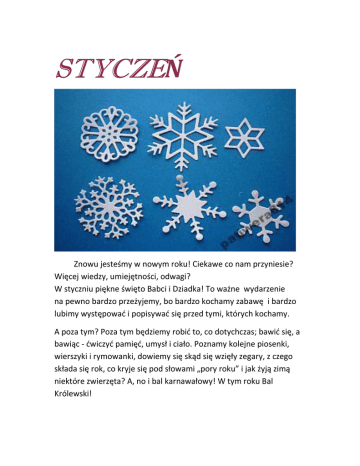 STYCZEŃ Znowu jesteśmy w nowym roku! Ciekawe co nam przyniesie? Więcej wiedzy, umiejętności, odwagi? W styczniu piękne święto Babci i Dziadka! To ważne wydarzenie na pewno bardzo przeżyjemy, bo bardzo kochamy zabawę i bardzo lubimy występować i popisywać się przed tymi, których kochamy. A poza tym? Poza tym będziemy robić to, co dotychczas; bawić się, a bawiąc - ćwiczyć pamięć, umysł i ciało. Poznamy kolejne piosenki, wierszyki i rymowanki, dowiemy się skąd się wzięły zegary, z czego składa się rok, co kryje się pod słowami „pory roku” i jak żyją zimą niektóre zwierzęta? A, no i bal karnawałowy! W tym roku Bal Królewski!