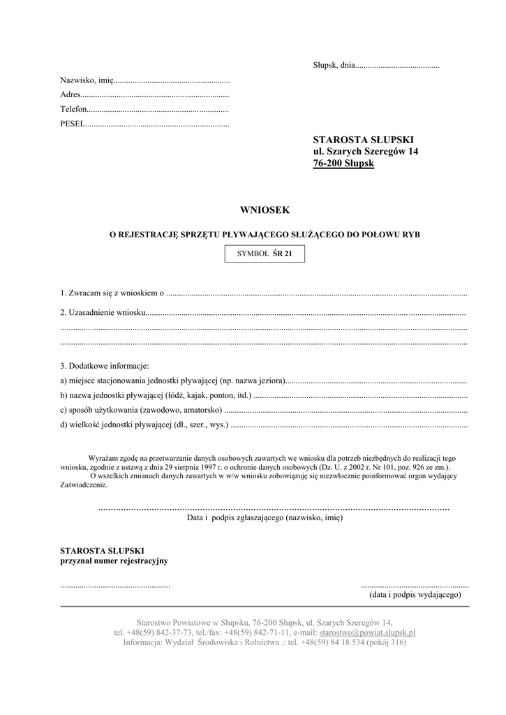 Słupsk, dnia........................................ Nazwisko, imię....................................................... Adres...................................................................... Telefon................................................................... PESEL.................................................................... STAROSTA SŁUPSKI ul. Szarych Szeregów 14 76-200 Słupsk WNIOSEK O REJESTRACJĘ SPRZĘTU PŁYWAJĄCEGO SŁUŻĄCEGO DO POŁOWU RYB SYMBOL ŚR 21 1. Zwracam się z wnioskiem o ........................................................................................................... ................................... 2. Uzasadnienie wniosku............................................................................................................................ ........................... ................................................................................................................................................................................................ ................................................................................................................................................................................................ 3. Dodatkowe informacje: a) miejsce stacjonowania jednostki pływającej (np. nazwa jeziora)...................................................................................... b) nazwa jednostki pływającej (łódź, kajak, ponton, itd.) ..................................................................................................... c) sposób użytkowania (zawodowo, amatorsko) ................................................................................................................... d) wielkość jednostki pływającej (dł., szer., wys.) ................................................................................................................ Wyrażam zgodę na przetwarzanie danych osobowych zawartych we wniosku dla potrzeb niezbędnych do realizacji tego wniosku, zgodnie z ustawą z dnia 29 sierpnia 1997 r. o ochronie danych osobowych (Dz. U. z 2002 r. Nr 101, poz. 926 ze zm.). O wszelkich zmianach danych zawartych w w/w wniosku zobowiązuję się niezwłocznie poinformować organ wydający Zaświadczenie. .......................................................................................................................................... Data i podpis zgłaszającego (nazwisko, imię) STAROSTA SŁUPSKI przyznał numer rejestracyjny .................................................... ................................................... (data i podpis wydającego) Starostwo Powiatowe w Słupsku, 76-200 Słupsk, ul. Szarych Szeregów 14, tel. +48(59) 842-37-73, tel./fax: +48(59) 842-71-11, e-mail: [email protected] Informacja: Wydział Środowiska i Rolnictwa .: tel. +48(59) 84 18 534 (pokój 316)