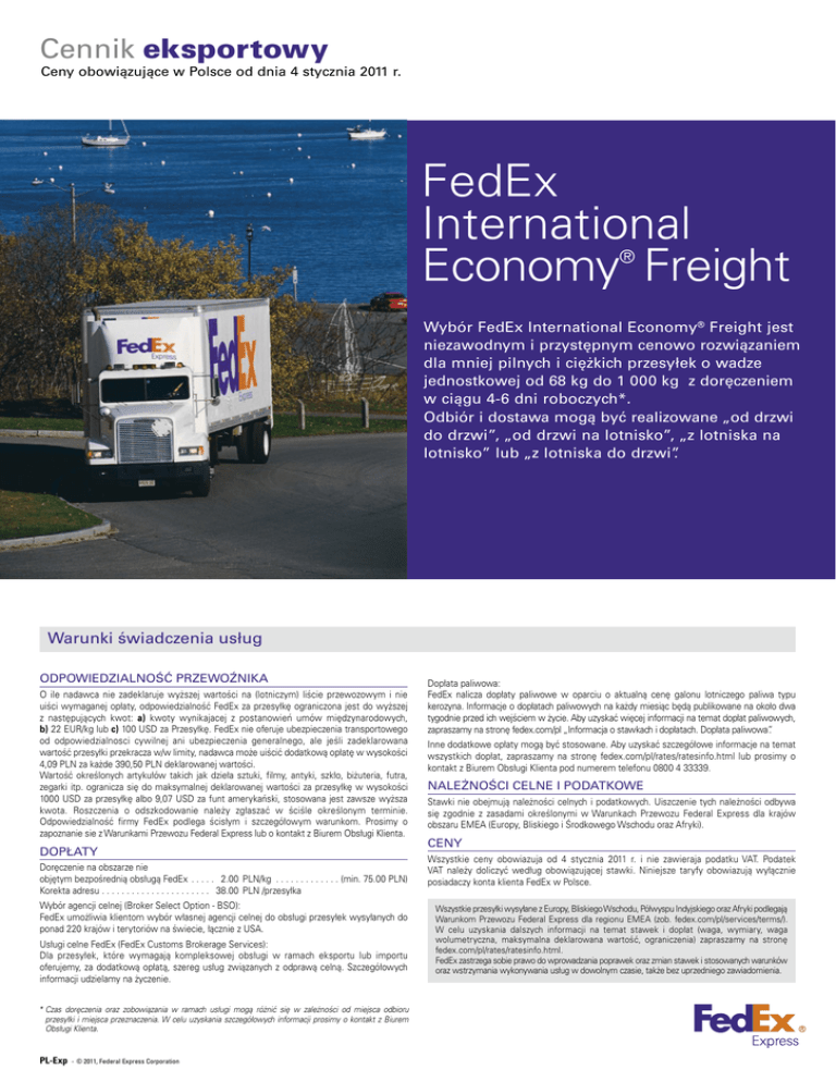 Cennik eksportowy Ceny obowiązujące w Polsce od dnia 4 stycznia 2011 r. FedEx International Economy Freight ® Wybór FedEx International Economy® Freight jest niezawodnym i przystępnym cenowo rozwiązaniem dla mniej pilnych i ciężkich przesyłek o wadze jednostkowej od 68 kg do 1 000 kg z doręczeniem w ciągu 4-6 dni roboczych*. Odbiór i dostawa mogą być realizowane „od drzwi do drzwi”, „od drzwi na lotnisko”, „z lotniska na lotnisko” lub „z lotniska do drzwi”. Warunki świadczenia usług ODPOWIEDZIALNOŚĆ PRZEWOŹNIKA O ile nadawca nie zadeklaruje wyższej wartości na (lotniczym) liście przewozowym i nie uiści wymaganej opłaty, odpowiedzialność FedEx za przesyłkę ograniczona jest do wyższej z następujących kwot: a) kwoty wynikajacej z postanowień umów międzynarodowych, b) 22 EUR/kg lub c) 100 USD za Przesyłkę. FedEx nie oferuje ubezpieczenia transportowego od odpowiedzialnosci cywilnej ani ubezpieczenia generalnego, ale jeśli zadeklarowana wartość przesyłki przekracza w/w limity, nadawca może uiścić dodatkową opłatę w wysokości 4,09 PLN za każde 390,50 PLN deklarowanej wartości. Wartość określonych artykułów takich jak dzieła sztuki, filmy, antyki, szkło, biżuteria, futra, zegarki itp. ogranicza się do maksymalnej deklarowanej wartości za przesyłkę w wysokości 1000 USD za przesyłkę albo 9,07 USD za funt amerykański, stosowana jest zawsze wyższa kwota. Roszczenia o odszkodowanie należy zgłaszać w ściśle określonym terminie. Odpowiedzialność firmy FedEx podlega ścisłym i szczegółowym warunkom. Prosimy o zapoznanie sie z Warunkami Przewozu Federal Express lub o kontakt z Biurem Obsługi Klienta. DOPŁATY Doręczenie na obszarze nie objętym bezpośrednią obsługą FedEx . . . . . . 2.00 PLN/kg�������������������������� (min. 75.00 PLN) Korekta adresu . . . . . . . . . . . . . . . . . . . . . 38.00 PLN /przesyłka Wybór agencji celnej (Broker Select Option - BSO): FedEx umożliwia klientom wybór własnej agencji celnej do obsługi przesyłek wysyłanych do ponad 220 krajów i terytoriów na świecie, łącznie z USA. Usługi celne FedEx (FedEx Customs Brokerage Services): Dla przesyłek, które wymagają kompleksowej obsługi w ramach eksportu lub importu oferujemy, za dodatkową opłatą, szereg usług związanych z odprawą celną. Szczegółowych informacji udzielamy na życzenie. * Czas doręczenia oraz zobowiązania w ramach usługi mogą różnić się w zależności od miejsca odbioru przesyłki i miejsca przeznaczenia. W celu uzyskania szczegółowych informacji prosimy o kontakt z Biurem Obsługi Klienta. PL-Exp - © 2011, Federal Express Corporation Dopłata paliwowa: FedEx nalicza dopłaty paliwowe w oparciu o aktualną cenę galonu lotniczego paliwa typu kerozyna. Informacje o dopłatach paliwowych na każdy miesiąc będą publikowane na około dwa tygodnie przed ich wejściem w życie. Aby uzyskać więcej informacji na temat dopłat paliwowych, zapraszamy na stronę fedex.com/pl „Informacja o stawkach i dopłatach. Dopłata paliwowa”. Inne dodatkowe opłaty mogą być stosowane. Aby uzyskać szczegółowe informacje na temat wszystkich dopłat, zapraszamy na stronę fedex.com/pl/rates/ratesinfo.html lub prosimy o kontakt z Biurem Obsługi Klienta pod numerem telefonu 0800 4 33339. NALEżNOŚCI CELNE I PODATKOWE Stawki nie obejmują należności celnych i podatkowych. Uiszczenie tych należności odbywa się zgodnie z zasadami określonymi w Warunkach Przewozu Federal Express dla krajów obszaru EMEA (Europy, Bliskiego i Środkowego Wschodu oraz Afryki). CENY Wszystkie ceny obowiazuja od 4 stycznia 2011 r. i nie zawieraja podatku VAT. Podatek VAT należy doliczyć według obowiązującej stawki. Niniejsze taryfy obowiazują wyłącznie posiadaczy konta klienta FedEx w Polsce. Wszystkie przesyłki wysyłane z Europy, Bliskiego Wschodu, Półwyspu Indyjskiego oraz Afryki podlegają Warunkom Przewozu Federal Express dla regionu EMEA (zob. fedex.com/pl/services/terms/). W celu uzyskania dalszych informacji na temat stawek i dopłat (waga, wymiary, waga wolumetryczna, maksymalna deklarowana wartość, ograniczenia) zapraszamy na stronę fedex.com/pl/rates/ratesinfo.html. FedEx zastrzega sobie prawo do wprowadzania poprawek oraz zmian stawek i stosowanych warunków oraz wstrzymania wykonywania usług w dowolnym czasie, także bez uprzedniego zawiadomienia. FedEx International Economy® Freight - Europa Ceny eksportowe obowiązujące w Polsce od dnia 4 stycznia 2011 r. Kraj Strefa Kraj Austria (UE) R Monaco S Belgia (UE) S Jak korzystać z cennika • Na podstawie listy krajów należy określić strefę miejsca doręczenia przesyłki. • Proszę określić wagę przesyłki i sprawdzić stawkę w odpowiedniej kolumnie. • Aby obliczyć cenę należy wybrać odpowiednią taryfę bazową i pomnożyć wartość za kilogram przez całkowitą wagę przesyłki. Strefa PROSTY SPOSÓB ZAMAWIANIA USŁUG Aby ustalić zamówienie i dokładny czas przewozu, prosimy o kontakt z Biurem Obsługi Klienta pod numerem telefonu 0800 4 33339. Dla dużych i ciężkich przesyłek należy zastosować FedEx® Expanded Service International Air Waybill. (UE) R Niemcy Norwegia U Chorwacja V Czechy (UE) R Portugalia (UE) Dania (UE) T Rosja U Estonia (UE) T (UE) Rumunia T MONITOROWANIE ŁADUNKÓW NA CAŁYM ŚWIECIE T W każdej chwili można sprawdzić online, gdzie znajduje się wysyłka, kiedy został dostarczony oraz poznać nazwisko odbiorcy, podając numer listu przewozowego na stronie fedex.com/pl. San Marino S Finlandia (UE) T Serbia V Francja (UE) S Słowacja (UE) T Słowenia (UE) T Hiszpania (UE) S Szwajcaria U Holandia (UE) S Szwecja Irlandia (UE) S Turcja U Litwa (UE) T Węgry (UE) R Łotwa (UE) T Wielka Brytania (UE) S Luksemburg (UE) S Włochy (UE) S (UE) MOŻESZ POLEGAĆ NA JAKOŚCI USŁUG FEDEX T Państwa wysyłka jest w dobrych rękach. Jakość naszyc