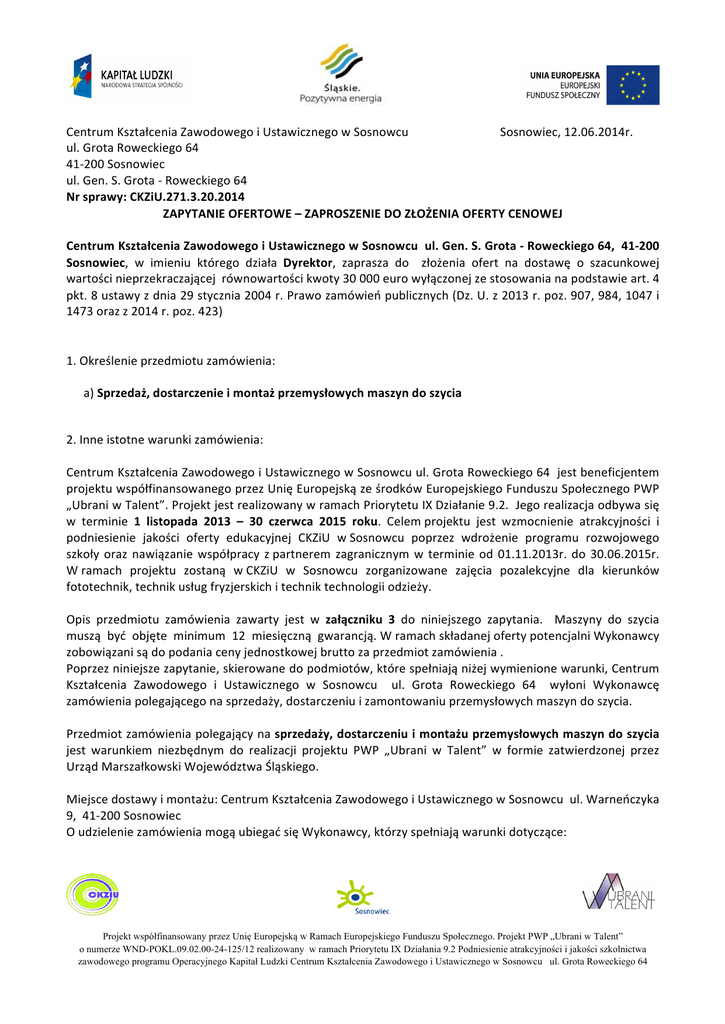 Centrum Kształcenia Zawodowego i Ustawicznego w Sosnowcu Sosnowiec, 12.06.2014r. ul. Grota Roweckiego 64 41-‐200 Sosnowiec ul. Gen. S. Grota -‐ Roweckiego 64 Nr sprawy: CKZiU.271.3.20.2014 ZAPYTANIE OFERTOWE – ZAPROSZENIE DO ZŁOŻENIA OFERTY CENOWEJ Centrum Kształcenia Zawodowego i Ustawicznego w Sosnowcu ul. Gen. S. Grota -‐ Roweckiego 64, 41-‐200 Sosnowiec, w imieniu którego działa Dyrektor, zaprasza do złożenia ofert na dostawę o szacunkowej wartości nieprzekraczającej równowartości kwoty 30 000 euro wyłączonej ze stosowania na podstawie art. 4 pkt. 8 ustawy z dnia 29 stycznia 2004 r. Prawo zamówień publicznych (Dz. U. z 2013 r. poz. 907, 984, 1047 i 1473 oraz z 2014 r. poz. 423) 1. Określenie przedmiotu zamówienia: a) Sprzedaż, dostarczenie i montaż przemysłowych maszyn do szycia 2. Inne istotne warunki zamówienia: Centrum Kształcenia Zawodowego i Ustawicznego w Sosnowcu ul. Grota Roweckiego 64 jest beneficjentem projektu współfinansowanego przez Unię Europejską ze środków Europejskiego Funduszu Społecznego PWP „Ubrani w Talent”. Projekt jest realizowany w ramach Priorytetu IX Działanie 9.2. Jego realizacja odbywa się w terminie 1 listopada 2013 – 30 czerwca 2015 roku. Celem projektu jest wzmocnienie atrakcyjności i podniesienie jakości oferty edukacyjnej CKZiU w Sosnowcu poprzez wdrożenie programu rozwojowego szkoły oraz nawiązanie współpracy z partnerem zagranicznym w terminie od 01.11.2013r. do 30.06.2015r. W ramach projektu zostaną w CKZiU w Sosnowcu zorganizowane zajęcia pozalekcyjne dla kierunków fototechnik, technik usług fryzjerskich i technik technologii odzieży. Opis przedmiotu zamówienia zawarty jest w załączniku 3 do niniejszego zapytania. Maszyny do szycia muszą być objęte minimum 12 miesięczną gwarancją. W ramach składanej oferty potencjalni Wykonawcy zobowiązani są do podania ceny jednostkowej brutto za przedmiot zamówienia . Poprzez niniejsze zapytanie, skierowane do podmiotów, które spełniają niżej wymienione warunki, Centrum Kształcenia Zawodowego i Ustawicznego w Sosnowcu ul. Grota Roweckiego 64 wyłoni Wykonawcę zamówienia polegającego na sprzedaży, dostarczeniu i zamontowaniu przemysłowych maszyn do szycia. Przedmiot zamówienia polegający na sprzedaży, dostarczeniu i montażu przemysłowych maszyn do szycia jest warunkiem niezbędnym do realizacji projektu PWP „Ubrani w Talent” w formie zatwierdzonej przez Urząd Marszałkowski Województwa Śląskiego. Miejsce dostawy i montażu: Centrum Kształcenia Zawodowego i Ustawicznego w Sosnowcu ul. Warneńczyka 9, 41-‐200 Sosnowiec O udzielenie zamówienia mogą ubiegać się Wykonawcy, którzy spełniają warunki dotyczące: Projekt współfinansowany przez Unię Europejską w Ramach Europejskiego Funduszu Społecznego. Projekt PWP „Ubrani w Talent” o numerze WND-POKL.09.02.00-24-125/12 realizowany w ramach Priorytetu IX Działania 9.2 Podniesienie atrakcyjności i jakości szkolnictwa zawodowego programu Operacyjnego Kapitał Ludzki Centrum Kształcenia Zawodowego i Ustawicznego w Sosnowcu ul. Grota Roweckiego 64 1) posiadania uprawnień do wykonywania określonej działalności lub czynności, jeżeli przepisy prawa nakładają obowiązek ich posiadania. Każdy z wykonawców zobowiązany jest do złożenia oświadczenia o spełnieniu warunków, o których mowa powyżej. 3. Termin realizacji zamówienia: czerwiec -‐ lipiec 2014 r. 4. Kryteria wyboru: cena -‐ 100 % 5. Oferta musi być napisana w języku polskim i podpisana przez osobę upoważnioną do reprezentowania firmy na zewnątrz. Oferta winna zawierać: Firma (Imię i Nazwisko), Adres, Nr tel.(kontaktowy), cena brutto (zawierająca ew. podatek VAT) za wykonanie Zamówienia (Załącznik 3) oraz oświadczenie o spełnianiu warunków udziału w postępowaniu (Załącznik 1), oświadczenie o zapoznaniu z opisem przedmiotu zamówienia i kosztach (Załącznik 2). 6. Ofertę należy złożyć do dnia 23 czerwca 2014r. do godziny 9.00 na jeden z wybranych sposobów: -‐ w siedzibie Zamawiającego w Centrum Kształcenia Zawodowego i Ustawicznego w Sosnowcu ul. Grota Roweckiego 64, sekretariat /parter/ -‐ mailem: [email protected] -‐ faxem: +48 32 266 06 82; +48 32 291 20 94 7. Osobą do kontaktu z Wykonawcami jest: Pani Edyta Cyganek – Asystent Kierownika Projektu, tel. 32 293 55 48 Sekretariat CKZiU +48 32 266 06 82; +48 32 291 20 94 8. Zamawiający udzieli zamówienia Wykonawcy, którego oferta odpowiada wszystkim wymaganiom przedstawionym w zapytaniu ofertowym i przedstawi najkorzystniejszą ofertę w oparciu o kryteria wyboru określone w zapytaniu ofertowym, z zastrzeżeniem pkt. 9. 9. W uzasadnionych przypadkach Zamawiający dopuszcza unieważnienie postępowania. Zatwierdzam Dyrektor CKZiU Elżbieta Czernik Projekt współfinansowany przez Unię Europejską w Ramach Europejskiego Funduszu Społecznego. Projekt PWP „Ubrani w Talent” o numerze WND-POKL.09.02.00-24-125/12 realizowany w ramach Priorytetu IX Działania 9.2 Podniesienie atrakcyjności i jakości szkolnictwa zawodowego programu Operacyjnego Kapitał Ludzki Centrum Kształcenia Zawodowego i Ustawicznego w Sosnowcu ul. Grota Roweckiego 64 Nr sprawy: CKZiU.271.3.20.2014 Wzór oferty: PWP „Ubrani w Talent” OFERTA na sprzedaż, dostarczenie i montaż przemysłowych maszyn do szycia dotycząca zamówienia poniżej 30 000 euro netto 1. WYKONAWCA: Nazwa podmiotu: ………………………………………………………………………………………………………………………………. Adres: ………………………………………………………………………………………………………………………………………………… Nr tel/fax.……………………………………………………………………………………………………………………………………………. e-‐mail……………………………………