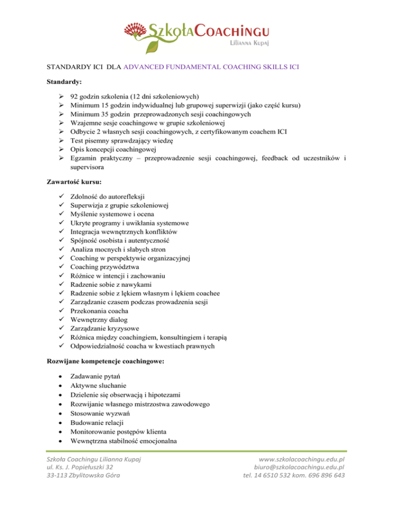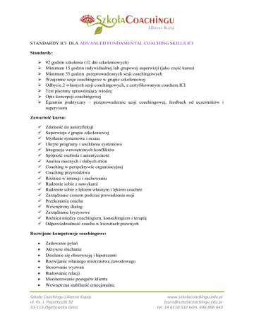 STANDARDY ICI DLA ADVANCED FUNDAMENTAL COACHING SKILLS ICI Standardy: 92 godzin szkolenia (12 dni szkoleniowych) Minimum 15 godzin indywidualnej lub grupowej superwizji (jako część kursu) Minimum 35 godzin przeprowadzonych sesji coachingowych Wzajemne sesje coachingowe w grupie szkoleniowej Odbycie 2 własnych sesji coachingowych, z certyfikowanym coachem ICI Test pisemny sprawdzający wiedzę Opis koncepcji coachingowej Egzamin praktyczny – przeprowadzenie sesji coachingowej, feedback od uczestników i supervisora Zawartość kursu: Zdolność do autorefleksji Superwizja z grupie szkoleniowej Myślenie systemowe i ocena Ukryte programy i uwikłania systemowe Integracja wewnętrznych konfliktów Spójność osobista i autentyczność Analiza mocnych i słabych stron Coaching w perspektywie organizacyjnej Coaching przywództwa Różnice w intencji i zachowaniu Radzenie sobie z nawykami Radzenie sobie z lękiem własnym i lękiem coachee Zarządzanie czasem podczas prowadzenia sesji Przekonania coacha Wewnętrzny dialog Zarządzanie kryzysowe Różnica między coachingiem, konsultingiem i terapią Odpowiedzialność coacha w kwestiach prawnych Rozwijane kompetencje coachingowe: Zadawanie pytań Aktywne sluchanie Dzielenie się obserwacją i hipotezami Rozwijanie własnego mistrzostwa zawodowego Stosowanie wyzwań Budowanie relacji Monitorowanie postępów klienta Wewnętrzna stabilność emocjonalna Szkoła Coachingu Lilianna Kupaj ul. Ks. J. Popiełuszki 32 33-113 Zbylitowska Góra www.szkolacoachingu.edu.pl [email protected] tel. 14 6510 532 kom. 696 896 643 Wyznaczanie celów Zarządzanie postępami w trakcie sesji coachingowej Obecność i uważność coachingowa Umiejętność refleksji w pracy z organizacjami, z perspektywy systemowej, indywidualnej i zespołowej Umiejętność budowania struktury sesji coachingowej i całego procesu coachingowego STANDARDY ICI DLA COACH ICI Standardy: Minimum 220 godzin szkolenia, trwającego 30 dni W ramach wymagań, może być zaliczone 18 dniowe szkolenie „Praktyk NLP” Minimum 10 godzin superwizji indywidualnej lub grupowej. Wzajemne sesje coachingowe w grupie szkoleniowej (co najmniej 3 w roli coacha i 3 w roli coachee) a) tematem pierwszej sesji coachingu jest wyjaśnienie i zawarcie kontraktu z klientem, b) przedmiotem drugiej sesji jest proces coachingowy, procedury interwencji i wykorzystanie najlepszych praktyk, c) trzecia sesja jest domknięciem procesu, konkretne wnioski do samodzielnego zarządzania i oceny. Odbycie 3 własnych sesji coachingowych z certyfikowanym coachem ICI Dodatkowo co najmniej 3 sesje coachingu dla klienta, z obszaru, w którym coach posiada doświadczenie praktyczne: a) tematem pierwszej sesji coachingu jest wyjaśnienie i zawarcie kontraktu z klientem, b) przedmiotem drugiej sesji jest proces coachingowy, procedury interwencji i wykorzystanie najlepszych praktyk, c) trzecia sesja jest domknięciem procesu, konkretne wnioski do samodzielnego zarządzania i oceny. Przynajmniej 80 godzin przeprowadzonych sesji coachingowych Test pisemny sprawdzający wiedzę Opis koncepcji coachingowej Egzamin praktyczny – przeprowadzenie sesji coachingowej, feedback od uczestników i supervisora Dodatkowo odpowiednie refleksje, studium przypadku i koncepcja coachingu w formie pisemnej Opis koncepcji coachingowej zawiera: a) Profil coacha b) Obszar kompetencji c) Koncepcję procesu coachingowego Szkoła Coachingu Lilianna Kupaj ul. Ks. J. Popiełuszki 32 33-113 Zbylitowska Góra www.szkolacoachingu.edu.pl [email protected] tel. 14 6510 532 kom. 696 896 643 d) Ocenę / rozeznanie rynku e) Zasady coachingu f) Osobista sieć kontaktów, zaawansowane szkolenie, superwizja i samoocena Minimalny wiek w momencie certyfikacji: 25 lat Zawartość kursu: Pozyskiwanie klientów Pozycjonowanie coacha Bezpieczeństwo i jego rola (zaufanie) Pierwsza sesja (wyjaśnienie dotyczące rezultatów coachingu, uzgodnienia kontraktu psychologicznego) Odpowiedzialność coacha w kwestiach prawnych Refleksja nad wyjaśnieniem relacji pomiędzy coachem i coachee (coachowaną osobą o świadomości coachingowej). Refleksja nad wyjaśnieniem relacji pomiędzy klientem (osoba o znikomej świadomości coachingowej) i coachem Zebranie informacji i czytelne wyjaśnienie rezultatów Zarządzanie celami klienta Strategie, metody, interwencje (narzędzia) Ekologia Przeniesienie nabytych umiejętności do praktyki coachingowej Użycie systemów reprezentacji w ustalaniu celów Informacja zwrotna Struktura pojedynczej sesji i całego procesu Zastosowanie poziomów neurologicznych Diltsa w procesie coachingowym Elastyczność w sytuacjach zablokowania Rozpoznanie ograniczających przekonań Autorefleksja coacha: a) b) c) d) e) f) g) h) postawa coacha zarządzanie stanem wewnętrznym coacha profil coacha obszar kompetencji koncepcja coacha granice coachingu (gdzie zaczyna się a gdzie kończy coaching) rozpoznawanie i tworzenie relacji coachingowych różnice pomiędzy coachingiem a poradnictwem czy terapią Podstawowa wiedza w zarządzaniu konfliktem: a) b) teoria konfliktu praca z konfliktami Szkoła Coachingu Lilianna Kupaj ul. Ks. J. Popiełuszki 32 33-113 Zbylitowska Góra www.szkolacoachingu.edu.pl [email protected] tel. 14 6510 532 kom. 696 896 643 c) potencjał konfliktu d) koszty konfliktów e) strategie rozwiązywania konfliktów f) zarządzanie kryzysowe g) programy redukcji stresu, zmiana perspektywy, zasady aktywnego postępowania z silnymi emocjami, rozpoznawanie efektów interakcji i sprzężenia zwrotnego Rozwijane kompetencje coachingowe: Pisemna dokumentacja studium przypadku Analiza i zmiana w odniesieniu do procesów długoterminowych Zdolność do autorefleksji Superwizja pod okiem kolegów coachów Zorientowanie na cel i rozbudowa własnego modelu świata Zdolność do tworzenia osobistego bilansu i zarządzania stresem Integracja wewnętrznych konfliktów Osobista spójność i autentyczność Rozwój, uczenie się i stosowanie nowych stra