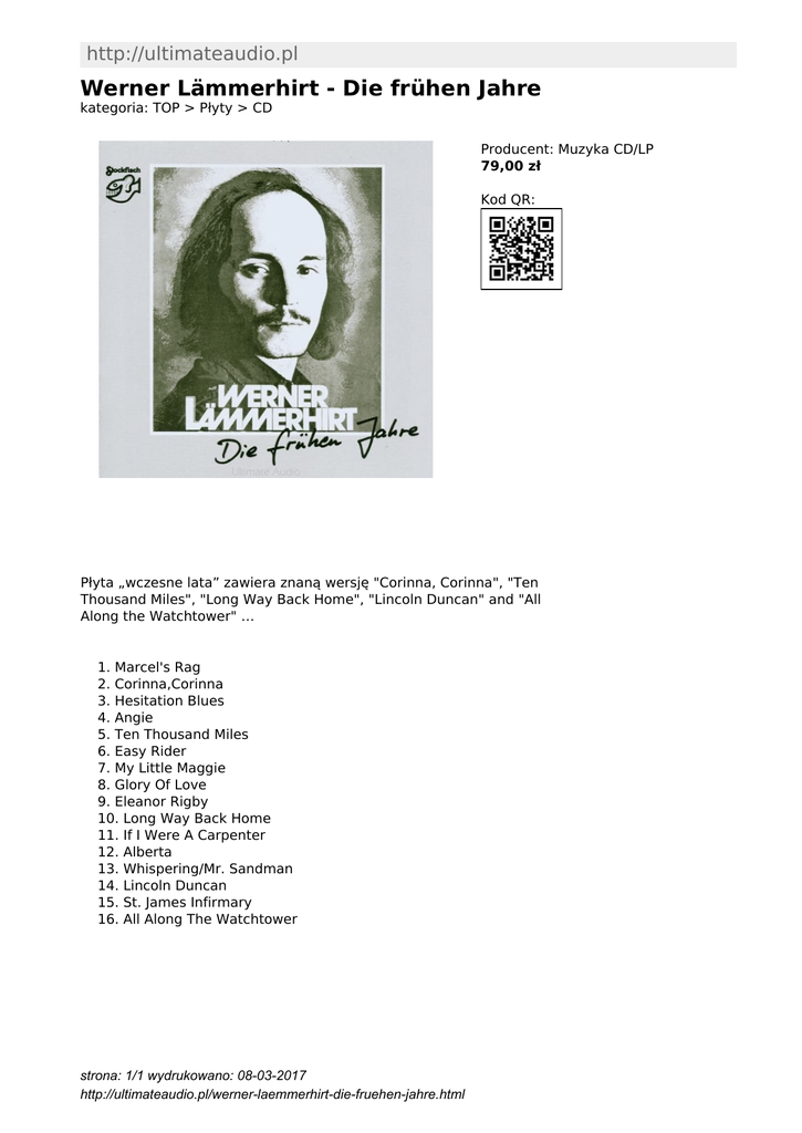 http://ultimateaudio.pl Werner Lämmerhirt - Die frühen Jahre kategoria: TOP > Płyty > CD Producent: Muzyka CD/LP 79,00 zł Kod QR: Płyta „wczesne lata” zawiera znaną wersję "Corinna, Corinna", "Ten Thousand Miles", "Long Way Back Home", "Lincoln Duncan" and "All Along the Watchtower" … 1. Marcel's Rag 2. Corinna,Corinna 3. Hesitation Blues 4. Angie 5. Ten Thousand Miles 6. Easy Rider 7. My Little Maggie 8. Glory Of Love 9. Eleanor Rigby 10. Long Way Back Home 11. If I Were A Carpenter 12. Alberta 13. Whispering/Mr. Sandman 14. Lincoln Duncan 15. St. James Infirmary 16. All Along The Watchtower strona: 1/1 wydrukowano: 08-03-2017 http://ultimateaudio.pl/werner-laemmerhirt-die-fruehen-jahre.html
