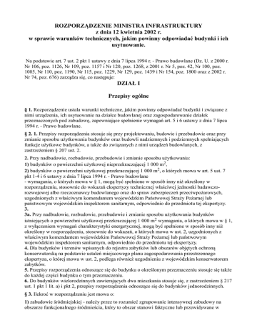 ROZPORZĄDZENIE MINISTRA INFRASTRUKTURY z dnia 12 kwietnia 2002 r. w sprawie warunków technicznych, jakim powinny odpowiadać budynki i ich usytuowanie. Na podstawie art. 7 ust. 2 pkt 1 ustawy z dnia 7 lipca 1994 r. - Prawo budowlane (Dz. U. z 2000 r. Nr 106, poz. 1126, Nr 109, poz. 1157 i Nr 120, poz. 1268, z 2001 r. Nr 5, poz. 42, Nr 100, poz. 1085, Nr 110, poz. 1190, Nr 115, poz. 1229, Nr 129, poz. 1439 i Nr 154, poz. 1800 oraz z 2002 r. Nr 74, poz. 676) zarządza się, co następuje: DZIAŁ I Przepisy ogólne § 1. Rozporządzenie ustala warunki techniczne, jakim powinny odpowiadać budynki i związane z nimi urządzenia, ich usytuowanie na działce budowlanej oraz zagospodarowanie działek przeznaczonych pod zabudowę, zapewniające spełnienie wymagań art. 5 i 6 ustawy z dnia 7 lipca 1994 r. - Prawo budowlane. § 2. 1. Przepisy rozporządzenia stosuje się przy projektowaniu, budowie i przebudowie oraz przy zmianie sposobu użytkowania budynków oraz budowli nadziemnych i podziemnych spełniających funkcje użytkowe budynków, a także do związanych z nimi urządzeń budowlanych, z zastrzeżeniem § 207 ust. 2. 2. Przy nadbudowie, rozbudowie, przebudowie i zmianie sposobu użytkowania: 1) budynków o powierzchni użytkowej nieprzekraczającej 1 000 m2, 2) budynków o powierzchni użytkowej przekraczającej 1 000 m2, o których mowa w art. 5 ust. 7 pkt 1-4 i 6 ustawy z dnia 7 lipca 1994 r. - Prawo budowlane - wymagania, o których mowa w § 1, mogą być spełnione w sposób inny niż określony w rozporządzeniu, stosownie do wskazań ekspertyzy technicznej właściwej jednostki badawczorozwojowej albo rzeczoznawcy budowlanego oraz do spraw zabezpieczeń przeciwpożarowych, uzgodnionych z właściwym komendantem wojewódzkim Państwowej Straży Pożarnej lub państwowym wojewódzkim inspektorem sanitarnym, odpowiednio do przedmiotu tej ekspertyzy. 3. 3a. Przy nadbudowie, rozbudowie, przebudowie i zmianie sposobu użytkowania budynków istniejących o powierzchni użytkowej przekraczającej 1 000 m2 wymagania, o których mowa w § 1, z wyłączeniem wymagań charakterystyki energetycznej, mogą być spełnione w sposób inny niż określony w rozporządzeniu, stosownie do wskazań, o których mowa w ust. 2, uzgodnionych z właściwym komendantem wojewódzkim Państwowej Straży Pożarnej lub państwowym wojewódzkim inspektorem sanitarnym, odpowiednio do przedmiotu tej ekspertyzy. 4. Dla budynków i terenów wpisanych do rejestru zabytków lub obszarów objętych ochroną konserwatorską na podstawie ustaleń miejscowego planu zagospodarowania przestrzennego ekspertyza, o której mowa w ust. 2, podlega również uzgodnieniu z wojewódzkim konserwatorem zabytków. 5. Przepisy rozporządzenia odnoszące się do budynku o określonym przeznaczeniu stosuje się także do każdej części budynku o tym przeznaczeniu. 6. Do budynków wielorodzinnych zawierających dwa mieszkania stosuje się, z zastrzeżeniem § 217 ust. 1 pkt 1 lit. a) i pkt 2, przepisy rozporządzenia odnoszące się do budynków jednorodzinnych. § 3. Ilekroć w rozporządzeniu jest mowa o: 1) zabudowie śródmiejskiej - należy przez to rozumieć zgrupowanie intensywnej zabudowy na obszarze funkcjonalnego śródmieścia, który to obszar stanowi faktyczne lub przewidywane w miejscowym planie zagospodarowania przestrzennego centrum miasta lub dzielnicy miasta, 2) zabudowie jednorodzinnej - należy przez to rozumieć jeden budynek mieszkalny jednorodzinny lub zespół takich budynków, wraz z budynkami garażowymi i gospodarczymi, 3) zabudowie zagrodowej - należy przez to rozumieć w szczególności budynki mieszkalne, budynki gospodarcze lub inwentarskie w rodzinnych gospodarstwach rolnych, hodowlanych lub ogrodniczych oraz w gospodarstwach leśnych, 4) budynku mieszkalnym - należy przez to rozumieć: a) budynek mieszkalny wielorodzinny, b) budynek mieszkalny jednorodzinny, 5) budynku zamieszkania zbiorowego - należy przez to rozumieć budynek przeznaczony do okresowego pobytu ludzi, w szczególności hotel, motel, pensjonat, dom wypoczynkowy, dom wycieczkowy, schronisko młodzieżowe, schronisko, internat, dom studencki, budynek koszarowy, budynek zakwaterowania na terenie zakładu karnego, aresztu śledczego, zakładu poprawczego, schroniska dla nieletnich, a także budynek do stałego pobytu ludzi, w szczególności dom dziecka, dom rencistów i dom zakonny, 6) budynku użyteczności publicznej - należy przez to rozumieć budynek przeznaczony na potrzeby administracji publicznej, wymiaru sprawiedliwości, kultury, kultu religijnego, oświaty, szkolnictwa wyższego, nauki, wychowania, opieki zdrowotnej, społecznej lub socjalnej, obsługi bankowej, handlu, gastronomii, usług, w tym usług pocztowych lub telekomunikacyjnych, turystyki, sportu, obsługi pasażerów w transporcie kolejowym, drogowym, lotniczym, morskim lub wodnym śródlądowym, oraz inny budynek przeznaczony do wykonywania podobnych funkcji; za budynek użyteczności publicznej uznaje się także budynek biurowy lub socjalny, 7) budynku rekreacji indywidualnej - należy przez to rozumieć budynek przeznaczony do okresowego wypoczynku, 8) budynku gospodarczym - należy przez to rozumieć budynek przeznaczony do niezawodowego wykonywania prac warsztatowych oraz do przechowywania materiałów, narzędzi, sprzętu i płodów rolnych służących mieszkańcom budynku mieszkalnego, budynku zamieszkania zbiorowego, budynku rekreacji indywidualnej, a także ich otoczenia, a w zabudowie zagrodowej przeznaczony również do przechowywania środków produkcji rolnej i sprzętu oraz płodów rolnych, 9) mieszkaniu - należy przez to rozumieć zespół pomieszczeń mieszkalnych i pomocniczych, mający odrębne wejście, wydzielony stałymi przegrodami budowlanymi, umożliwiający stały pobyt ludzi i prowadzenie samodzielnego gospodarstwa domowego, 10) pomieszczeniu mieszkalnym - należy przez to rozumieć pokoje w mieszkaniu, a także sypialnie i pomieszc