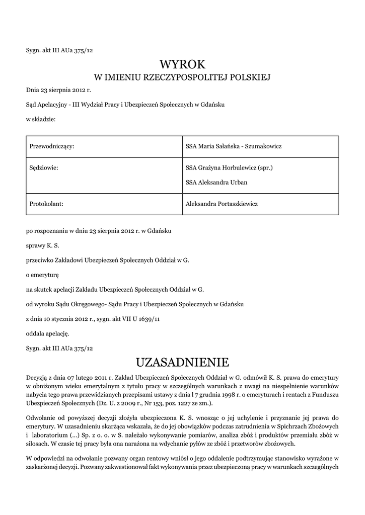 Sygn. akt III AUa 375/12 WYROK W IMIENIU RZECZYPOSPOLITEJ POLSKIEJ Dnia 23 sierpnia 2012 r. Sąd Apelacyjny - III Wydział Pracy i Ubezpieczeń Społecznych w Gdańsku w składzie: Przewodniczący: SSA Maria Sałańska - Szumakowicz Sędziowie: SSA Grażyna Horbulewicz (spr.) SSA Aleksandra Urban Protokolant: Aleksandra Portaszkiewicz po rozpoznaniu w dniu 23 sierpnia 2012 r. w Gdańsku sprawy K. S. przeciwko Zakładowi Ubezpieczeń Społecznych Oddział w G. o emeryturę na skutek apelacji Zakładu Ubezpieczeń Społecznych Oddział w G. od wyroku Sądu Okręgowego- Sądu Pracy i Ubezpieczeń Społecznych w Gdańsku z dnia 10 stycznia 2012 r., sygn. akt VII U 1639/11 oddala apelację. Sygn. akt III AUa 375/12 UZASADNIENIE Decyzją z dnia 07 lutego 2011 r. Zakład Ubezpieczeń Społecznych Oddział w G. odmówił K. S. prawa do emerytury w obniżonym wieku emerytalnym z tytułu pracy w szczególnych warunkach z uwagi na niespełnienie warunków nabycia tego prawa przewidzianych przepisami ustawy z dnia l 7 grudnia 1998 r. o emeryturach i rentach z Funduszu Ubezpieczeń Społecznych (Dz. U. z 2009 r., Nr 153, poz. 1227 ze zm.). Odwołanie od powyższej decyzji złożyła ubezpieczona K. S. wnosząc o jej uchylenie i przyznanie jej prawa do emerytury. W uzasadnieniu skarżąca wskazała, że do jej obowiązków podczas zatrudnienia w Spichrzach Zbożowych i laboratorium (...) Sp. z o. o. w S. należało wykonywanie pomiarów, analiza zbóż i produktów przemiału zbóż w silosach. W czasie tej pracy była ona narażona na wdychanie pyłów ze zbóż i przetworów zbożowych. W odpowiedzi na odwołanie pozwany organ rentowy wniósł o jego oddalenie podtrzymując stanowisko wyrażone w zaskarżonej decyzji. Pozwany zakwestionował fakt wykonywania przez ubezpieczoną pracy w warunkach szczególnych w okresie zatrudnienia od 09 lipca 1975 r. do 31 grudnia 1998 r. w Wojewódzkim Przedsiębiorstwie (...) w G. na stanowiskach : laborant, starszy laborant. straszy referent ds. sprzedaży i handlu, albowiem ubezpieczona nie przedłożyła świadectwa wykonywania pracy w warunkach szczególnych. Nadto, w ocenie pozwanego, ubezpieczona będąc zatrudniona na ww. stanowiskach nie wykonywała pracy w warunkach szczególnych stale i w pełnym wymiarze czasu pracy. Sąd Okręgowy w Gdańsku VII Wydział Pracy i Ubezpieczeń Społecznych wyrokiem z dnia 10 stycznia 2012r. wydanym w sprawie VII U 1639/11 zmienił zaskarżoną decyzję w ten sposób, że przyznał wnioskodawczyni K. S. prawo do emerytury z tytułu pracy w warunkach szczególnych od dnia 01 grudnia 2010r. ( pkt. 1 ), nie stwierdził odpowiedzialności organu rentowego za nieustalenie ostatniej okoliczności niezbędnej do wydania zaskarżonej decyzji ( pkt.2). Powyższe rozstrzygnięcie Sąd I instancji oparł na następujących ustaleniach i rozważaniach. Ubezpieczona K. S., urodzona dnia (...), w dniu 31 grudnia 2010 r. złożyła w Zakładzie Ubezpieczeń Społecznych Oddział w G. wniosek o emeryturę. Wnioskodawczyni nie jest członkiem Otwartego Funduszu Emerytalnego i nie pozostaje w stosunku pracy. W toku postępowania przed organem rentowym ubezpieczona udowodniła na dzień 01 stycznia 1999 r. 23 lata, 9 miesięcy i 5 dni okresów składkowych i nieskładkowych. Zaskarżoną w niniejszej sprawie decyzją z dnia 07 lutego 2011 r. Zakład Ubezpieczeń Społecznych Oddział w G. odmówił K. S. prawa do emerytury w obniżonym wieku emerytalnym z tytułu pracy w szczególnych warunkach z uwagi na niespełnienie warunków nabycia tego prawa. tj. wobec nie udowodnienia żadnego okresu pracy w szczególnych warunkach. Wnioskodawczyni K. S. w okresie od dnia 09 lipca 1975 r. do dnia 30 września 2000 r. zatrudniona była w (...) Sp. z o.o. w upadłości w S. (poprzednia nazwa Wojewódzkie Przedsiębiorstwo (...) w G. Zakłady (...) w S.) na następujących stanowiskach : laboranta (od dnia 09 lipca 1975 r. do dnia 31 sierpnia 1992 r.), starszego laboranta (od dnia 01 września 1992 r. do dnia 31 marca 2000 r.) i starszego referenta ds. sprzedaży i handlu (od dnia 01 kwietnia 2000 r. do dnia 30 września 2000 r.). Do zakresu obowiązków Wnioskodawczyni jako laborantki należało m.in. wykonywanie pełnych analiz zbóż przyjmowanych do młyna, wystawianie i przekazywanie analiz magazynierowi magazynu zbożowego w obowiązującym terminie, wykonywanie pełnych analiz międzyproduktów przemiału, przetworów końcowych, głównych i ubocznych wg obowiązujących norm, wykonywanie wszelkich analiz dodatkowych wynikających z bieżących potrzeb produkcji, wykonywanie raz na 30 dni kontroli zbóż w silosach, przeprowadzanie kontroli przetworów gotowych przeznaczonych do wysyłki oraz kontroli opakowań przyjmowanych do magazynu, a także przeprowadzanie kontroli prawidłowości etykietowania przetworów, ich znakowania. Wnioskodawczyni wykonywała wszystkie prace wynikające z przedłożonego jej zakresu obowiązków. Praca ta polegała na tym. iż kilkukrotnie na swojej zmianie (laborantki pracowały w systemie trzyzmianowym) musiała udać się bezpośrednio na produkcję do młyna i pobrać odpowiednie próbki, z którymi następnie wracała do laboratorium i poddawała je analizie. W tym celu, najpierw przygotowywała naczyńka do spalania próbek, po czym wstawiała je do pieca, gdzie w temperaturze 980 stopni ulegały one spaleniu. Badaniu podlegał popiół z tychże próbek. Wnioskodawczyni pobierała próbki na wszystkich etapach produkcji wyrobów produkowanych w zakładzie (mąki. kasz, płatków, opakowań papierowych i jutowych), a także przy przyjęciu zbóż z dostaw zbożowych bezpośrednio od rolników. Ponadto kontrolowała ona również kwasowość i wilgotność popiolowości oraz dokonywała oceny organoleptycznej. Była to praca w warunkach szkodliwych dla zdrowia, gdyż przy spalaniu próbek wydobywał się dym. Pracę tę Wnioskodawczyni wykonywała stale i w pełnym wymiarze czasu pracy. Razem z wnioskodawczy