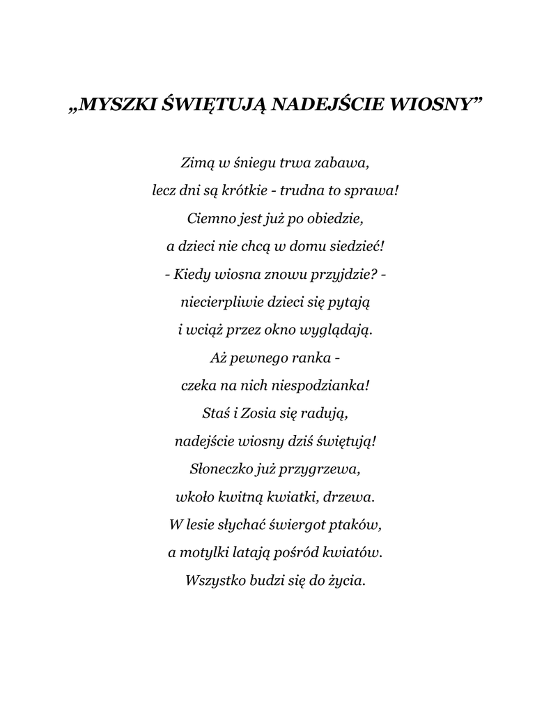 „MYSZKI ŚWIĘTUJĄ NADEJŚCIE WIOSNY” Zimą w śniegu trwa zabawa, lecz dni są krótkie - trudna to sprawa! Ciemno jest już po obiedzie, a dzieci nie chcą w domu siedzieć! - Kiedy wiosna znowu przyjdzie? niecierpliwie dzieci się pytają i wciąż przez okno wyglądają. Aż pewnego ranka czeka na nich niespodzianka! Staś i Zosia się radują, nadejście wiosny dziś świętują! Słoneczko już przygrzewa, wkoło kwitną kwiatki, drzewa. W lesie słychać świergot ptaków, a motylki latają pośród kwiatów. Wszystko budzi się do życia. I rośliny i zwierzęta, nikt o zimie już nie pamięta. Myszki bawią się na łące, gdzie stokrotek są tysiące. Zosia pomysł ma wspaniały: - Nazbierajmy kwiatów koszyk cały! Staś zaklaskał w łapki obie. - Dla rodziców bukiet zrobię! Zachwyceni są kwiatkami, tną łodyżki swoimi ząbkami. Gdy się koszyki zapełniły, myszki do domu wyruszyły. - Stasiu posłuchaj, co zrobimy święto wiosny urządzimy! Chodźmy szybko do mieszkanka będzie dla rodziców niespodzianka! Na zegarze już dwunasta, zaraz rodzice wrócą z miasta. Wpuśćmy do mieszkania wiosnę, słoneczko ciepłe i radosne! Drzwi i okna otworzymy i stokrotki rozrzucimy. Nie będziemy trzymać ich w wazonie, dom niech cały w kwiatach tonie. Staś i Zosia podskakują, aż stokrotki wkoło wirują. Na podłogę kwiaty opadają i każdy kącik podłogi wypełniają. Szybko się pokój zazielenił i w pachnącą łąkę zmienił. - Mama będzie zachwycona! - woła Zosia ucieszona. Już rodzice wracają i zdziwieni w progu domku stają. A kto tu tak naśmiecił? - Niespodzianka - wołają dzieci!!! Mama tak z wrażenia zbladła, że na schodach, aż usiadła. Rozejrzała się po kątach. - Dzieci! Kto teraz to posprząta? Staś i Zosia posmutnieli. - Przecież pomysł był wspaniały! Dlaczego na nas się złościcie? Czy już kwiatków nie lubicie? - Ależ dzieci - mówi mama kwiatki więdną, popatrzcie sami. Czyż nie piękniejsze są na łące? Tam gdzie woda i słońce. Na podłodze one usychają i trochę przeszkadzają. Trzeba szybko je wyrzucić zanim ktoś się przez nie przewróci. Z miotłą stoi smutna Zosia, cicho woła w stronę Stasia. - Dziwne mamy wiosny świętowanie, nie zabawa, lecz sprzątanie. Lecz się jednak przekonała, że to mama rację miała. Martyna Barczak klasa 6d