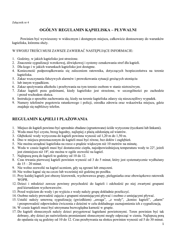 Załącznik nr 4 OGÓLNY REGULAMIN KĄPIELISKA – PŁYWALNI Powinien być wywieszony w widocznym i dostępnym miejscu, całkowicie dostosowany do warunków kąpieliska, któremu słuŜy. W SWOJEJ TREŚCI MUSI ZAWSZE ZAWIERAĆ NASTĘPUJĄCE INFORMACJE: 1. 2. 3. 4. 5. 1. 6. 7. 8. 9. Godziny, w jakich kąpielisko jest strzeŜone. Znaczenie sygnalizacji wzrokowej, dźwiękowej i systemy oznakowania stref dla kąpieli. Dla kogo i w jakich warunkach kąpielisko jest dostępne. Konieczność podporządkowania się zaleceniom ratownika, dotyczących bezpieczeństwa na terenie kąpieliska. Zakaz wszczynania fałszywych alarmów i prowokowania sytuacji groŜących utonięciu lub innym wypadkiem. Zakaz spoŜywania alkoholu i przebywania na tym terenie osobom w stanie nietrzeźwym. Zakaz kąpieli poza godzinami, kiedy kąpielisko jest strzeŜone, w szczególności po zachodzie i przed wschodem słońca. Instrukcja o sposobie zachowania się, kiedy na terenie kąpieliska zdarzy się nieszczęśliwy wypadek. Numery telefonów pogotowia ratunkowego i policji, ośrodka zdrowia oraz wskazówka miejscu, gdzie znajduje się najbliŜszy telefon. REGULAMIN KĄPIELI I PLAśOWANIA 1. 2. 3. 4. 5. 6. Miejsce do kąpieli powinno być uprzednio zbadane (zgruntowane) ściśle wytyczone (tyczkami lub linkami). Woda musi być czysta, brzeg łagodny, najlepiej z plaŜą odsłoniętą od wiatrów. Głębokość wody wytyczona do kąpieli powinna wynosić od 1,20 m do 1,50 m. Dno w miejscu przeznaczonym do kąpieli musi być równe, bez dołów i zagłębień. Nie moŜna urządzać kąpieliska na rzece o prądzie większym niŜ 10 metrów na minutę. Woda w czasie kąpieli musi być dostatecznie ciepła, najodpowiedniejszą temperatura wody to 22º, jeŜeli jest zimniejsza niŜ 18º, nie moŜna w ogóle zezwolić na kąpiel. 7. Najlepszą porą do kąpieli to godziny od 10 do 12. 8. Czas trwania pierwszej kąpieli powinien wynosić od 3 do 5 minut, który jest systematycznie wydłuŜany do 15 – 20 minut. 9. Nie wolno zezwolić na kąpiel uczniom, gdy są zgrzani lub zmęczeni. 10. Nie wolno kąpać się na czczo lub wcześniej niŜ godzinę po posiłku. 11. Przy kaŜdej kąpieli jest obecny kierownik, wychowawca grupy, pielęgniarka oraz obowiązkowo ratownik WOPR. 12. Dzieci i młodzieŜ zawsze powinny przychodzić do kąpieli i odchodzić po niej zwartymi grupami pod kierunkiem wychowawców. 13. Przed wejściem do wody i po wyjściu z wody naleŜy grupę dokładnie przeliczyć. 14. Osobno naleŜy prowadzić zajęcia z grupami nieumiejącymi pływać i osobno z umiejącymi pływać. 15. Ustalić naleŜy umowną sygnalizację (gwizdkiem) „uwaga”, „z wody”, „koniec kąpieli”, „alarm” i przeprowadzić odpowiednie ćwiczenia z dziećmi w celu dokładnego zaznajomienia ich z sygnalizacją. 16. W czasie kąpieli musi być utrzymana bezwzględna karność w grupie. 17. Do kąpieli słonecznych naleŜy dzieci przygotować kąpielami powietrznymi. Teren powinien być tak dobrany, aby dzieci po naświetleniu promieniami słonecznymi mogły odpocząć w cieniu. Najlepszą porą do opalania się są godziny od 10 do 12. Czas przebywania na słońcu powinien wynosić od 5 do 30 minut. 1