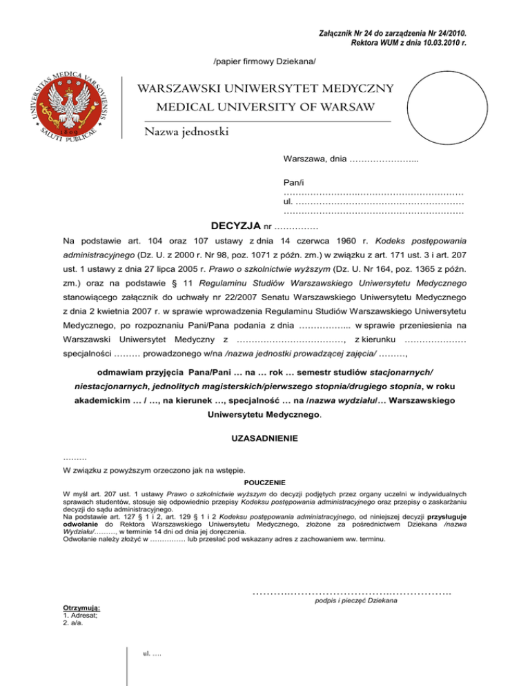 Załącznik Nr 24 do zarządzenia Nr 24/2010. Rektora WUM z dnia 10.03.2010 r. /papier firmowy Dziekana/ Warszawa, dnia …………………... Pan/i …………………….……………………………… ul. ………………………………………………… ……………………………………………………. DECYZJA nr …………… Na podstawie art. 104 oraz 107 ustawy z dnia 14 czerwca 1960 r. Kodeks postępowania administracyjnego (Dz. U. z 2000 r. Nr 98, poz. 1071 z późn. zm.) w związku z art. 171 ust. 3 i art. 207 ust. 1 ustawy z dnia 27 lipca 2005 r. Prawo o szkolnictwie wyższym (Dz. U. Nr 164, poz. 1365 z późn. zm.) oraz na podstawie § 11 Regulaminu Studiów Warszawskiego Uniwersytetu Medycznego stanowiącego załącznik do uchwały nr 22/2007 Senatu Warszawskiego Uniwersytetu Medycznego z dnia 2 kwietnia 2007 r. w sprawie wprowadzenia Regulaminu Studiów Warszawskiego Uniwersytetu Medycznego, po rozpoznaniu Pani/Pana podania z dnia ……………... w sprawie przeniesienia na Warszawski Uniwersytet Medyczny z ………………………………, z kierunku ………………… specjalności ……… prowadzonego w/na /nazwa jednostki prowadzącej zajęcia/ ………, odmawiam przyjęcia Pana/Pani … na … rok … semestr studiów stacjonarnych/ niestacjonarnych, jednolitych magisterskich/pierwszego stopnia/drugiego stopnia, w roku akademickim … / …, na kierunek …, specjalność … na /nazwa wydziału/… Warszawskiego Uniwersytetu Medycznego. UZASADNIENIE ……… W związku z powyższym orzeczono jak na wstępie. POUCZENIE W myśl art. 207 ust. 1 ustawy Prawo o szkolnictwie wyższym do decyzji podjętych przez organy uczelni w indywidualnych sprawach studentów, stosuje się odpowiednio przepisy Kodeksu postępowania administracyjnego oraz przepisy o zaskarżaniu decyzji do sądu administracyjnego. Na podstawie art. 127 § 1 i 2, art. 129 § 1 i 2 Kodeksu postępowania administracyjnego, od niniejszej decyzji przysługuje odwołanie do Rektora Warszawskiego Uniwersytetu Medycznego, złożone za pośrednictwem Dziekana /nazwa Wydziału/………, w terminie 14 dni od dnia jej doręczenia. Odwołanie należy złożyć w …………… lub przesłać pod wskazany adres z zachowaniem ww. terminu. ………..………………………..…………….. podpis i pieczęć Dziekana Otrzymują: 1. Adresat; 2. a/a. ul. ….