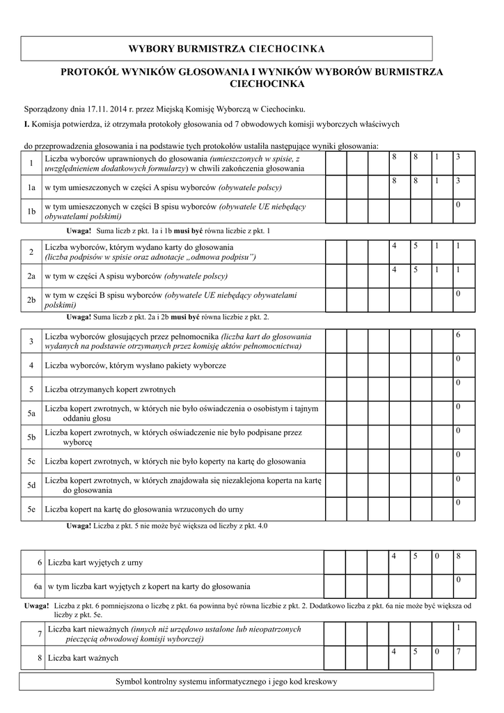 WYBORY BURMISTRZA CIECHOCINKA PROTOKÓŁ WYNIKÓW GŁOSOWANIA I WYNIKÓW WYBORÓW BURMISTRZA CIECHOCINKA Sporządzony dnia 17.11. 2014 r. przez Miejską Komisję Wyborczą w Ciechocinku. I. Komisja potwierdza, iż otrzymała protokoły głosowania od 7 obwodowych komisji wyborczych właściwych do przeprowadzenia głosowania i na podstawie tych protokołów ustaliła następujące wyniki głosowania: Liczba wyborców uprawnionych do głosowania (umieszczonych w spisie, z 1 uwzględnieniem dodatkowych formularzy) w chwili zakończenia głosowania 1a w tym umieszczonych w części A spisu wyborców (obywatele polscy) 1b w tym umieszczonych w części B spisu wyborców (obywatele UE niebędący obywatelami polskimi) 8 8 1 3 8 8 1 3 0 Uwaga! Suma liczb z pkt. 1a i 1b musi być równa liczbie z pkt. 1 2 Liczba wyborców, którym wydano karty do głosowania (liczba podpisów w spisie oraz adnotacje „odmowa podpisu”) 2a w tym w części A spisu wyborców (obywatele polscy) 2b w tym w części B spisu wyborców (obywatele UE niebędący obywatelami polskimi) 4 5 1 1 4 5 1 1 0 Uwaga! Suma liczb z pkt. 2a i 2b musi być równa liczbie z pkt. 2. 6 3 Liczba wyborców głosujących przez pełnomocnika (liczba kart do głosowania wydanych na podstawie otrzymanych przez komisję aktów pełnomocnictwa) 4 Liczba wyborców, którym wysłano pakiety wyborcze 5 Liczba otrzymanych kopert zwrotnych 5a Liczba kopert zwrotnych, w których nie było oświadczenia o osobistym i tajnym oddaniu głosu 0 5b Liczba kopert zwrotnych, w których oświadczenie nie było podpisane przez wyborcę 0 5c Liczba kopert zwrotnych, w których nie było koperty na kartę do głosowania 5d Liczba kopert zwrotnych, w których znajdowała się niezaklejona koperta na kartę do głosowania 5e Liczba kopert na kartę do głosowania wrzuconych do urny 0 0 0 0 0 Uwaga! Liczba z pkt. 5 nie może być większa od liczby z pkt. 4.0 6 Liczba kart wyjętych z urny 4 5 0 8 0 6a w tym liczba kart wyjętych z kopert na karty do głosowania Uwaga! Liczba z pkt. 6 pomniejszona o liczbę z pkt. 6a powinna być równa liczbie z pkt. 2. Dodatkowo liczba z pkt. 6a nie może być większa od liczby z pkt. 5e. 7 1 Liczba kart nieważnych (innych niż urzędowo ustalone lub nieopatrzonych pieczęcią obwodowej komisji wyborczej) 8 Liczba kart ważnych Symbol kontrolny systemu informatycznego i jego kod kreskowy 4 5 0 7 -19 Liczba głosów nieważnych (z kart ważnych) 8 9 9a w tym liczba głosów nieważnych z powodu postawienia znaku „X” obok nazwiska dwóch lub większej liczby kandydatów 3 9 9b w tym liczba głosów nieważnych z powodu niepostawienia znaku „X” obok nazwiska żadnego kandydata 4 7 9c w tym liczba głosów nieważnych z powodu postawienia znaku „X” wyłącznie obok skreślonego nazwiska kandydata 0 Uwaga! Suma liczb z pkt 9a. – 9c. musi być równa lub mniejsza od liczby z pkt 9. 10 4 Liczba głosów ważnych oddanych łącznie na wszystkich kandydatów (z kart ważnych) 4 1 8 Uwaga! Suma liczb z pkt. 9 i 10 musi być równa liczbie z pkt. 8. Na poszczególnych kandydatów na wójta, burmistrza, prezydenta miasta*) oddano następujące liczby głosów ważnych: 11. Lp. Nazwisko i imię - imiona Zgłoszony przez Komitet Wyborczy Liczba głosów ważnych 1. Dzierżewicz Leszek Mirosław KWW Dla Przyszłości Ciechocinka 2. Kanaś Paweł Antoni 3. Stefaniak-Mansour Edyta Joanna 2 6 2 5 KW Prawo i Sprawiedliwość 9 9 7 KW Platforma Obywatelska RP 7 9 6 4 1 8 Razem 4 Uwaga! Suma głosów oddanych na wszystkich kandydatów (rubryka „Razem” i głosów nieważnych (pkt 9) musi być równa liczbie z pkt 8, czyli liczbie kart ważnych. II. Komisja stwierdziła, że: 12. Liczba głosów stanowiąca więcej niż połowę głosów ważnych wymagana dla wyboru burmistrza miasta wynosi 2210. 13.1) Wymaganą liczbę głosów uzyskał i został wybrany na burmistrza miasta. Nazwisko i imię - imiona Dzierżewicz Leszek Mirosław Zgłoszony przez Komitet Wyborczy KWW Dla Przyszłości Ciechocinka 14. 1)2) Żaden z kandydatów nie uzyskał wymaganej liczby głosów; do wyborów w ponownym głosowaniu dopuszczeni zostali dwaj kandydaci, którzy uzyskali największą liczbę głosów: Lp. Nazwisko i imię - imiona Zgłoszony przez Komitet Wyborczy 1. 2. 2)3) Następujący kandydaci: Lp. Nazwisko i imię - imiona Zgłoszony przez Komitet Wyborczy 1. 2. uzyskali równe liczby głosów; o dopuszczeniu do wyborów w ponownym głosowaniu zdecydowała większa liczba obwodów, w których kandydat uzyskał więcej głosów. Kandydatem tym jest ......................................................, który uzyskał więcej głosów w ........ obwodach głosowania; (nazwisko i imię-imiona kandydata) (liczba) -2natomiast kandydat .................................................. uzyskał więcej głosów w ........ obwodach głosowania. (nazwisko i imię-imiona kandydata) (liczba) 3) 3) Następujący kandydaci: Lp. Zgłoszony przez Komitet Wyborczy Nazwisko i imię - imiona 1. 2. uzyskali równe liczby głosów i otrzymali więcej głosów w takiej samej liczbie ............. obwodów, o dopuszczeniu (liczba) do wyborów w ponownym głosowaniu rozstrzygnęło losowanie. Kandydatem wylosowanym jest .................................................................... . (nazwisko i imię-imiona kandydata) ............................................................................................................................................................................................... (opis przebiegu losowania) III. UWAGI I ADNOTACJE 15.**) Adnotacja o wniesieniu przez osoby pełniące funkcję mężów zaufania uwag z wymienieniem konkretnych zarzutów ***); jeżeli nie ma, wpisać „brak zarzutów” lub „brak osób pełniących funkcję mężów zaufania”: brak osób pełniących funkcję mężów zaufania. **) 16. Adnotacja o wniesieniu przez członków Komisji uwag z wymienieniem konkretnych zarzutów ***); jeżeli nie ma