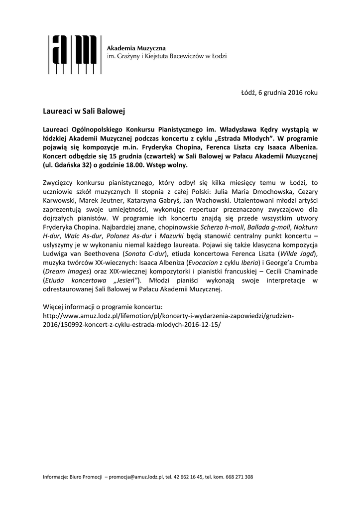 Łódź, 6 grudnia 2016 roku Laureaci w Sali Balowej Laureaci Ogólnopolskiego Konkursu Pianistycznego im. Władysława Kędry wystąpią w łódzkiej Akademii Muzycznej podczas koncertu z cyklu „Estrada Młodych”. W programie pojawią się kompozycje m.in. Fryderyka Chopina, Ferenca Liszta czy Isaaca Albeniza. Koncert odbędzie się 15 grudnia (czwartek) w Sali Balowej w Pałacu Akademii Muzycznej (ul. Gdańska 32) o godzinie 18.00. Wstęp wolny. Zwycięzcy konkursu pianistycznego, który odbył się kilka miesięcy temu w Łodzi, to uczniowie szkół muzycznych II stopnia z całej Polski: Julia Maria Dmochowska, Cezary Karwowski, Marek Jeutner, Katarzyna Gabryś, Jan Wachowski. Utalentowani młodzi artyści zaprezentują swoje umiejętności, wykonując repertuar przeznaczony zwyczajowo dla dojrzałych pianistów. W programie ich koncertu znajdą się przede wszystkim utwory Fryderyka Chopina. Najbardziej znane, chopinowskie Scherzo h-moll, Ballada g-moll, Nokturn H-dur, Walc As-dur, Polonez As-dur i Mazurki będą stanowić centralny punkt koncertu – usłyszymy je w wykonaniu niemal każdego laureata. Pojawi się także klasyczna kompozycja Ludwiga van Beethovena (Sonata C-dur), etiuda koncertowa Ferenca Liszta (Wilde Jagd), muzyka twórców XX-wiecznych: Isaaca Albeniza (Evocacion z cyklu Iberia) i George’a Crumba (Dream Images) oraz XIX-wiecznej kompozytorki i pianistki francuskiej – Cecili Chaminade (Etiuda koncertowa „Jesień”). Młodzi pianiści wykonają swoje interpretacje w odrestaurowanej Sali Balowej w Pałacu Akademii Muzycznej. Więcej informacji o programie koncertu: http://www.amuz.lodz.pl/lifemotion/pl/koncerty-i-wydarzenia-zapowiedzi/grudzien2016/150992-koncert-z-cyklu-estrada-mlodych-2016-12-15/ Informacje: Biuro Promocji – [email protected], tel. 42 662 16 45, tel. kom. 668 271 308