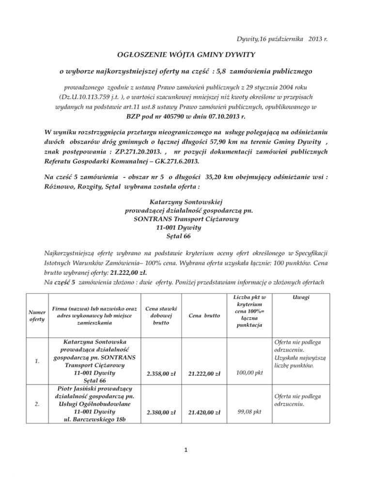 Dywity,16 października 2013 r. OGŁOSZENIE WÓJTA GMINY DYWITY o wyborze najkorzystniejszej oferty na część : 5,8 zamówienia publicznego prowadzonego zgodnie z ustawą Prawo zamówień publicznych z 29 stycznia 2004 roku (Dz.U.10.113.759 j.t. ), o wartości szacunkowej mniejszej niż kwoty określone w przepisach wydanych na podstawie art.11 ust.8 ustawy Prawo zamówień publicznych, opublikowanego w BZP pod nr 405790 w dniu 07.10.2013 r. W wyniku rozstrzygnięcia przetargu nieograniczonego na usługę polegającą na odśnieżaniu dwóch obszarów dróg gminnych o łącznej długości 57,90 km na terenie Gminy Dywity , znak postępowania : ZP.271.20.2013. , nr pozycji dokumentacji zamówień publicznych Referatu Gospodarki Komunalnej – GK.271.6.2013. Na cześć 5 zamówienia - obszar nr 5 o długości 35,20 km obejmujący odśnieżanie wsi : Różnowo, Rozgity, Sętal wybrana została oferta : Katarzyny Sontowskiej prowadzącej działalność gospodarczą pn. SONTRANS Transport Ciężarowy 11-001 Dywity Sętal 66 Najkorzystniejszą ofertę wybrano na podstawie kryterium oceny ofert określonego w Specyfikacji Istotnych Warunków Zamówienia– 100% cena. Wybrana oferta uzyskała łącznie: 100 punktów. Cena brutto wybranej oferty: 21.222,00 zł. Na część 5 zamówienia złożono : dwie oferty. Poniżej przedstawiam informację o złożonych ofertach Numer oferty 1. 2. Firma (nazwa) lub nazwisko oraz adres wykonawcy lub miejsce zamieszkania Katarzyna Sontowska prowadząca działalność gospodarczą pn. SONTRANS Transport Ciężarowy 11-001 Dywity Sętal 66 Piotr Jasiński prowadzący działalność gospodarczą pn. Usługi Ogólnobudowlane 11-001 Dywity ul. Barczewskiego 18b Cena stawki dobowej brutto Cena brutto 2.358,00 zł 21.222,00 zł 2.380,00 zł 21.420,00 zł 1 Liczba pkt w kryterium cena 100%= łączna punktacja 100,00 pkt 99,08 pkt Uwagi Oferta nie podlega odrzuceniu. Uzyskała najwyższą liczbę punktów. Oferta nie podlega odrzuceniu. Termin zgodnie z art.94 ust.1,pkt 2) po upływie którego umowa na realizację części 5 zamówienia może być zawarta, określono na dzień : 22 października 2013 r. Na cześć 8 zamówienia - obszar nr 8 o długości : 22,70 km obejmujący odśnieżanie wsi : Tuławki, Gady wybrana została oferta : Katarzyny Sontowskiej prowadzącej działalność gospodarczą pn. SONTRANS Transport Ciężarowy 11-001 Dywity Sętal 66 Najkorzystniejszą ofertę wybrano na podstawie kryterium oceny ofert określonego w Specyfikacji Istotnych Warunków Zamówienia– 100% cena. Wybrana oferta uzyskała łącznie: 100 punktów. Cena brutto wybranej oferty: 12.600,00 zł . Na część 8 zamówienia złożono : dwie oferty. Poniżej przedstawiam informację o złożonych ofertach Numer oferty 1. 2. Firma (nazwa) lub nazwisko oraz adres wykonawcy lub miejsce zamieszkania Katarzyna Sontowska prowadząca działalność gospodarczą pn. SONTRANS Transport Ciężarowy 11-001 Dywity Sętal 66 Piotr Jasiński prowadzący działalność gospodarczą pn. Usługi Ogólnobudowlane 11-001 Dywity ul. Barczewskiego 18b Cena stawki dobowej brutto Cena brutto 1.400,00 zł 12.600,00 zł 1.570,00 zł 14.130,00 zł Liczba pkt w kryterium cena 100%= łączna punktacja 100,00 pkt 89,17 pkt Uwagi Oferta nie podlega odrzuceniu. Uzyskała najwyższą liczbę punktów. Oferta nie podlega odrzuceniu. Termin zgodnie z art.94 ust.1,pkt 2) po upływie którego umowa na realizację części 8 zamówienia może być zawarta, określono na dzień : 22 października 2013 r. Z upoważnienia Wójta Gminy Dywity Ewa Sadowska 2