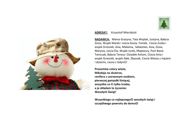 ADRESAT: Krzysztof Wierzbicki NADAWCA: Mama Grażyna, Tata Wojtek, Justyna, Babcia Zosia, Wujek Marek i ciocia Gosia, Tomek, Ciocia Zuzka i wujek Grzesiek, Asia, Malwina, Sebastian, Asia, Zosia, Marysia, ciocia Ela, Wujek Jurek, Majewscy, Pani Basia Tomczak, Babcia Teresa i Dziadek Antoni, Ciocia Ania i wujek Grzesiek, wujek Alek, Zbyszek, Ciocia Wiesia z mężem i dziećmi, ciocia z Gdyni☺ Prezentów cztery wieże, Mikołaja na skuterze, renifera z czerwonym noskiem, pierwszej gwiazdki lśniącej, wszystko co Ci tylko trzeba, a ja składam te życzenia: Wesołych Świąt! Wszystkiego co najlepszego☺ wesołych świąt i szczęśliwego powrotu do domu☺