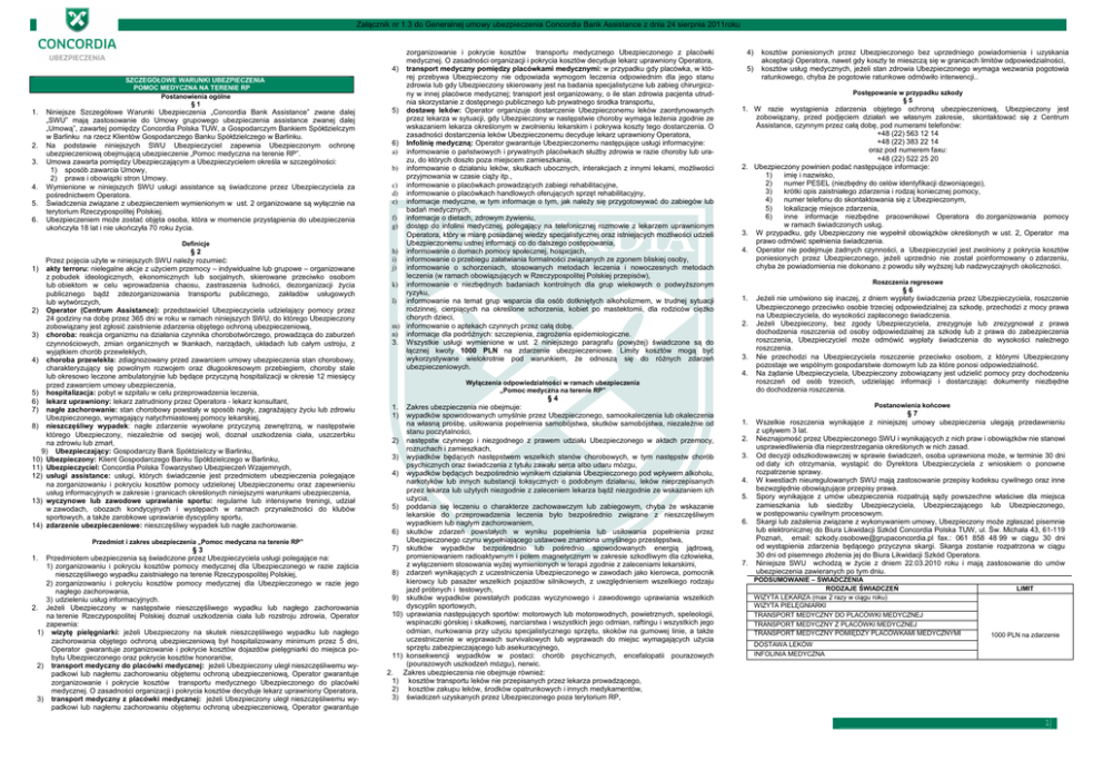 Załącznik nr 1.3 do Generalnej umowy ubezpieczenia Concordia Bank Assistance z dnia 24 sierpnia 2011roku zorganizowanie i pokrycie kosztów transportu medycznego Ubezpieczonego z placówki medycznej. O zasadności organizacji i pokrycia kosztów decyduje lekarz uprawniony Operatora, transport medyczny pomiędzy placówkami medycznymi: w przypadku gdy placówka, w której przebywa Ubezpieczony nie odpowiada wymogom leczenia odpowiednim dla jego stanu zdrowia lub gdy Ubezpieczony skierowany jest na badania specjalistyczne lub zabieg chirurgiczny w innej placówce medycznej; transport jest organizowany, o ile stan zdrowia pacjenta utrudnia skorzystanie z dostępnego publicznego lub prywatnego środka transportu, 5) dostawę leków: Operator organizuje dostarczenie Ubezpieczonemu leków zaordynowanych przez lekarza w sytuacji, gdy Ubezpieczony w następstwie choroby wymaga leżenia zgodnie ze wskazaniem lekarza określonym w zwolnieniu lekarskim i pokrywa koszty tego dostarczenia. O zasadności dostarczenia leków Ubezpieczonemu decyduje lekarz uprawniony Operatora, 6) Infolinię medyczną: Operator gwarantuje Ubezpieczonemu następujące usługi informacyjne: a) informowanie o państwowych i prywatnych placówkach służby zdrowia w razie choroby lub urazu, do których doszło poza miejscem zamieszkania, b) informowanie o działaniu leków, skutkach ubocznych, interakcjach z innymi lekami, możliwości przyjmowania w czasie ciąży itp., c) informowanie o placówkach prowadzących zabiegi rehabilitacyjne, d) informowanie o placówkach handlowych oferujących sprzęt rehabilitacyjny, e) informacje medyczne, w tym informacje o tym, jak należy się przygotowywać do zabiegów lub badań medycznych, f) informacje o dietach, zdrowym żywieniu, g) dostęp do infolinii medycznej, polegający na telefonicznej rozmowie z lekarzem uprawnionym Operatora, który w miarę posiadanej wiedzy specjalistycznej oraz istniejących możliwości udzieli Ubezpieczonemu ustnej informacji co do dalszego postępowania, h) informowanie o domach pomocy społecznej, hospicjach, i) informowanie o przebiegu załatwiania formalności związanych ze zgonem bliskiej osoby, j) informowanie o schorzeniach, stosowanych metodach leczenia i nowoczesnych metodach leczenia (w ramach obowiązujących w Rzeczypospolitej Polskiej przepisów), k) informowanie o niezbędnych badaniach kontrolnych dla grup wiekowych o podwyższonym ryzyku, l) informowanie na temat grup wsparcia dla osób dotkniętych alkoholizmem, w trudnej sytuacji rodzinnej, cierpiących na określone schorzenia, kobiet po mastektomii, dla rodziców ciężko chorych dzieci, m) informowanie o aptekach czynnych przez całą dobę, n) informacje dla podróżnych: szczepienia, zagrożenia epidemiologiczne. 3. Wszystkie usługi wymienione w ust. 2 niniejszego paragrafu (powyżej) świadczone są do łącznej kwoty 1000 PLN na zdarzenie ubezpieczeniowe. Limity kosztów mogą być wykorzystywane wielokrotnie pod warunkiem, że odnoszą się do różnych zdarzeń ubezpieczeniowych. 4) SZCZEGÓŁOWE WARUNKI UBEZPIECZENIA POMOC MEDYCZNA NA TERENIE RP Postanowienia ogólne §1 1. 2. 3. 4. 5. 6. Niniejsze Szczegółowe Warunki Ubezpieczenia „Concordia Bank Assistance” zwane dalej „SWU” mają zastosowanie do Umowy grupowego ubezpieczenia assistance zwanej dalej „Umową”, zawartej pomiędzy Concordia Polska TUW, a Gospodarczym Bankiem Spółdzielczym w Barlinku na rzecz Klientów Gospodarczego Banku Spółdzielczego w Barlinku. Na podstawie niniejszych SWU Ubezpieczyciel zapewnia Ubezpieczonym ochronę ubezpieczeniową obejmującą ubezpieczenie „Pomoc medyczna na terenie RP”. Umowa zawarta pomiędzy Ubezpieczającym a Ubezpieczycielem określa w szczególności: 1) sposób zawarcia Umowy, 2) prawa i obowiązki stron Umowy. Wymienione w niniejszych SWU usługi assistance są świadczone przez Ubezpieczyciela za pośrednictwem Operatora. Świadczenia związane z ubezpieczeniem wymienionym w ust. 2 organizowane są wyłącznie na terytorium Rzeczypospolitej Polskiej. Ubezpieczeniem może zostać objęta osoba, która w momencie przystąpienia do ubezpieczenia ukończyła 18 lat i nie ukończyła 70 roku życia. Definicje §2 Przez pojęcia użyte w niniejszych SWU należy rozumieć: 1) akty terroru: nielegalne akcje z użyciem przemocy – indywidualne lub grupowe – organizowane z pobudek ideologicznych, ekonomicznych lub socjalnych, skierowane przeciwko osobom lub obiektom w celu wprowadzenia chaosu, zastraszenia ludności, dezorganizacji życia publicznego bądź zdezorganizowania transportu publicznego, zakładów usługowych lub wytwórczych, 2) Operator (Centrum Assistance): przedstawiciel Ubezpieczyciela udzielający pomocy przez 24 godziny na dobę przez 365 dni w roku w ramach niniejszych SWU, do którego Ubezpieczony zobowiązany jest zgłosić zaistnienie zdarzenia objętego ochroną ubezpieczeniową, 3) choroba: reakcja organizmu na działania czynnika chorobotwórczego, prowadząca do zaburzeń czynnościowych, zmian organicznych w tkankach, narządach, układach lub całym ustroju, z wyjątkiem chorób przewlekłych, 4) choroba przewlekła: zdiagnozowany przed zawarciem umowy ubezpieczenia stan chorobowy, charakteryzujący się powolnym rozwojem oraz długookresowym przebiegiem, choroby stale lub okresowo leczone ambulatoryjnie lub będące przyczyną hospitalizacji w okresie 12 miesięcy przed zawarciem umowy ubezpieczenia, 5) hospitalizacja: pobyt w szpitalu w celu przeprowadzenia leczenia, 6) lekarz uprawniony: lekarz zatrudniony przez Operatora - lekarz konsultant, 7) nagłe zachorowanie: stan chorobowy powstały w sposób nagły, zagrażający życiu lub zdrowiu Ubezpieczonego, wymagający natychmiastowej pomocy lekarskiej, 8) nieszczęśliwy wypadek: nagłe zdarzenie wywołane przyczyną zewnętrzną, w następstwie którego Ubezpieczony, niezależnie od swojej woli, doznał uszkodzenia ciała, uszczerbku na zdrowiu lub zmarł, 9) Ubezpieczaj