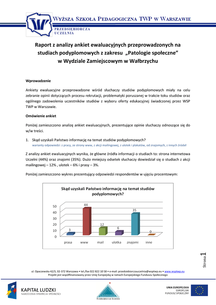 Raport z analizy ankiet ewaluacyjnych przeprowadzonych na studiach podyplomowych z zakresu „Patologie społeczne” w Wydziale Zamiejscowym w Wałbrzychu Wprowadzenie Ankiety ewaluacyjne przeprowadzone wśród słuchaczy studiów podyplomowych miały na celu zebranie opinii dotyczących procesu rekrutacji, problematyki poruszanej w trakcie toku studiów oraz ogólnego zadowolenia uczestników studiów z wyboru oferty edukacyjnej świadczonej przez WSP TWP w Warszawie. Omówienie ankiet Poniżej zamieszczono analizę ankiet ewaluacyjnych, prezentujące opinie słuchaczy odnoszące się do w/w treści. 1. Skąd uzyskali Paostwo informację na temat studiów podyplomowych? warianty odpowiedzi: z pracy, ze strony www, z akcji mailingowej, z ulotek i plakatów, od znajomych, z innych źródeł Z analizy ankiet ewaluacyjnych wynika, że główne źródła informacji o studiach to: strona internetowa Uczelni (44%) oraz znajomi (35%). Dużo mniejszy odsetek słuchaczy dowiedział się o studiach z akcji mailingowej – 12% , ulotek – 6% i prasy – 3%. Strona 1 Poniżej zamieszczono wykres prezentujący odpowiedzi respondentów w ujęciu procentowym: ul. Opaczewska 42/3, 02-372 Warszawa • tel./fax 022 822 10 58 • e-mail: [email protected] • www.wsptwp.eu Projekt jest współfinansowany przez Unię Europejską w ramach Europejskiego Funduszu Społecznego 2. Czy rekrutacja na studia przebiegała w sprawny sposób? warianty odpowiedzi: zdecydowanie tak, tak, raczej tak, raczej nie, nie, zdecydowanie nie Wszyscy słuchacze studiów podyplomowych uznali, że rekrutacja na przedmiotowe studia przebiegała w sprawny sposób. Poniżej zamieszczono wykres prezentujący odpowiedzi respondentów w ujęciu procentowym: 3. Jakie motywy skłoniły Paostwa do udziału w studiach? warianty odpowiedzi (do wyboru wszystkie prawdziwe dla respondenta): chęd podniesienia kwalifikacji, program studiów, przydatnośd omawianych zagadnieo w pracy zawodowej, odległośd Uczelni od miejsca zamieszkania, chęd poznania nowych ludzi, reklama studiów, nieodpłatnośd studiów, prestiż instytucji szkolącej, inne Głównymi motywami udziału w studiach podyplomowych były: chęd podniesienia własnych kwalifikacji (22%) oraz możliwośd podjęcia studiów bezpłatnie (19%). Pozostałe istotne motywy rozpoczęcia studiów to: przydatnośd omawianych zagadnieo w pracy zawodowej (16%), program studiów (13%), odległośd Uczelni od miejsca zamieszkania (13%) i chęd poznania nowych ludzi (10%). Strona 2 Poniżej zamieszczono wykres prezentujący odpowiedzi respondentów w ujęciu procentowym: ul. Opaczewska 42/3, 02-372 Warszawa • tel./fax 022 822 10 58 • e-mail: [email protected] • www.wsptwp.eu Projekt jest współfinansowany przez Unię Europejską w ramach Europejskiego Funduszu Społecznego 4. Jak oceniają Paostwo wiedzę przekazywaną podczas studiów? warianty odpowiedzi (do wyboru wszystkie prawdziwe dla respondenta): przydatna, rzetelna, nowa, znana, bezużyteczna, inne odpowiedzi Uczestnicy studiów określili wiedzę przekazywaną jako: przydatną (36% odpowiedzi), rzetelną (28%), nową (27%), 8% odpowiedzi przypadło na określenie znana, a 2% odpowiedzi na określenie bezużyteczna. Poniżej zamieszczono wykres prezentujący odpowiedzi respondentów w ujęciu procentowym: 5. Jak oceniają Paostwo sposób przekazywania wiedzy podczas studiów? warianty odpowiedzi: bardzo dobry, dobry, dostateczny, niedostateczny Sposób przekazywania wiedzy słuchaczom został oceniony pozytywnie przez wszystkich studentów. Uwaga jednego ze słuchaczy: „przekaz wiedzy mocno był uzależniony od wykładowcy”. Strona 3 Poniżej zamieszczono wykres prezentujący odpowiedzi respondentów w ujęciu procentowym: ul. Opaczewska 42/3, 02-372 Warszawa • tel./fax 022 822 10 58 • e-mail: [email protected] • www.wsptwp.eu Projekt jest współfinansowany przez Unię Europejską w ramach Europejskiego Funduszu Społecznego 6. Jak oceniają Paostwo materiały dydaktyczne prezentowane i udostępniane podczas studiów? warianty odpowiedzi: bardzo dobre, dobre, średnie, niezadowalające Materiały dydaktyczne przez 93% uczestników zajęd zostały ocenione jako bardzo dobre i dobre, 7% respondentów oceniło materiały dydaktyczne jako średnie. Poniżej zamieszczono wykres prezentujący odpowiedzi respondentów w ujęciu procentowym: 7. Czy tematyka zajęd okazała się zgodna z Paostwa potrzebami i oczekiwaniami? warianty odpowiedzi: zdecydowanie tak, tak, raczej tak, raczej nie, nie, zdecydowanie nie Program studiów podyplomowych został oceniony przez wszystkich respondentów jako prawidłowo skonstruowany, uwzględniając aktualne potrzeby rynku. Strona 4 Poniżej zamieszczono wykres prezentujący odpowiedzi respondentów w ujęciu procentowym: ul. Opaczewska 42/3, 02-372 Warszawa • tel./fax 022 822 10 58 • e-mail: [email protected] • www.wsptwp.eu Projekt jest współfinansowany przez Unię Europejską w ramach Europejskiego Funduszu Społecznego 8. Jak oceniają Paostwo przygotowanie merytoryczne wykładowców? warianty odpowiedzi: bardzo dobre, dobre, średnie, niezadowalające Przygotowanie merytoryczne wykładowców zostało ocenione pozytywnie przez wszystkich słuchaczy. Uwagi słuchaczy dotyczące przygotowania merytorycznego wykładowców: „poziom zaniża Pani mgr Popiel”, „kilka osób skupiało się tylko na tym, co robią w codziennej pracy. Nie mają umiejętności połączenia wiedzy teoretycznej z praktyczną”. Poniżej zamieszczono wykres prezentujący odpowiedzi respondentów w ujęciu procentowym: 9. Który z wykładowców w największym stopniu spełnił Paostwa oczekiwania? warianty odpowiedzi: pytanie otwarte Najwięcej wskazao jako najlepszy wykładowca otrzymali: mgr M. Kuc i dr K. Dziedzic. 10. Jak oceniają Paostwo umiejętności zdobyte dzięki uczestnictwu w studiach? warianty odpowiedzi: zdecydowanie przydatne, raczej przydatne, przydatne, mało przydatne, nieprzydatne St