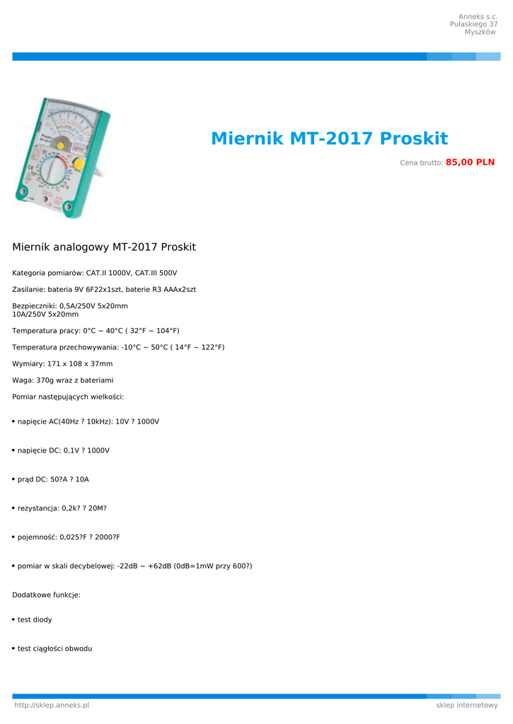 Anneks s.c. Pułaskiego 37 Myszków Miernik MT-2017 Proskit Cena brutto: 85,00 PLN Miernik analogowy MT-2017 Proskit Kategoria pomiarów: CAT.II 1000V, CAT.III 500V Zasilanie: bateria 9V 6F22x1szt, baterie R3 AAAx2szt Bezpieczniki: 0,5A/250V 5x20mm 10A/250V 5x20mm Temperatura pracy: 0°C ~ 40°C ( 32°F ~ 104°F) Temperatura przechowywania: -10°C ~ 50°C ( 14°F ~ 122°F) Wymiary: 171 x 108 x 37mm Waga: 370g wraz z bateriami Pomiar następujących wielkości: napięcie AC(40Hz ? 10kHz): 10V ? 1000V napięcie DC: 0,1V ? 1000V prąd DC: 50?A ? 10A rezystancja: 0,2k? ? 20M? pojemność: 0,025?F ? 2000?F pomiar w skali decybelowej: -22dB ~ +62dB (0dB=1mW przy 600?) Dodatkowe funkcje: test diody test ciągłości obwodu http://sklep.anneks.pl sklep internetowy Anneks s.c. Pułaskiego 37 Myszków test tranzystora test baterii test diod LED funkcja NULL DCV - ?25 lub ?5 http://sklep.anneks.pl sklep internetowy