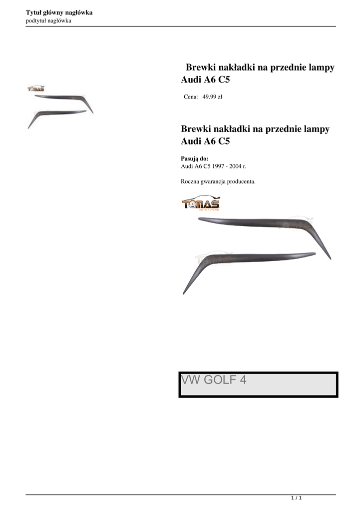 Tytuł główny nagłówka podtytuł nagłówka Brewki nakładki na przednie lampy Audi A6 C5 Cena: 49.99 zł Brewki nakładki na przednie lampy Audi A6 C5 Pasują do: Audi A6 C5 1997 - 2004 r. Roczna gwarancja producenta. VW GOLF 4 1/1 Powered by TCPDF (www.tcpdf.org)