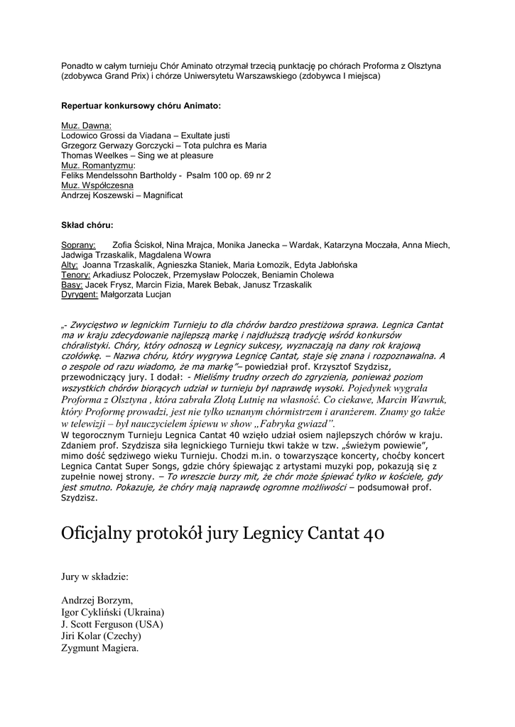 Ponadto w całym turnieju Chór Aminato otrzymał trzecią punktację po chórach Proforma z Olsztyna (zdobywca Grand Prix) i chórze Uniwersytetu Warszawskiego (zdobywca I miejsca) Repertuar konkursowy chóru Animato: Muz. Dawna: Lodowico Grossi da Viadana – Exultate justi Grzegorz Gerwazy Gorczycki – Tota pulchra es Maria Thomas Weelkes – Sing we at pleasure Muz. Romantyzmu: Feliks Mendelssohn Bartholdy - Psalm 100 op. 69 nr 2 Muz. Współczesna Andrzej Koszewski – Magnificat Skład chóru: Soprany: Zofia Ściskoł, Nina Mrajca, Monika Janecka – Wardak, Katarzyna Moczała, Anna Miech, Jadwiga Trzaskalik, Magdalena Wowra Alty: Joanna Trzaskalik, Agnieszka Staniek, Maria Łomozik, Edyta Jabłońska Tenory: Arkadiusz Poloczek, Przemysław Poloczek, Beniamin Cholewa Basy: Jacek Frysz, Marcin Fizia, Marek Bebak, Janusz Trzaskalik Dyrygent: Małgorzata Lucjan „- Zwycięstwo w legnickim Turnieju to dla chórów bardzo prestiżowa sprawa. Legnica Cantat ma w kraju zdecydowanie najlepszą markę i najdłuższą tradycję wśród ko nkursów chóralistyki. Chóry, który odnoszą w Legnicy sukcesy, wyznaczają na dany rok krajową czołówkę. – Nazwa chóru, który wygrywa Legnicę Cantat, staje się znana i rozpoznawalna. A o zespole od razu wiadomo, że ma markę”– powiedział prof. Krzysztof Szydzisz, przewodniczący jury. I dodał: - Mieliśmy trudny orzech do zgryzienia, ponieważ poziom wszystkich chórów biorących udział w turnieju był naprawdę wysoki. Pojedynek wygrała Proforma z Olsztyna , która zabrała Złotą Lutnię na własność. Co ciekawe, Marcin Wawruk, który Proformę prowadzi, jest nie tylko uznanym chórmistrzem i aranżerem. Znamy go także w telewizji – był nauczycielem śpiewu w show „Fabryka gwiazd”. W tegorocznym Turnieju Legnica Cantat 40 wzięło udział osiem najlepszych chórów w kraju. Zdaniem prof. Szydzisza siła legnickiego Turnieju tkwi także w tzw. „świeżym powiewie”, mimo dość sędziwego wieku Turnieju. Chodzi m.in. o towarzyszące koncerty, choćby koncert Legnica Cantat Super Songs, gdzie chóry śpiewając z artystami muzyki pop, pokazują si ę z zupełnie nowej strony. – To wreszcie burzy mit, że chór może śpiewać tylko w kościele, gdy jest smutno. Pokazuje, że chóry mają naprawdę ogromne możliwości – podsumował prof. Szydzisz. Oficjalny protokół jury Legnicy Cantat 40 Jury w składzie: Andrzej Borzym, Igor Cykliński (Ukraina) J. Scott Ferguson (USA) Jiri Kolar (Czechy) Zygmunt Magiera. Prof. Krzysztof Szydzisz – przewodniczący Ks. Prof. Kazimierz Szymonik Po wysłuchaniu w dniach 15-16 maja 2009 roku 8 chórów biorących udział w Turnieju postanowiło przyznać: Nagrodę Główną (dla najlepszego chóru Turnieju) - Złotą Lutnię im . Jerzego Libana z Legnicy - na własność (po trzykrotnym jej zdobyciu) Oraz nagrodę pieniężną w wysokości 3.000 zł, ufundowaną przez Prezydenta Miasta Legnicy Kameralnemu Zespołowi Muzyki Północno – Wschodniej i Popołudniowej PRO FORMA z Olsztyna pod dyr. Marcina Wawruka - dyrygent chóru zaproszony jest do Jury przyszłorocznej edycji konkursu, natomiast zespół do udziału w uroczystym otwarciu Turnieju Legnica Cantat 41. W kategorii chórów osób dorosłych: Nagrodę im. Henryka Karlińskiego w wys. 1.000 zł, ufundowaną przez Dyrektora Legnickiego Centrum Kultury Chórowi Akademickiemu Uniwersytetu Warszawskiego pod dyr. Iriny Bogdanovich (96 punktów) II miejsce Kłodzkiemu Chórowi CONCERTO GLACENSIS Kłódzkiego Ośrodka Kultury pod dyr. Katarzyny Mąki (84,14 punktów) III miejsce Akademickiemu Zespołowi Muzycznemu Politechniki Śląskiej w Gliwicach pod dyr. Krystyny Krzyżanowskiej – Łobody (82,29 punktów) W kategorii zespołów kameralnych: Nagrodę im. Henryka Karlińskiego w wys. 1.000 zł, ufundowaną przez Dyrektora Legnickiego centrum Kultury Kameralnemu Zespołowi Muzyki Północno – Wschodniej i Popołudniowej PRO FORMA z Olsztyna pod dyr. Marcina Wawruka (94.86 punktów) II miejsce Chórowi Kameralnemu ANIMATO Gminnego Ośrodka Kultury w Pawłowicach pod dyr. Małgorzaty Lucjan (86.29 punktów) III miejsce Chórowi Kameralnemu Politechniki Wrocławskiej AXION przy Zespole Zamiejscowych Ośrodków Dydaktycznych w Legnicy pod dyr. Jarosława Lewkowa (78.29 punktów) W kategorii zespołów młodzieżowych: I miejsce Zespołowi Wokalnemu CAVATINA Młodzieżowego Domu Kultury w Starachowicach pod dyr. Bożeny Magdaleny Mrózek (86 punktów) II miejsce Miejskiemu Chórowi dziewczęcemu LOGOS Miejskiego Miejskiego Domu Kultury w Świnoujściu pod dyr. Elżbiety Naklickiej (83.43 punkty).