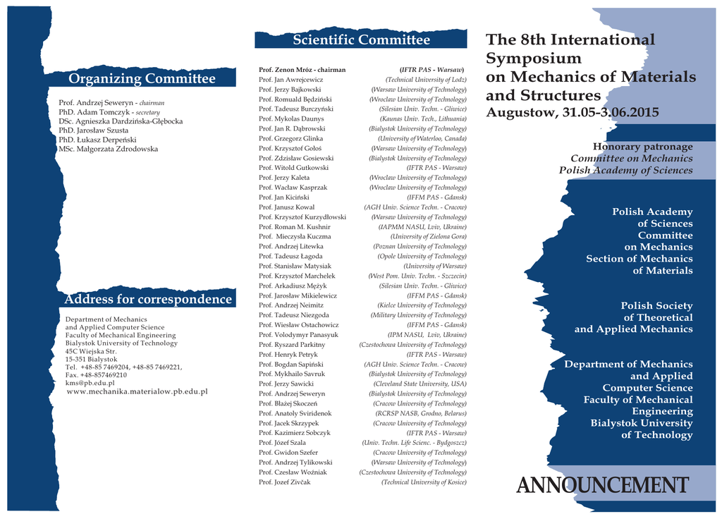 Scientific Committee Organizing Committee Prof. Andrzej Seweryn - chairman PhD. Adam Tomczyk - secretary DSc. Agnieszka Dardzińska-Głębocka PhD. Jarosław Szusta PhD. Łukasz Derpeński MSc. Małgorzata Zdrodowska Address for correspondence Department of Mechanics and Applied Computer Science Faculty of Mechanical Engineering Bialystok University of Technology 45C Wiejska Str. 15-351 Bialystok Tel. +48-85 7469204, +48-85 7469221, Fax. +48-857469210 [email protected] www.mechanika.materialow.pb.edu.pl Prof. Zenon Mróz - chairman Prof. Jan Awrejcewicz Prof. Jerzy Bajkowski Prof. Romuald Będziński Prof. Tadeusz Burczyński Prof. Mykolas Daunys Prof. Jan R. Dąbrowski Prof. Grzegorz Glinka Prof. Krzysztof Gołoś Prof. Zdzisław Gosiewski Prof. Witold Gutkowski Prof. Jerzy Kaleta Prof. Wacław Kasprzak Prof. Jan Kiciński Prof. Janusz Kowal Prof. Krzysztof Kurzydłowski Prof. Roman M. Kushnir Prof. Mieczysła Kuczma Prof. Andrzej Litewka Prof. Tadeusz Łagoda Prof. Stanisław Matysiak Prof. Krzysztof Marchelek Prof. Arkadiusz Mężyk Prof. Jarosław Mikielewicz Prof. Andrzej Neimitz Prof. Tadeusz Niezgoda Prof. Wiesław Ostachowicz Prof. Volodymyr Panasyuk Prof. Ryszard Parkitny Prof. Henryk Petryk Prof. Bogdan Sapiński Prof. Mykhailo Savruk Prof. Jerzy Sawicki Prof. Andrzej Seweryn Prof. Błażej Skoczeń Prof. Anatoly Sviridenok Prof. Jacek Skrzypek Prof. Kazimierz Sobczyk Prof. Józef Szala Prof. Gwidon Szefer Prof. Andrzej Tylikowski Prof. Czesław Woźniak Prof. Jozef Zivčak (IFTR PAS - Warsaw) (Technical University of Lodz) (Warsaw University of Technology) (Wroclaw University of Technology) (Silesian Univ. Techn. - Gliwice) (Kaunas Univ. Tech., Lithuania) (Bialystok University of Technology) (University of Waterloo, Canada) (Warsaw University of Technology) (Bialystok University of Technology) (IFTR PAS - Warsaw) (Wroclaw University of Technology) (Wroclaw University of Technology) (IFFM PAS - Gdansk) (AGH Univ. Science Techn. - Cracow) (Warsaw University of Technology) (IAPMM NASU, Lviv, Ukraine) (University of Zielona Gora) (Poznan University of Technology) (Opole University of Technology) (University of Warsaw) (West Pom. Univ. Techn. - Szczecin) (Silesian Univ. Techn. - Gliwice) (IFFM PAS - Gdansk) (Kielce University of Technology) (Military University of Technology) (IFFM PAS - Gdansk) (IPM NASU, Lviv, Ukraine) (Czestochowa University of Technology) (IFTR PAS - Warsaw) (AGH Univ. Science Techn. - Cracow) (Bialystok University of Technology) (Cleveland State University, USA) (Bialystok University of Technology) (Cracow University of Technology) (RCRSP NASB, Grodno, Belarus) (Cracow University of Technology) (IFTR PAS - Warsaw) (Univ. Techn. Life Scienc. - Bydgoszcz) (Cracow University of Technology) (Warsaw University of Technology) (Czestochowa University of Technology) (Technical University of Kosice) The 8th International Symposium on Mechanics of Materials and Structures Augustow, 31.05-3.06.2015 Honorary patronage Committee on Mechanics Polish Academy of Sciences Polish Academy of Sciences Committee on Mechanics Section of Mechanics of Materials Polish Society of Theoretical and Applied Mechanics Department of Mechanics and Applied Computer Science Faculty of Mechanical Engineering Bialystok University of Technology ANNOUNCEMENT Topics 1. fracture mechanics, 2. damage mechanics, 3. fatigue of materials and structures, 4. plasticity and creep, 5. inverse problems - identification of the damage, 6. mechanics of composites, 7. mechanics of advanced materials (SMART, gradient, nanomaterials), 8. contact mechanics, problem of surface layer, 9. termomechanics, Application Card revision selected articles will be published in Acta Mechanica et Automatica. The papers will be presented in oral and during poster sessions. Authors should propose a form of presentation: oral or poster session. Simultaneously, for plenary session, please declare the subject area according to the numbers above. The Scientific Committee will make the final classification of the papers. One author (co-author) can present maximum two papers. Official languages are Polish and English. Declaration and paper in the electronic version can be send by traditional mail or using the web site: www.mechanika.materialow.pb.edu.pl. The 8th International Symposium on Mechanics of Materials and Structures 31.05-3.06.2015, Augustów, Poland Please use BLOCK CAPITALS Forename(s) and Surname: Title and scientific degree: Paper tile: 10. biomechanics and biomaterials, 11. structural dynamics, 12. strength and safety of structures, Timelines Location The symposium will be held on the holiday center Oficerski Yacht Club RP “Pacific” which is located by the White Lake in Augustow. The small peninsula underlines perfect scenery values of this place. The center, rimmed by old pine forest, near the Augustow Forest, is an oasis of silence and calm. We hope this scenery will favour the work and rest during the conference. During the symposium we would like to propose a bonfire, peasants revel, a passenger ship trip along the Augustow Canal and surrounding lakes, and banquet. Papers The paper should be prepared in two forms. The first - one page abstract - will be included to conference proceedings. The second - with no page limit - will be published in .pdf format on CD. Detailed information about papers preparing can be find on our web site. After Presentation form: Oral Poster Subject area (no): q sending the applications: January 31, 2015 Address for correspondence Institution, University, Faculty, Institute: q paper submission: March 31, 2015 q papers acceptance: April 15, 2015 q date of payment: May 10, 2015 City, Street, Postal Code: q conference programme: May 20, 2015 The conference fee The estimated cost of participation in the conference is 1450 PLN (350 EUR). For members of Polish Society of Theoretical and Applied Mechanics - 1400 PLN (330 EUR). The fee for participants includes: accommodation, meals, banquet an