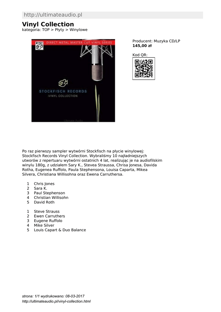 http://ultimateaudio.pl Vinyl Collection kategoria: TOP > Płyty > Winylowe Producent: Muzyka CD/LP 145,00 zł Kod QR: Po raz pierwszy sampler wytwórni Stockfisch na płycie winylowej: Stockfisch Records Vinyl Collection. Wybraliśmy 10 najładniejszych utworów z repertuaru wytwórni ostatnich 4 lat, realizując je na audiofilskim winylu 180g, z udziałem Sary K., Stevea Straussa, Chrisa Jonesa, Davida Rotha, Eugenea Ruffolo, Paula Stephensona, Louisa Caparta, Mikea Silvera, Christiana Willisohna oraz Ewena Carruthersa. 1 2 3 4 5 Chris Jones Sara K. Paul Stephenson Christian Willisohn David Roth 1 2 3 4 5 Steve Strauss Ewen Carruthers Eugene Ruffolo Mike Silver Louis Capart & Duo Balance strona: 1/1 wydrukowano: 08-03-2017 http://ultimateaudio.pl/vinyl-collection.html