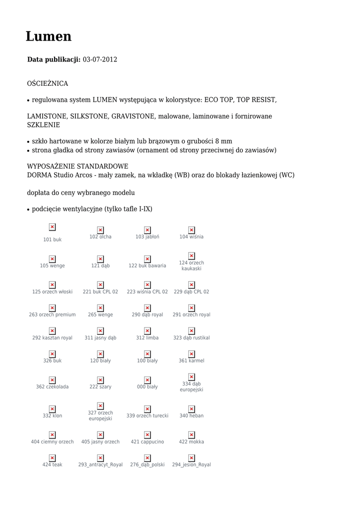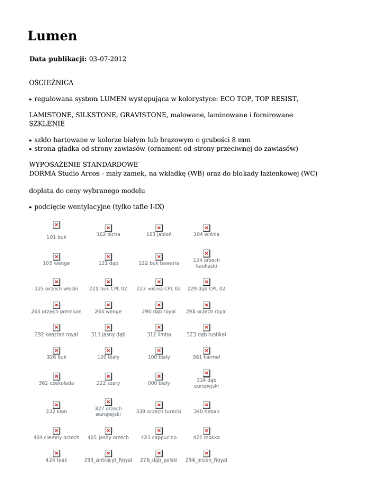 Lumen Data publikacji: 03-07-2012 OŚCIEŻNICA ● regulowana system LUMEN występująca w kolorystyce: ECO TOP, TOP RESIST, LAMISTONE, SILKSTONE, GRAVISTONE, malowane, laminowane i fornirowane SZKLENIE ● ● szkło hartowane w kolorze białym lub brązowym o grubości 8 mm strona gładka od strony zawiasów (ornament od strony przeciwnej do zawiasów) WYPOSAŻENIE STANDARDOWE DORMA Studio Arcos - mały zamek, na wkładkę (WB) oraz do blokady łazienkowej (WC) dopłata do ceny wybranego modelu ● podcięcie wentylacyjne (tylko tafle I-IX) 102 olcha 103 jabłoń 104 wiśnia 105 wenge 121 dąb 122 buk bawaria 124 orzech kaukaski 125 orzech włoski 221 buk CPL 02 223 wiśnia CPL 02 229 dąb CPL 02 263 orzech premium 265 wenge 290 dąb royal 291 orzech royal 292 kasztan royal 311 jasny dąb 312 limba 323 dąb rustikal 326 buk 120 biały 100 biały 361 karmel 362 czekolada 222 szary 000 biały 334 dąb europejski 332 klon 327 orzech europejski 339 orzech turecki 340 heban 404 ciemny orzech 405 jasny orzech 421 cappucino 422 mokka 424 teak 293_antracyt_Royal 276_dąb_polski 294_jesion_Royal 101 buk 277_kasztan_antyczny 295_merbau_Royal 278_orzech_antyczny paleta RAL / NCS 260 biały dąb