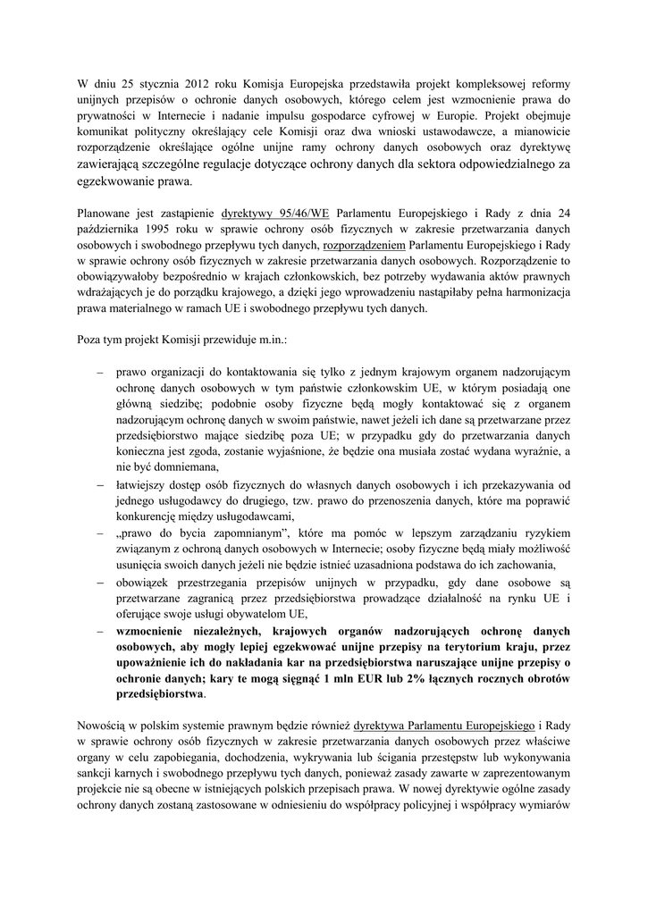 W dniu 25 stycznia 2012 roku Komisja Europejska przedstawiła projekt kompleksowej reformy unijnych przepisów o ochronie danych osobowych, którego celem jest wzmocnienie prawa do prywatności w Internecie i nadanie impulsu gospodarce cyfrowej w Europie. Projekt obejmuje komunikat polityczny określający cele Komisji oraz dwa wnioski ustawodawcze, a mianowicie rozporządzenie określające ogólne unijne ramy ochrony danych osobowych oraz dyrektywę zawierającą szczególne regulacje dotyczące ochrony danych dla sektora odpowiedzialnego za egzekwowanie prawa. Planowane jest zastąpienie dyrektywy 95/46/WE Parlamentu Europejskiego i Rady z dnia 24 października 1995 roku w sprawie ochrony osób fizycznych w zakresie przetwarzania danych osobowych i swobodnego przepływu tych danych, rozporządzeniem Parlamentu Europejskiego i Rady w sprawie ochrony osób fizycznych w zakresie przetwarzania danych osobowych. Rozporządzenie to obowiązywałoby bezpośrednio w krajach członkowskich, bez potrzeby wydawania aktów prawnych wdrażających je do porządku krajowego, a dzięki jego wprowadzeniu nastąpiłaby pełna harmonizacja prawa materialnego w ramach UE i swobodnego przepływu tych danych. Poza tym projekt Komisji przewiduje m.in.: prawo organizacji do kontaktowania się tylko z jednym krajowym organem nadzorującym ochronę danych osobowych w tym państwie członkowskim UE, w którym posiadają one główną siedzibę; podobnie osoby fizyczne będą mogły kontaktować się z organem nadzorującym ochronę danych w swoim państwie, nawet jeżeli ich dane są przetwarzane przez przedsiębiorstwo mające siedzibę poza UE; w przypadku gdy do przetwarzania danych konieczna jest zgoda, zostanie wyjaśnione, że będzie ona musiała zostać wydana wyraźnie, a nie być domniemana, łatwiejszy dostęp osób fizycznych do własnych danych osobowych i ich przekazywania od jednego usługodawcy do drugiego, tzw. prawo do przenoszenia danych, które ma poprawić konkurencję między usługodawcami, „prawo do bycia zapomnianym”, które ma pomóc w lepszym zarządzaniu ryzykiem związanym z ochroną danych osobowych w Internecie; osoby fizyczne będą miały możliwość usunięcia swoich danych jeżeli nie będzie istnieć uzasadniona podstawa do ich zachowania, obowiązek przestrzegania przepisów unijnych w przypadku, gdy dane osobowe są przetwarzane zagranicą przez przedsiębiorstwa prowadzące działalność na rynku UE i oferujące swoje usługi obywatelom UE, wzmocnienie niezależnych, krajowych organów nadzorujących ochronę danych osobowych, aby mogły lepiej egzekwować unijne przepisy na terytorium kraju, przez upoważnienie ich do nakładania kar na przedsiębiorstwa naruszające unijne przepisy o ochronie danych; kary te mogą sięgnąć 1 mln EUR lub 2% łącznych rocznych obrotów przedsiębiorstwa. Nowością w polskim systemie prawnym będzie również dyrektywa Parlamentu Europejskiego i Rady w sprawie ochrony osób fizycznych w zakresie przetwarzania danych osobowych przez właściwe organy w celu zapobiegania, dochodzenia, wykrywania lub ścigania przestępstw lub wykonywania sankcji karnych i swobodnego przepływu tych danych, ponieważ zasady zawarte w zaprezentowanym projekcie nie są obecne w istniejących polskich przepisach prawa. W nowej dyrektywie ogólne zasady ochrony danych zostaną zastosowane w odniesieniu do współpracy policyjnej i współpracy wymiarów sprawiedliwości w sprawach karnych. Przepisy dyrektywy będą miały zastosowanie do przekazywania danych zarówno w kraju, jak i do transferów transgranicznych. Aktualnie problematykę ochrony danych osobowych reguluje w polskim systemie prawnym ustawa o ochronie danych osobowych, która nakłada na przedsiębiorców szereg obowiązków dotyczących zapewnienia odpowiedniej ochrony danych osób fizycznych. Należy zauważyć, że w praktyce niemal każde przedsiębiorstwo, niezależnie od branży czy charakteru działalności, zajmuje się przetwarzaniem danych osobowych. Nawet w sytuacji, gdy firma nie świadczy usług klientom indywidualnym, których informacje stanowią zbiór podlegający ochronie, to z pewnością przetwarza inne dane chronione, takie jak np.: informacje o pracownikach czy osobach ubiegających się o pracę, w związku z prowadzoną przez dany podmiot rekrutacją, dane kontaktowe do osób współpracujących z przedsiębiorstwem. Przedsiębiorca jest zobowiązany zapewnić bezpieczne przetwarzanie danych osobowych, którymi dysponuje na trzech płaszczyznach: formalno - prawnej, organizacyjnej i technicznej, wynikających z różnego rodzaju obowiązków nakładanych przez przepisy na przetwarzający je podmiot. W związku z tym uprzejmie informujemy, że w przypadku, gdyby potrzebowali Państwo naszego wsparcia w celu zgodnego z prawem przetwarzania danych osobowych w Państwa przedsiębiorstwach, to nasza oferta dotycząca ochrony danych osobowych obejmuje w szczególności: pomoc w rejestracji zbiorów danych osobowych w rejestrze GIODO, przygotowanie dokumentacji dotyczącej ochrony danych osobowych, audyt ochrony danych osobowych, wsparcie we wdrożeniu systemu ochrony danych osobowych w przedsiębiorstwie, szkolenia dla pracowników przetwarzających dane osobowe oraz Administratorów Bezpieczeństwa Informacji.