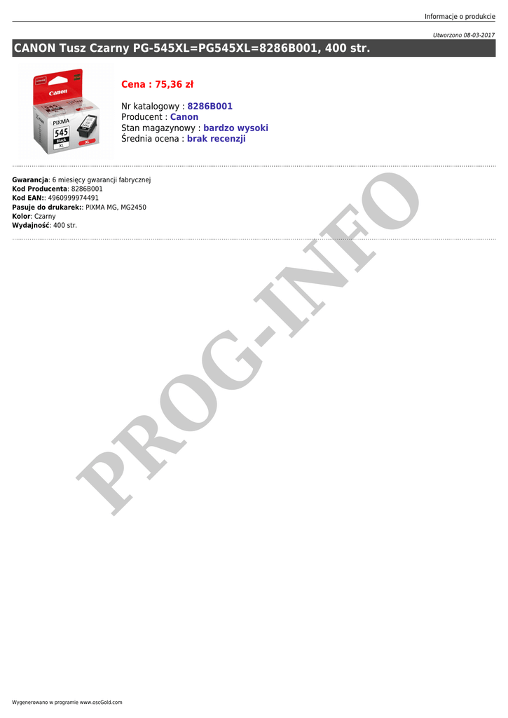 Informacje o produkcie Utworzono 08-03-2017 CANON Tusz Czarny PG-545XL=PG545XL=8286B001, 400 str. Cena : 75,36 zł Nr katalogowy : 8286B001 Producent : Canon Stan magazynowy : bardzo wysoki Średnia ocena : brak recenzji PR O G -I N FO Gwarancja: 6 miesięcy gwarancji fabrycznej Kod Producenta: 8286B001 Kod EAN:: 4960999974491 Pasuje do drukarek:: PIXMA MG, MG2450 Kolor: Czarny Wydajność: 400 str. Wygenerowano w programie www.oscGold.com