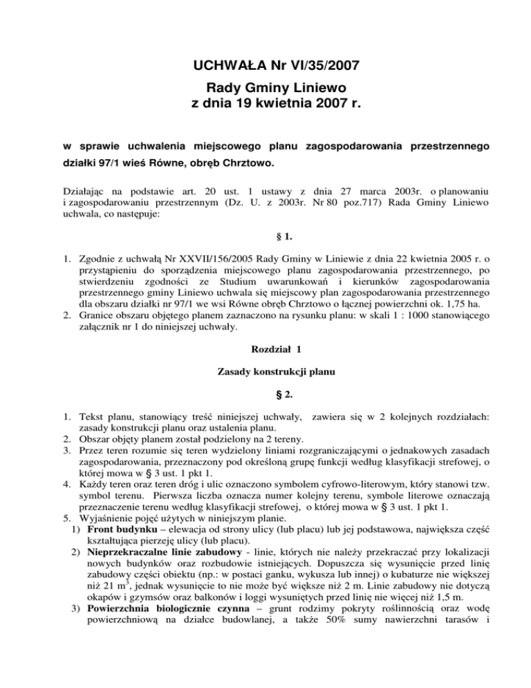 UCHWAŁA Nr VI/35/2007 Rady Gminy Liniewo z dnia 19 kwietnia